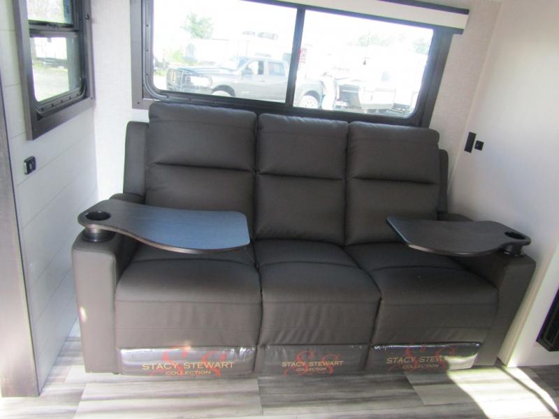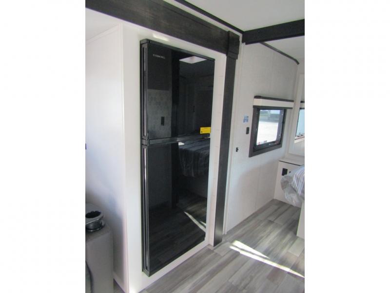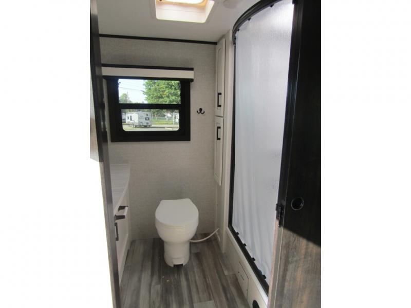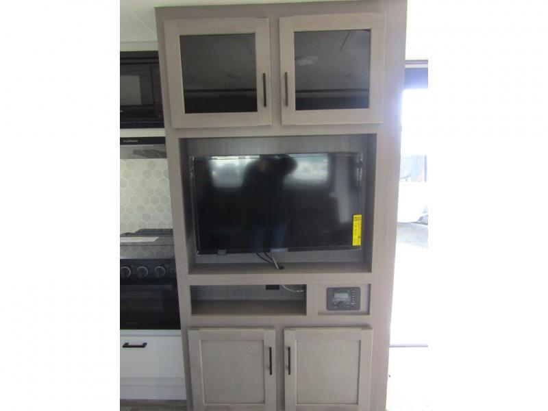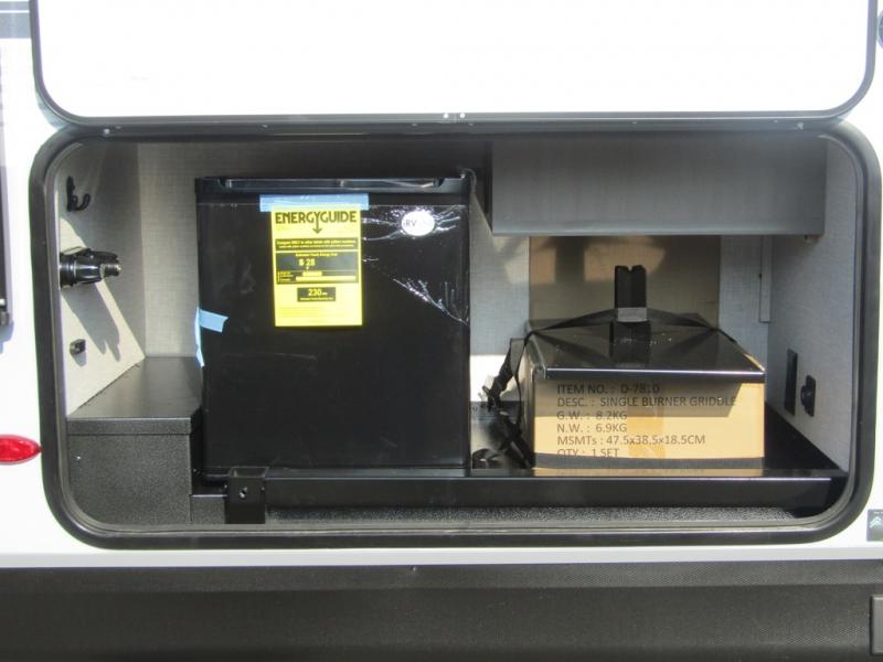 Whether you are a couple or a larger group, this trailer offers a spacious main living and kitchen area as well as rear bathroom for privacy. You will also find linen storage and ample counter space for toiletries. The space savings door even gives you more floor space in both the bathroom and the main area. The single slide holds the U-shaped dinette and refrigerator for even more floor space, the L-shaped kitchen area allows the cook their own space to make meals, and the walk-in pantry is perfect for extra goodies on those longer camping trips. The front bedroom provides privacy as well with its own space saving door, and you can sleep like a queen at night. You can choose a few options if you like such as theater seats in place of the dinette, the Solar Power package, 120V heated tanks pads, and/or an 6 cu. ft. gas/electric refrigerator.