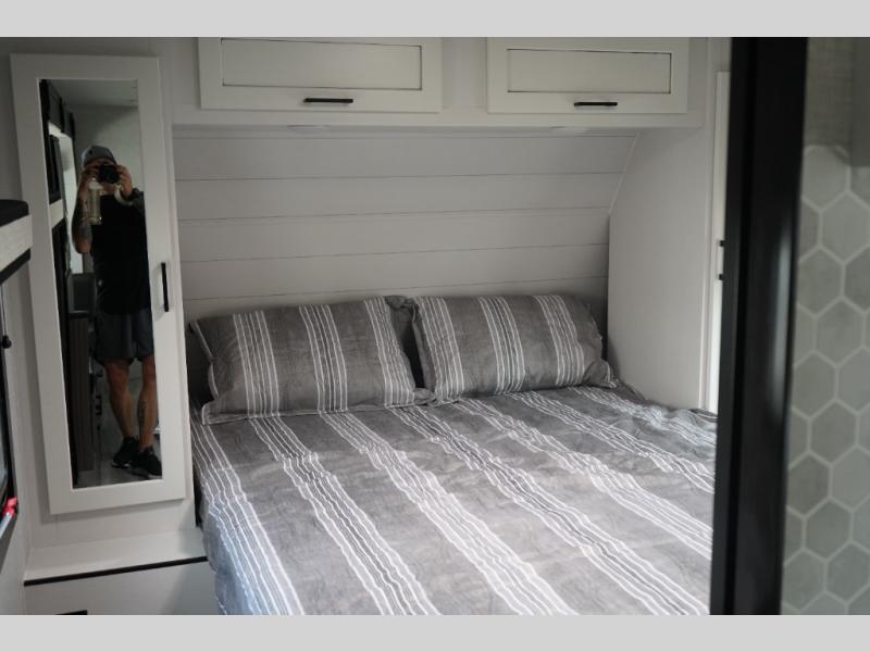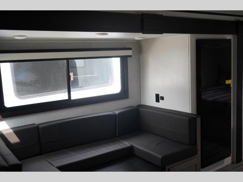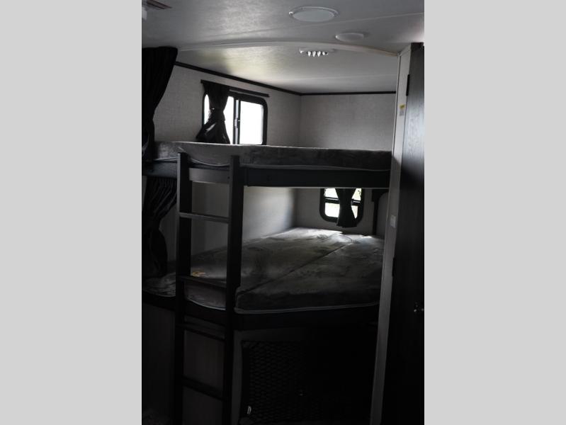 There is so much to love about this trailer from the double-size bunks in the rear with a ladder for easy access, plus the cargo door that allows you to stow larger items from the exterior to the interior underneath the bunks. You also have exterior storage compartments for outdoor gear. And the cook can choose to make meals using the outside kitchen including a refrigerator to store some cold items or the inside kitchen with full amenities including a 10 cu. ft. 12V refrigerator and ample counter space. The walk-in pantry is a nice feature as well especially when you have a big crew. There is a private bedroom up front with a queen bed and dual wardrobes for your things, and any other guests can sleep on the U-shaped dinette in the main living area!