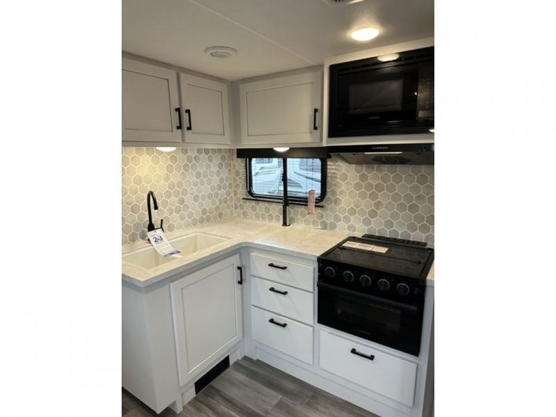 With any Jay Feather travel trailer by Jayco, you will enjoy lightweight towing, convenient exterior amenities, and at-home comforts inside! The Overlander 1 Solar Package included within the Jay Sport Package comes with a 200W solar panel and a 30-amp digital controller so you can enjoy some off-grid camping. There is also a modern graphics package with a dual-colored sidewall, LCI Solid Step fold-down aluminum tread steps on the main entry door, and Climate Shield 0 -100° F tested weather insulation package that will allow you to camp in all sorts of climates. The Customer Value Package will make time outdoors easier than ever with an outside shower, a power tongue jack and a Rock Solid stabilizer system, plus American-made nitro-filled Goodyear tires with self-adjusting electric brakes. More exterior features include a Keyed-Alike locking system, marine grade exterior speakers with blue LED accent lighting, a Magnum Truss roof system, and the list goes on! And we haven't even touched on the interior comforts, like the residential style kitchen countertops and vinyl flooring throughout, decorative backsplash, handcrafted hardwood door/drawer fronts, and multiple USB charging ports to keep you going!