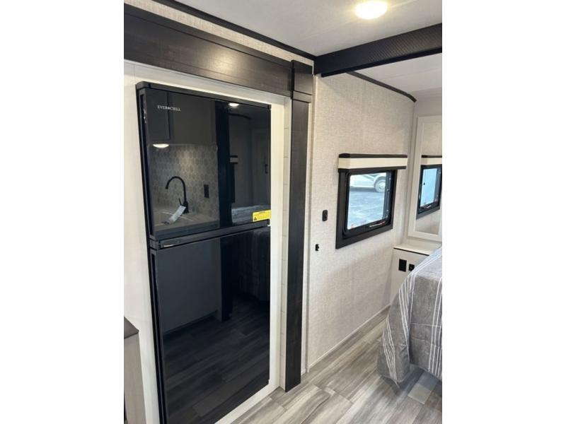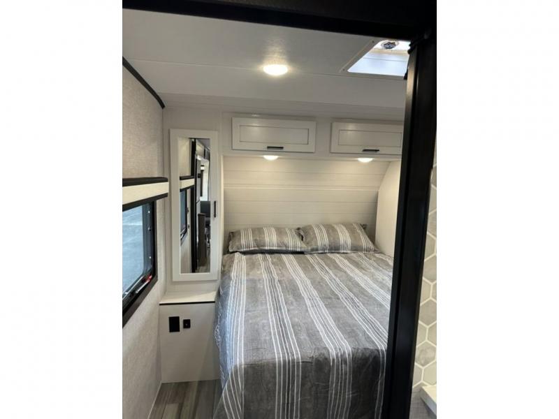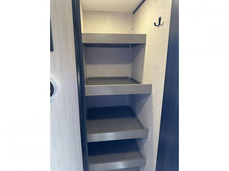There is so much to love about this trailer from the double-size bunks in the rear with a ladder for easy access, plus the cargo door that allows you to stow larger items from the exterior to the interior underneath the bunks. You also have exterior storage compartments for outdoor gear. And the cook can choose to make meals using the outside kitchen including a refrigerator to store some cold items or the inside kitchen with full amenities including a 10 cu. ft. 12V refrigerator and ample counter space. The walk-in pantry is a nice feature as well especially when you have a big crew. There is a private bedroom up front with a queen bed and dual wardrobes for your things, and any other guests can sleep on the U-shaped dinette in the main living area!