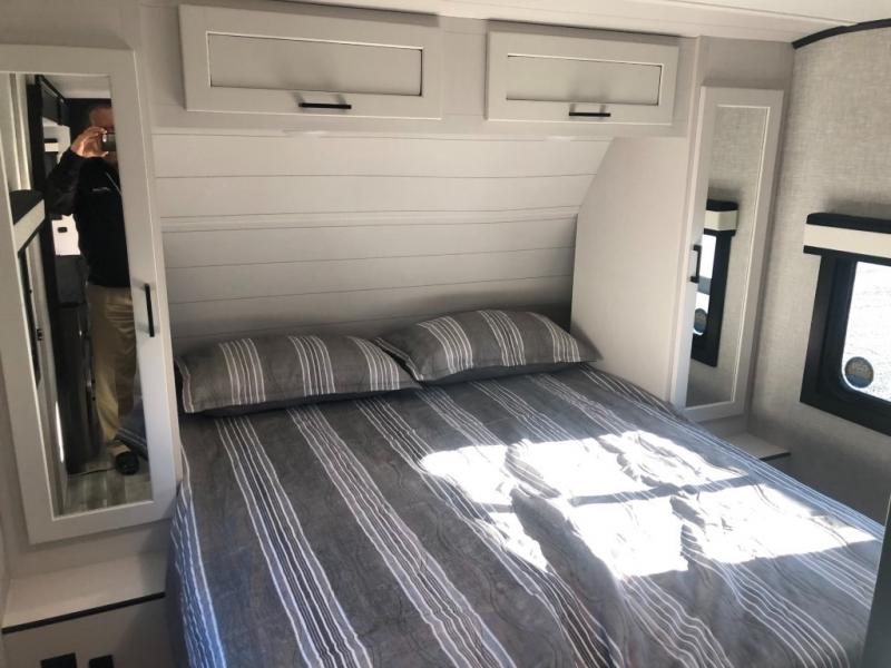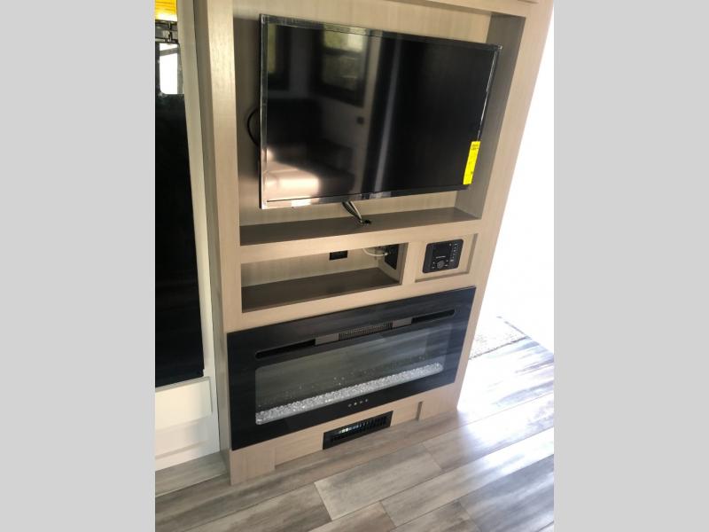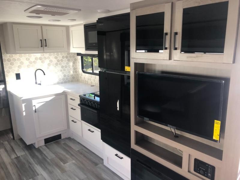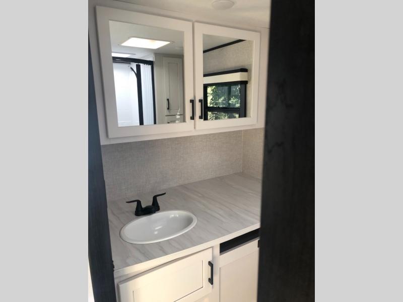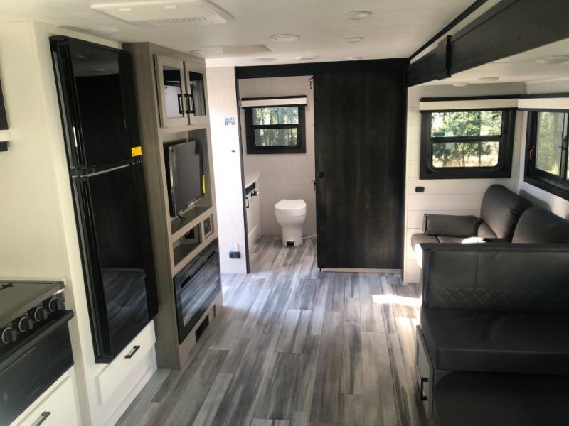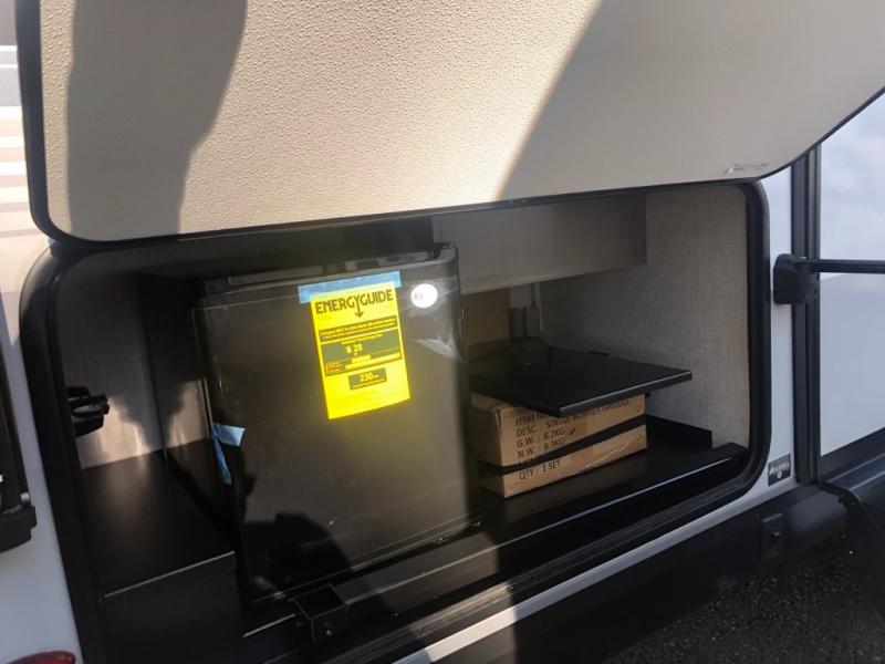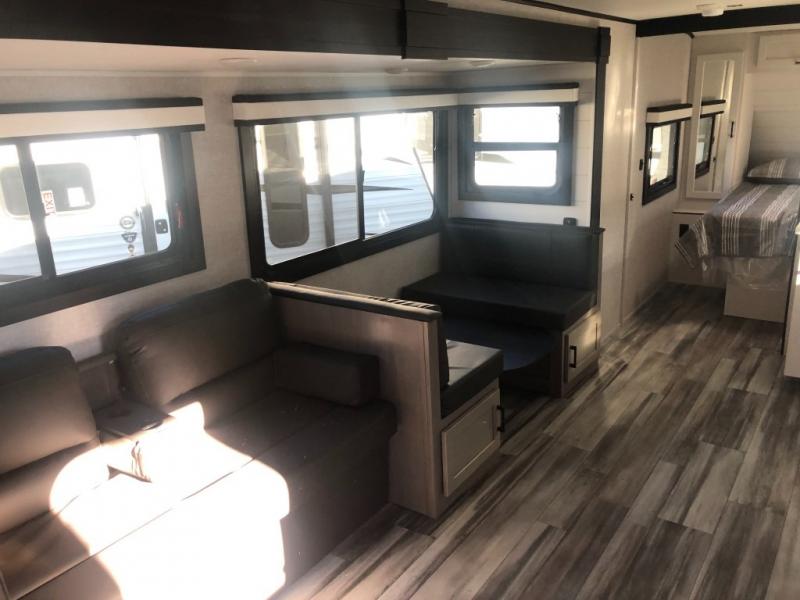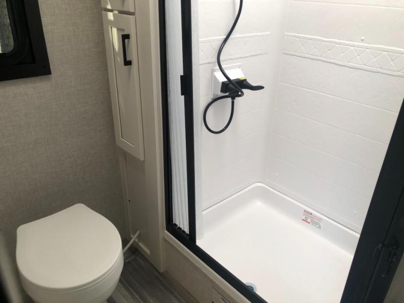 Looking for convenience and privacy in your next RV? Well this full rear bathroom has lots of room for you to move around as you get ready each morning in privacy! The front private bedroom has a walk-around 60" x 75" queen bed with wardrobes on either side to keep your clothes looking their best. You can enjoy home cooked meals while at the campsite thanks to the three burner cooktop and 8 cu. ft. refrigerator, plus there is a walk-in pantry to store all of your favorite snacks. The jackknife sofa and booth dinette within the slide out offer comfortable places to relax, yet you can switch the jackknife sofa out for the optional tri-fold sofa or the optional theater seating. You can even cook breakfast outdoors using the outside kitchen and stay protected from the elements by the 19' power awning!