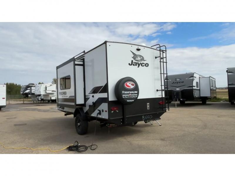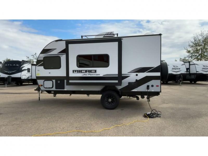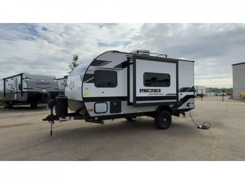 Jayco's lightest travel trailer, the Jay Feather Micro is ready for adventure at the drop of a hat! The Climate Shield weather protection will let you camp well into the colder months and the Stronghold VBL with double-sized Azdel is ultra durable. The Jay Pro Package includes 16-inch American-made Goodyear off-road tires with self-adjusting brakes, a rear-mounted roof ladder, and the Overlander 1 Solar Package with a 200W solar panel. Additional exterior features include marine grade exterior speakers with blue LED accent lighting, a swing-out entry door assist handle, a power tongue jack, and more! Inside, you will love the 4-inch high-density dinette cushions with vinyl backing for easy cleaning, along with the handcrafted hardwood door/drawer fronts, residential style kitchen countertops, and decorative roller shades with a reflective barrier for better insulation.