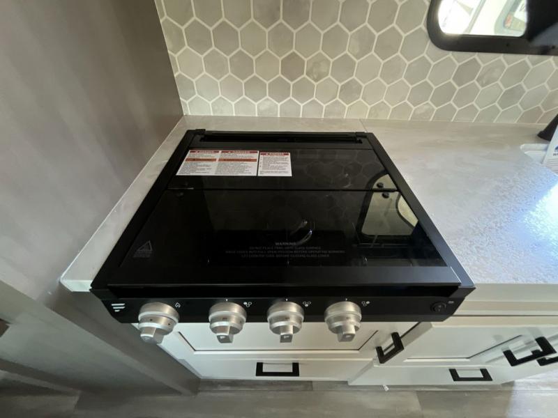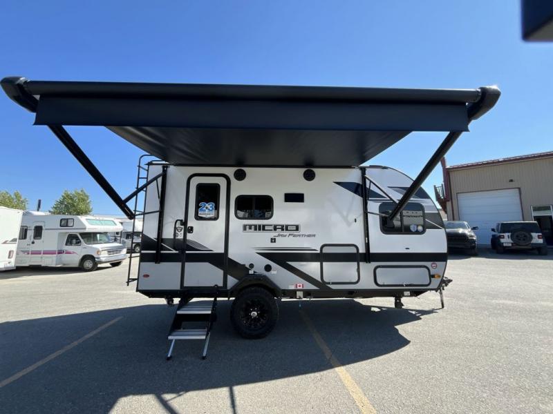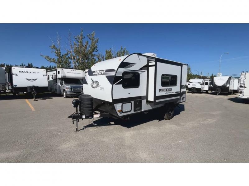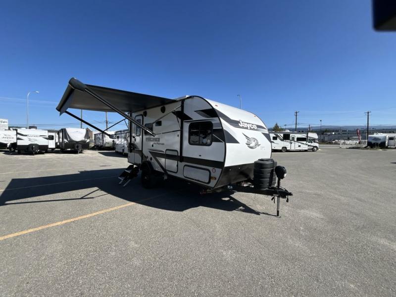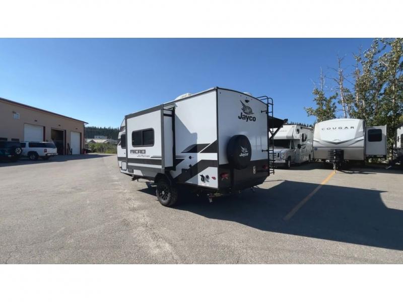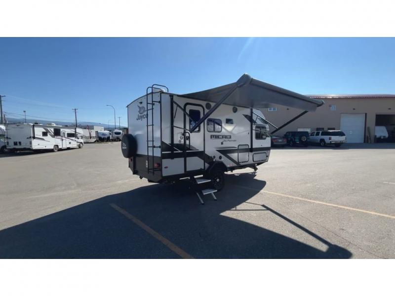 Jayco's lightest travel trailer, the Jay Feather Micro is ready for adventure at the drop of a hat! The Climate Shield weather protection will let you camp well into the colder months and the Stronghold VBL with double-sized Azdel is ultra durable. The Jay Pro Package includes 16-inch American-made Goodyear off-road tires with self-adjusting brakes, a rear-mounted roof ladder, and the Overlander 1 Solar Package with a 200W solar panel. Additional exterior features include marine grade exterior speakers with blue LED accent lighting, a swing-out entry door assist handle, a power tongue jack, and more! Inside, you will love the 4-inch high-density dinette cushions with vinyl backing for easy cleaning, along with the handcrafted hardwood door/drawer fronts, residential style kitchen countertops, and decorative roller shades with a reflective barrier for better insulation.