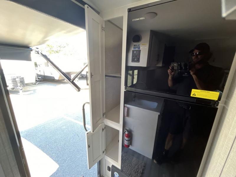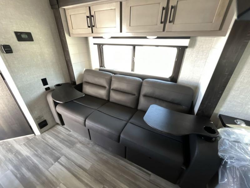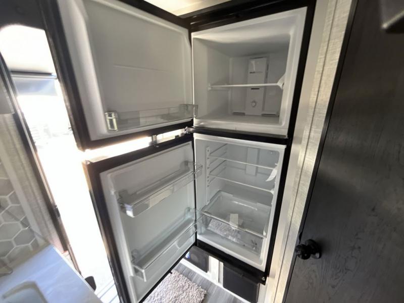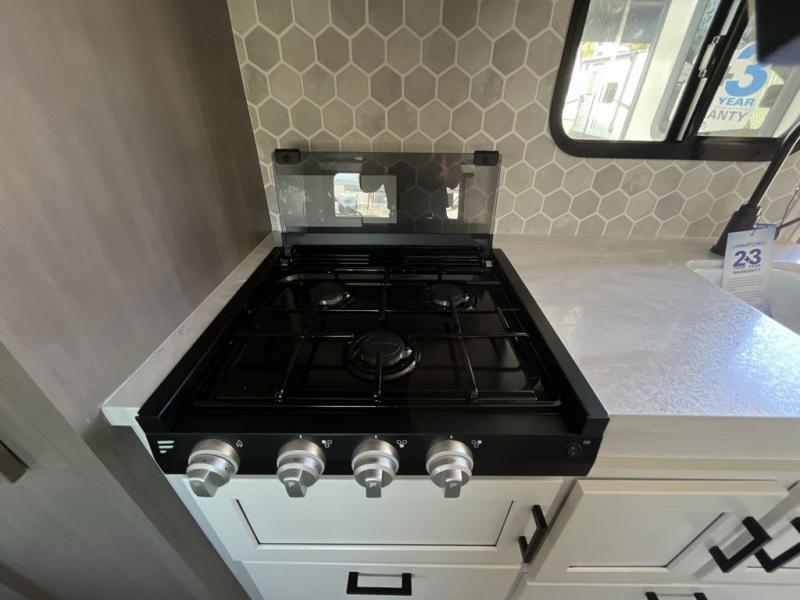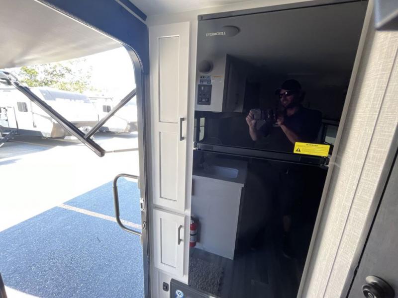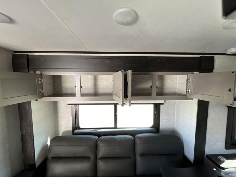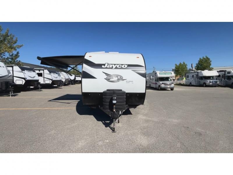 Weekends at the lake are made comfortable in this single slide out travel trailer. You will enjoy your own 54" x 80" front bed so you don't have to sleep on the floor, plus there is a jack-knife sofa if you have an overnight guest. The full bath features a radius shower with a skylight, plus plenty of storage space for your medicines and toiletries. This model includes a microwave oven and a three burner cooktop to prepare meals each day, and an 10 cu. ft. 12V refrigerator for perishables. You will also find an exterior refrigerator for cold drinks, plus an outside griddle for the JayPort system!