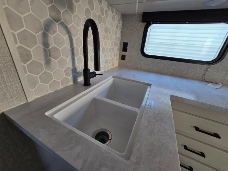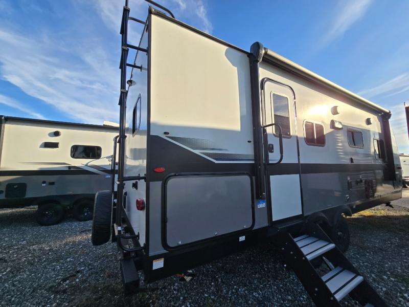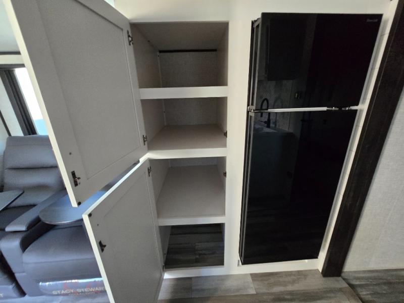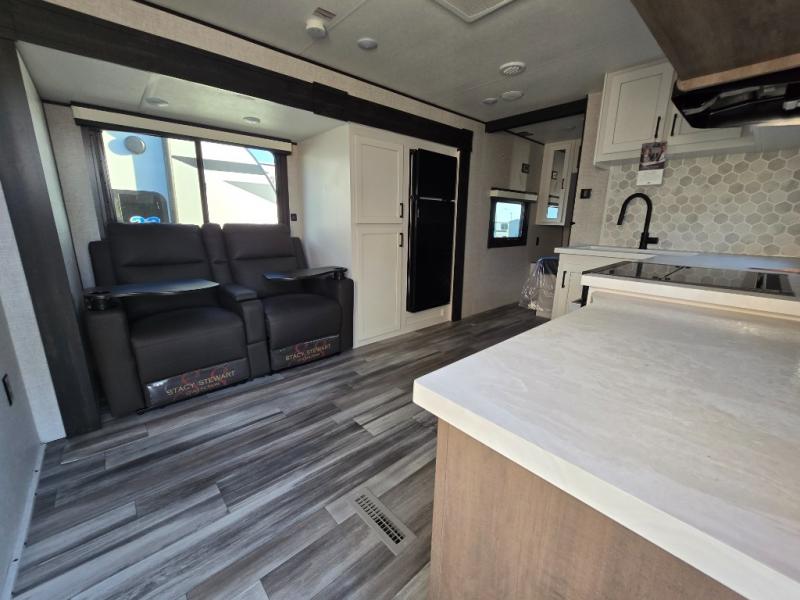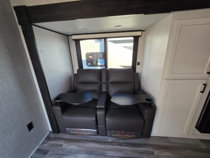 You will feel right at home in this travel trailer! It features a front private bedroom with a 60" x 75" queen bed that has wardrobes on either side and a shelf above to set your books. The kitchen has everything you will need to prepare a delicious home cooked meal including a large pantry to store your favorite snacks. The theater seats are directly across from the entertainment center and can also be switched out for an optional tri-fold sofa. The full rear bathroom has an abundance of room for you to walk around as you get ready each morning. You can grab a jacket on those crisp mornings and head to the outside fridge for a cold beverage in between outdoor games!