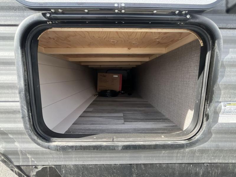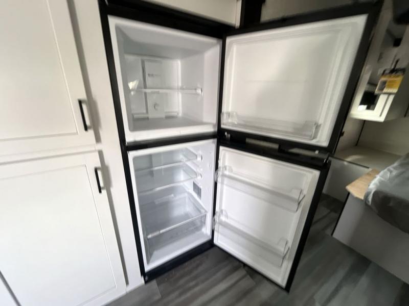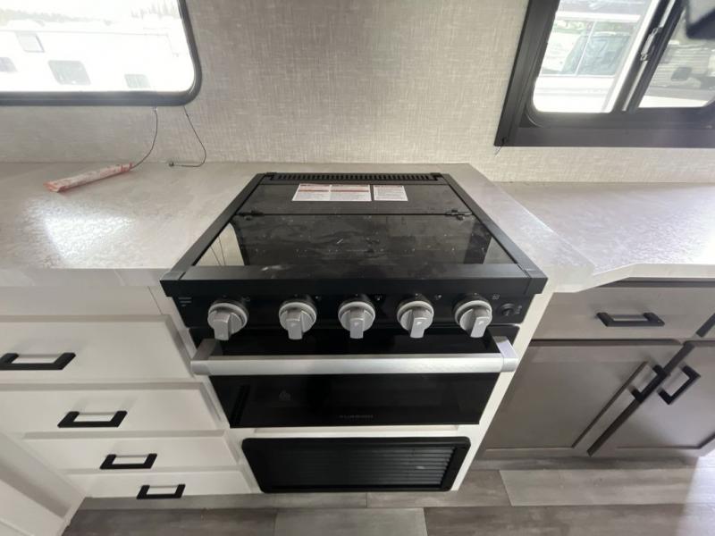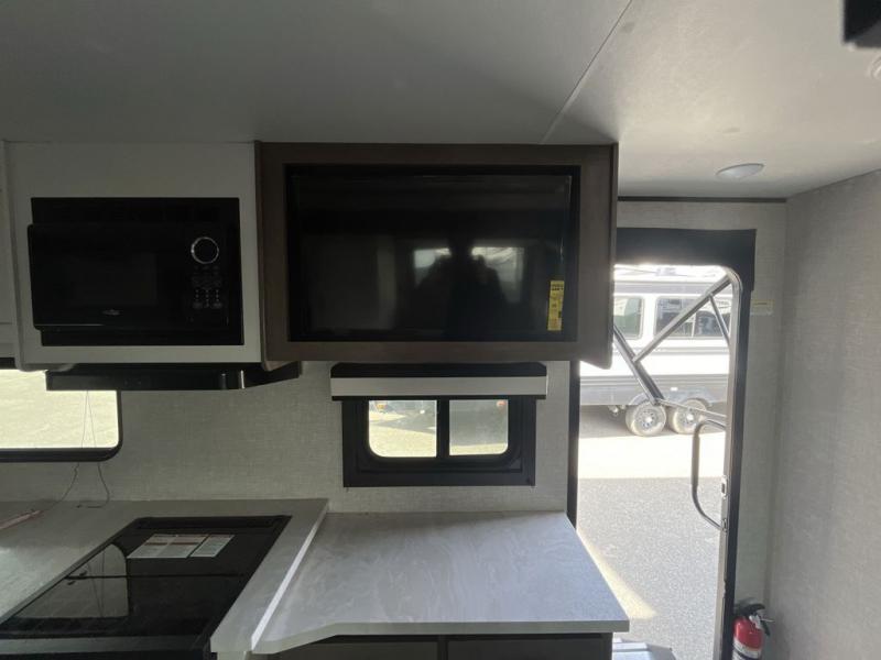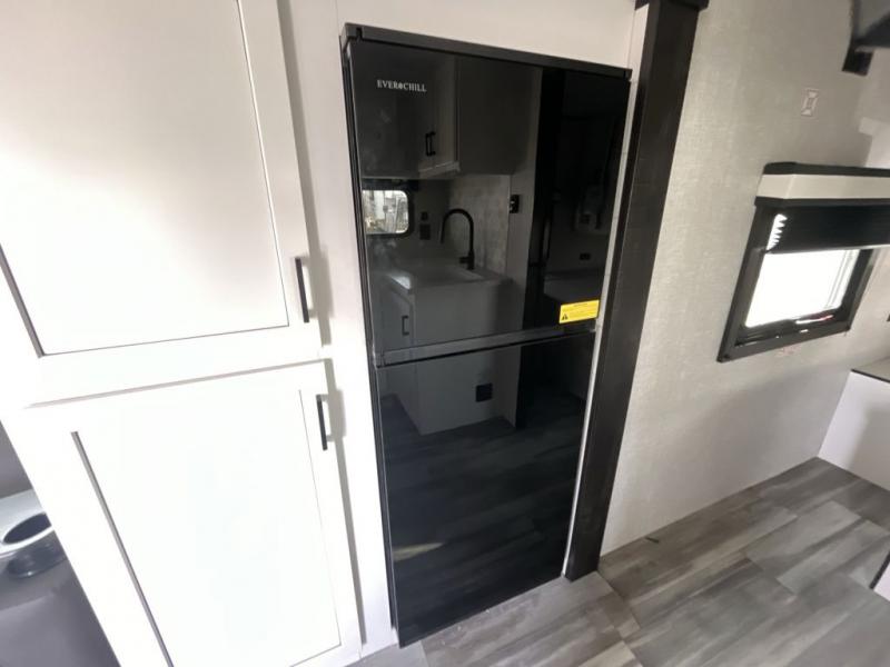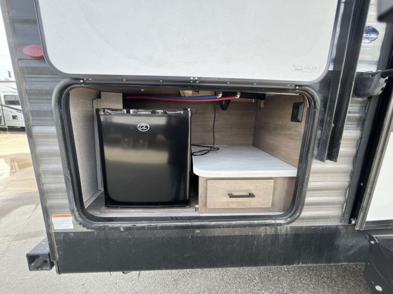 You will feel right at home in this travel trailer! It features a front private bedroom with a 60" x 75" queen bed that has wardrobes on either side and a shelf above to set your books. The kitchen has everything you will need to prepare a delicious home cooked meal including a large pantry to store your favorite snacks. The theater seats are directly across from the entertainment center and can also be switched out for an optional tri-fold sofa. The full rear bathroom has an abundance of room for you to walk around as you get ready each morning. You can grab a jacket on those crisp mornings and head to the outside fridge for a cold beverage in between outdoor games!