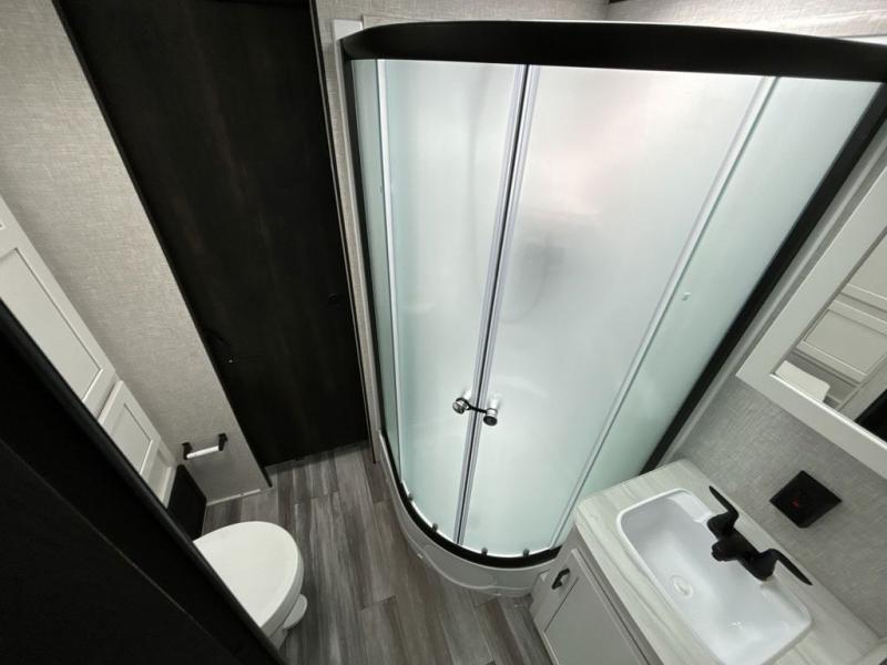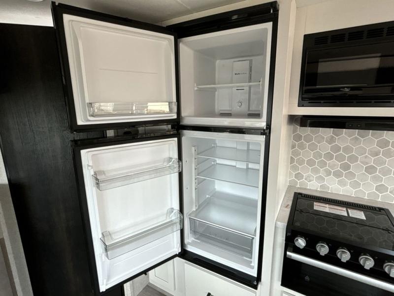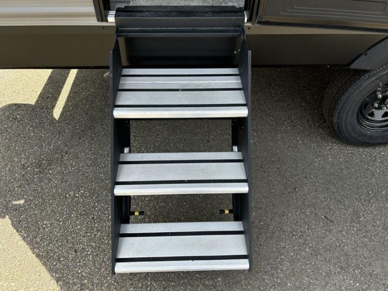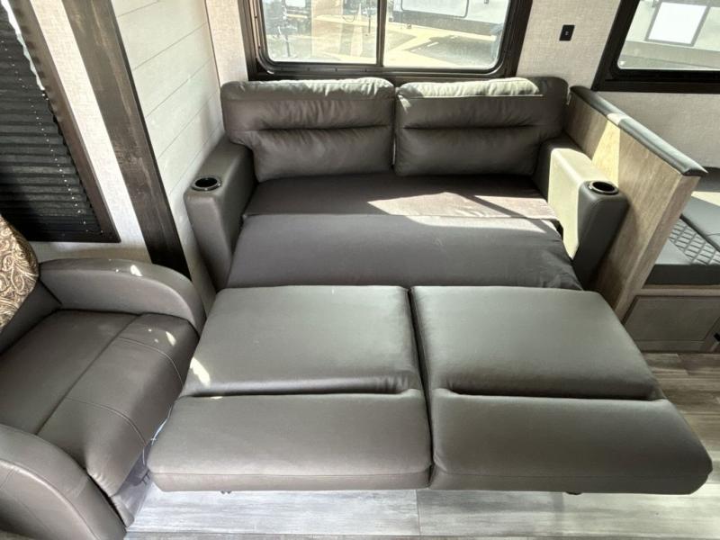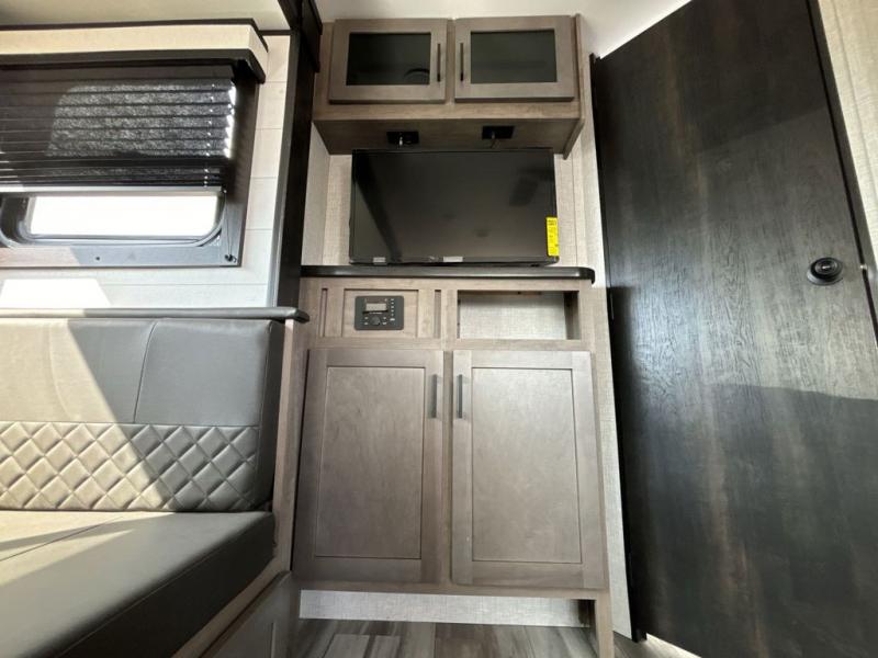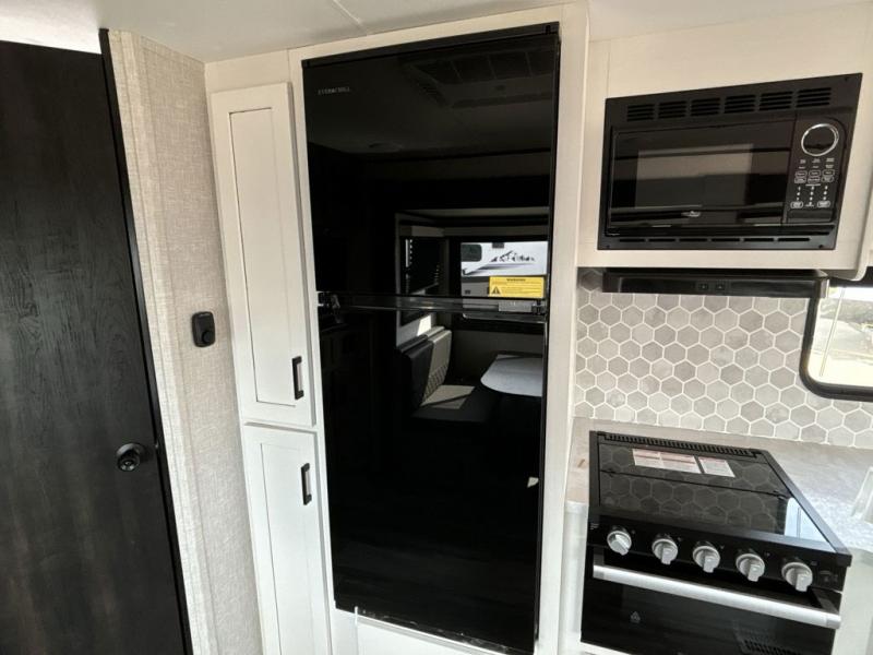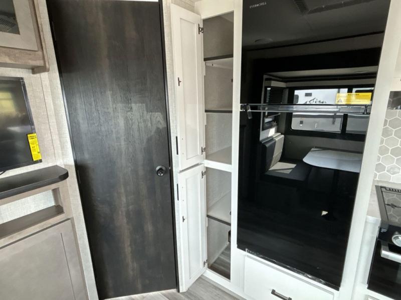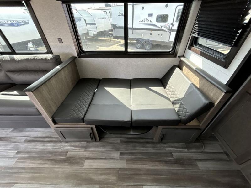 When you want to travel and see new places, this trailer gives you the flexibility to sleep two to four, plus offers a full walk-through bathroom with access from the main area and the front private bedroom. You will also appreciate having a second entry/exit door in the bedroom, a walk-around queen bed, plus dual wardrobes giving you your own side of the bed. The bathroom also has a radius shower and linen storage. The kitchen includes full amenities to make your own meals, and a pantry to keep your dry goods and snacks. You will love the rear swivel rockers with table in between to place your drinks, and the jackknife sofa plus booth dinette offer more seating, sleeping space, and extra floor space since they are within a slide.