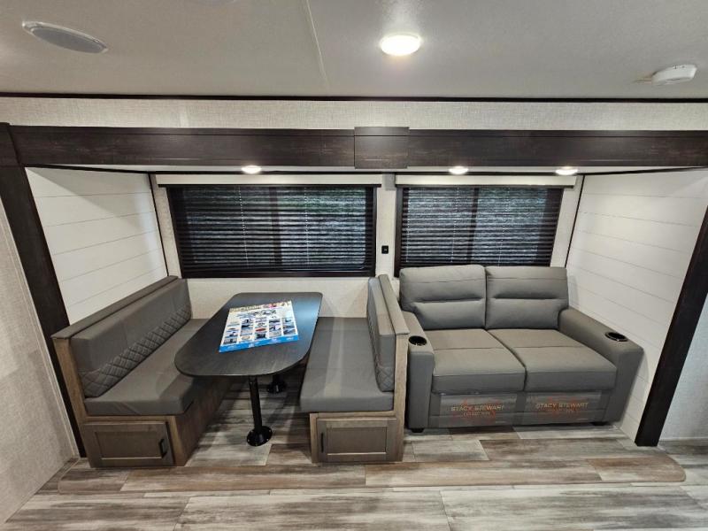 A larger family or group of friends can enjoy camping together in this trailer thanks to the booth dinette and jack-knife sofa slide providing more interior floor space and a place for two or maybe more to sleep at night. And the double size bunks are a fun place to sleep when you need four more spots, plus the privacy curtain will come in handy. The private toilet and tub/shower will keep everyone refreshed and the bathroom sink is just outside the door allowing two people to get ready at one time. The front bedroom offers the owners privacy and there is dual access, two wardrobes and a queen bed to enjoy. The cook will find full amenities indoor, plus there is an outside fridge to have cold beverages outside.