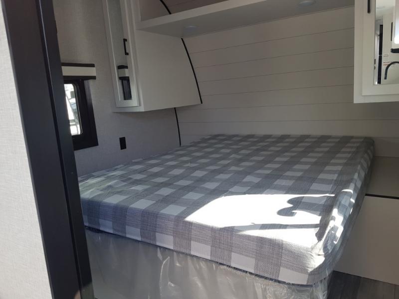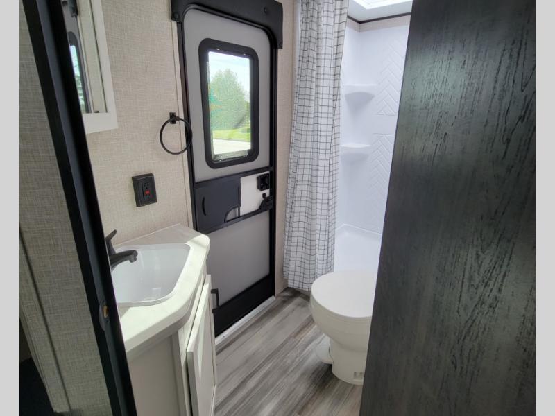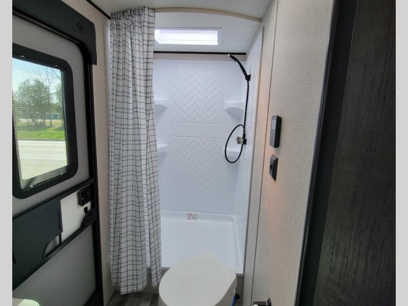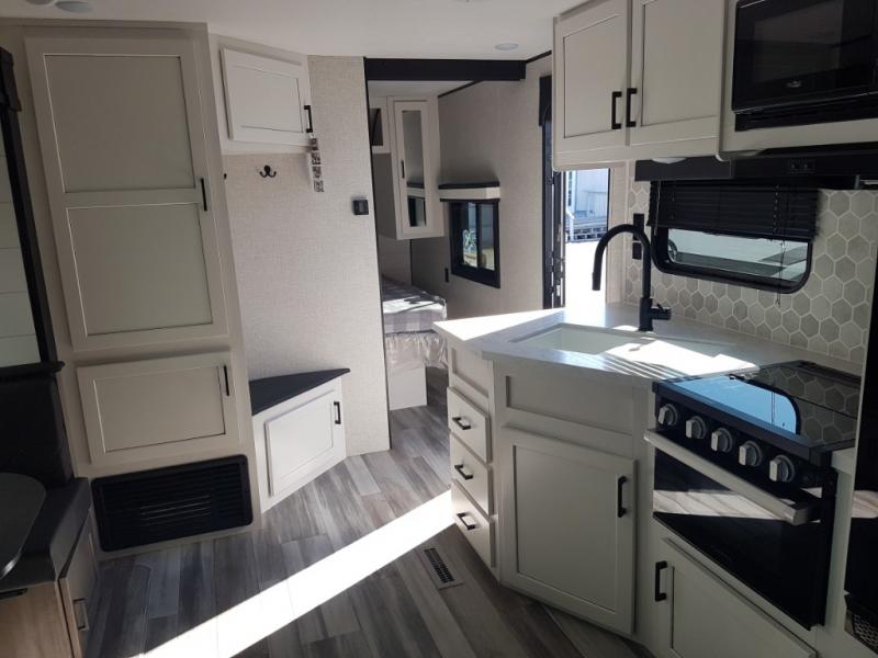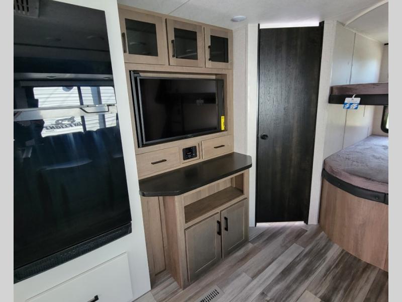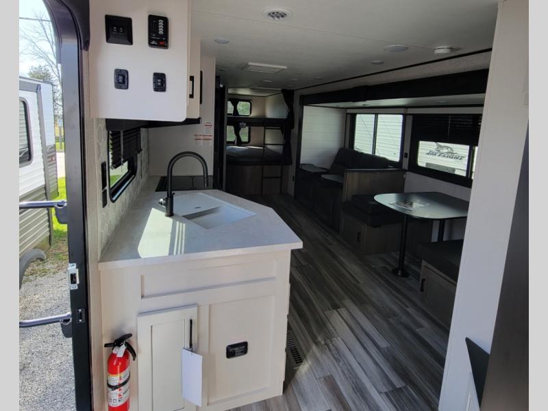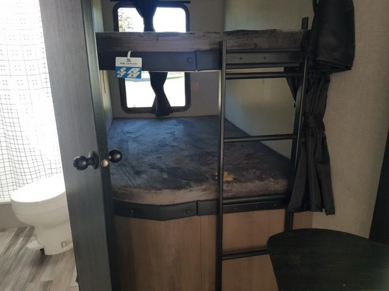 The whole family can get together in this travel trailer! You can sleep on the queen bed in the front private bedroom and the kids can sleep on the 48" x 80" bunk beds with a ladder. The dual entry rear corner bathroom is easy to access even from the outside with one of the dual entry doors to the unit. With a booth dinette and jackknife sofa slide, you will have more walking around space. There is even a bench with storage to keep your shoes out of the way. You also have an outside refrigerator to enjoy a cold beverage without having to go back inside!
