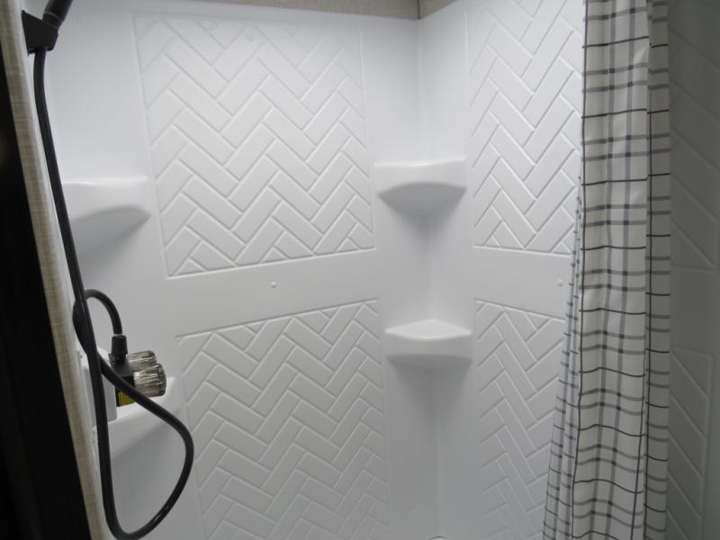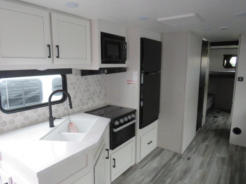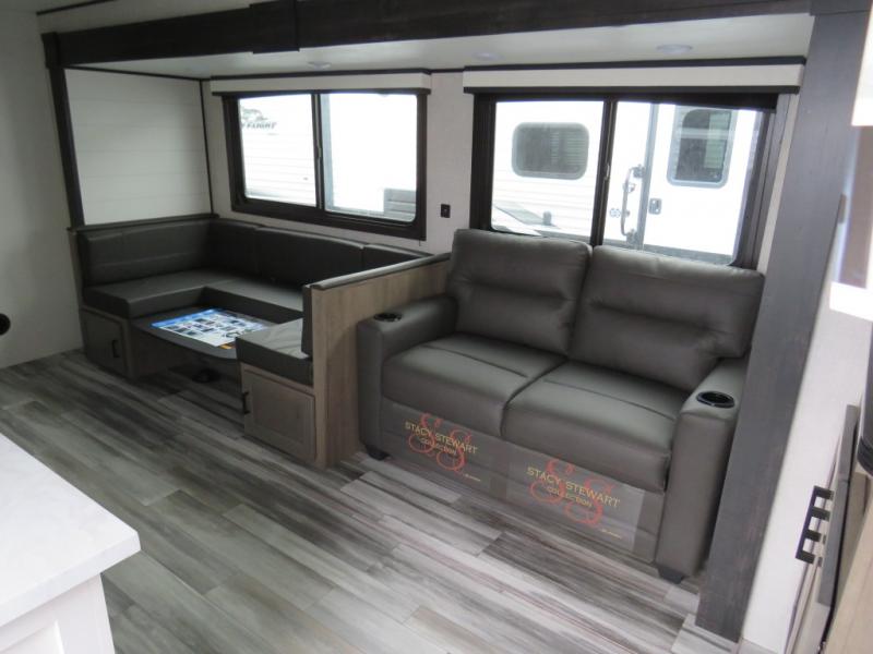 Spacious, accommodating, comfortable... start camping in this trailer that offers something for everyone! The popular bunkhouse offers two 31" x 60" bunk beds above a convertible sofa with 60" x 75" queen mattress, a wardrobe, and a cargo door for easy access. The kitchen provides full amenities to make delicious home cooked meals. The U-shaped dinette and jackknife sofa slide give you more floor space to stretch out and provide extra sleeping space, plus you will appreciate the bench/storage as you walk into the trailer. And the large pantry will hold all the goodies for the big group. The front bedroom gives you a 60" x 75" queen bed to sleep on, dual wardrobes and an overhead shelf to place your clothing and things, plus a space saving door to close for privacy.