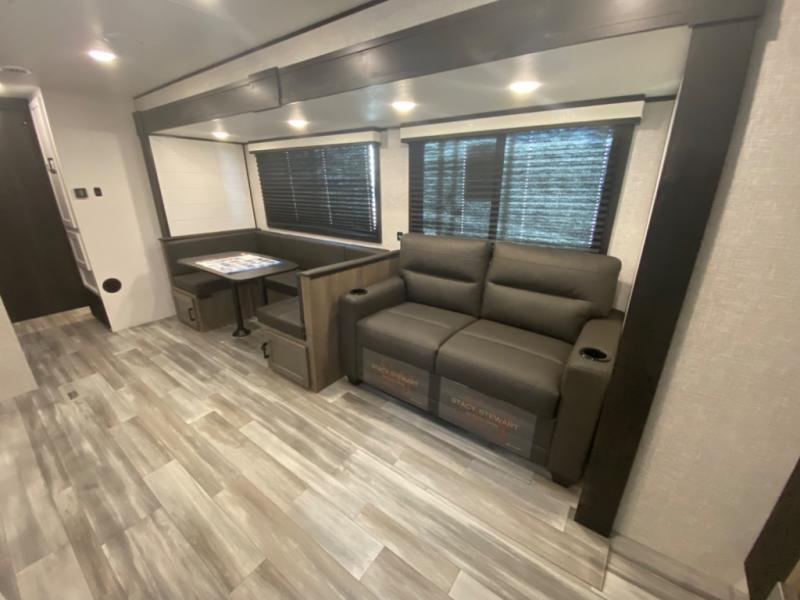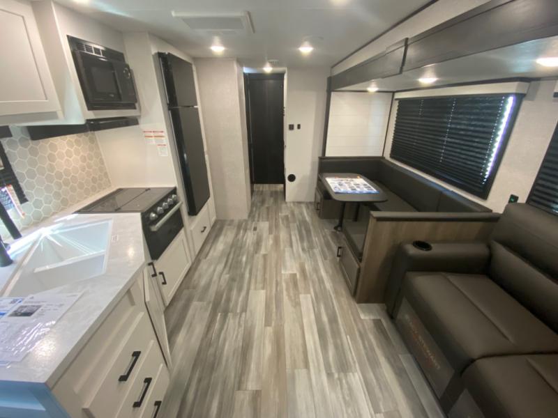 Get ready for a whole lot of memories being made when you have this trailer at the campgrounds! From the kids telling stories at night while they sleep on the three bunks and the booth dinette in the rear bunkhouse to you relaxing on the jackknife sofa and U-shaped dinette. Both furnishings offer more sleeping space when the whole family joins you. And the slide out gives you more floor space! The full bathroom has an interior and exterior entry for convenience, and the inside kitchen offers full amenities while the outside kitchen gives you more choices when cooking for everyone. You will also appreciate privacy in the front bedroom with dual access, two wardrobes and windows for views of the scenery.