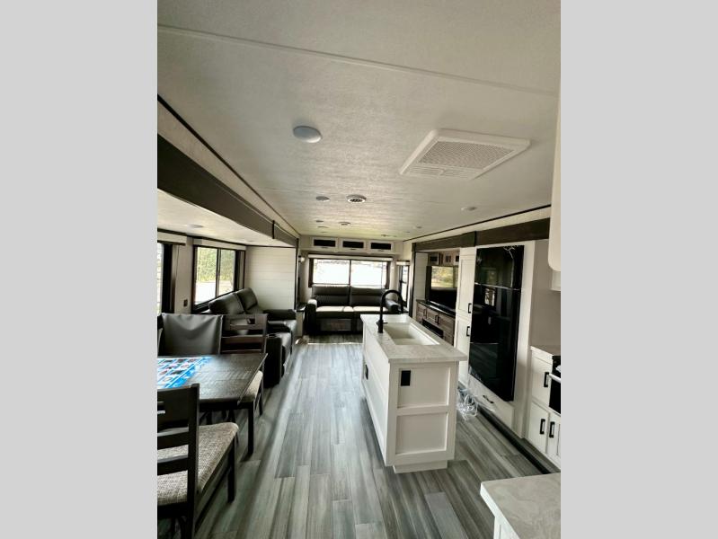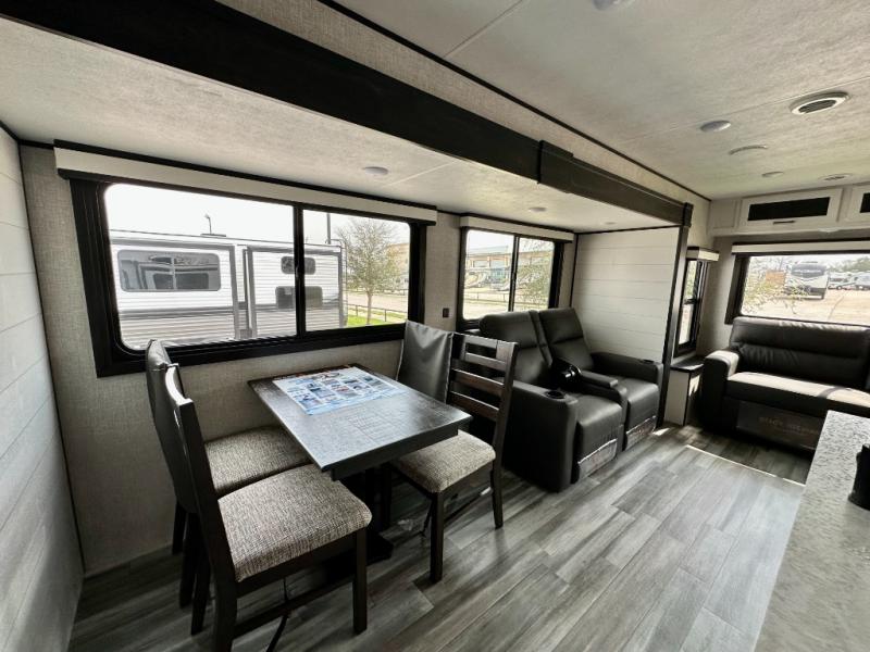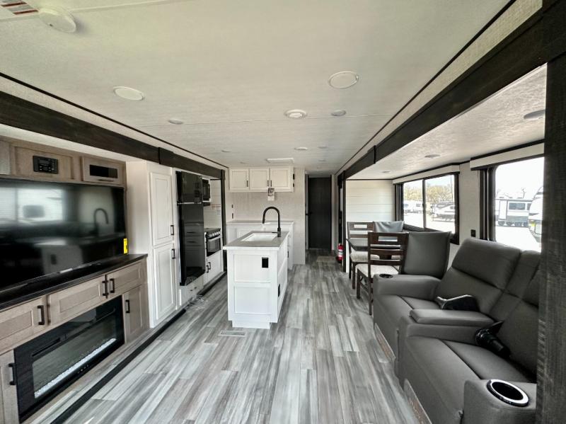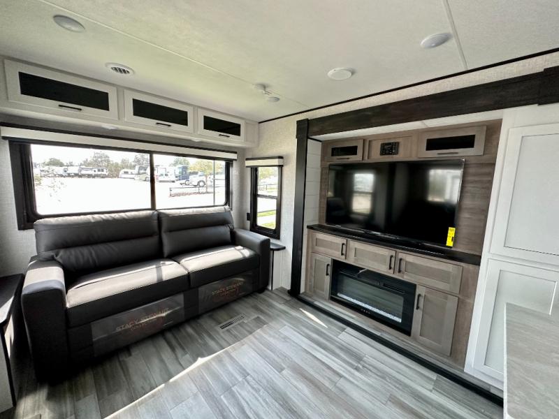 Enjoy a relaxing weekend getaway in this travel trailer! The dual entry bathroom with radius shower creates a front master suite with a queen bed slide, a dresser, and a front large wardrobe with storage space next to it that is prepped to add an optional washer and dryer. The chef will have an easy time preparing their best home cooked meals with the kitchen island, hutch, three burner cooktop, and 12V refrigerator. Enjoy your meals at the booth dinette then play a card game or transform it into an extra sleeping space. The rear living area has a rear jackknife sofa for a quick afternoon nap and theater seating across from the entertainment center with a fireplace for the perfect spot on movie night!