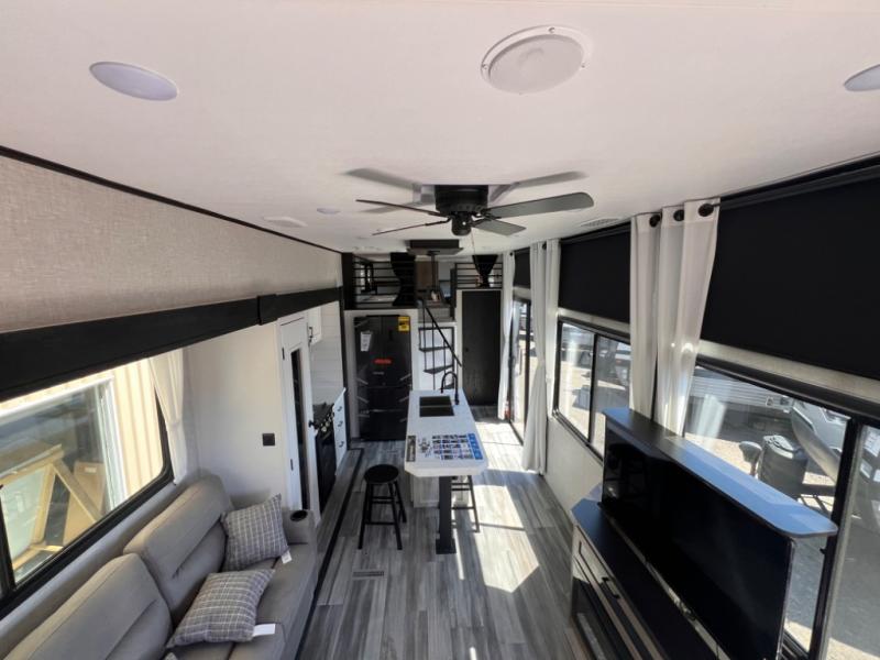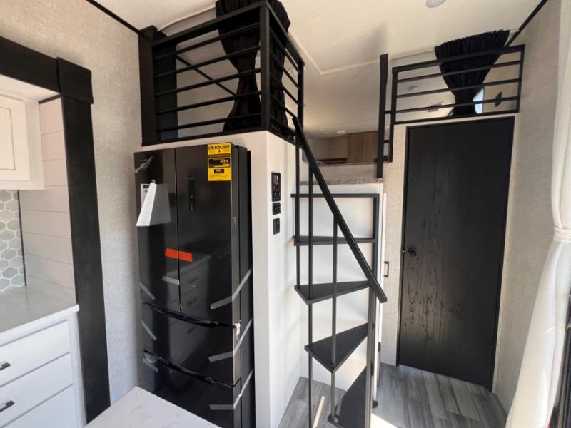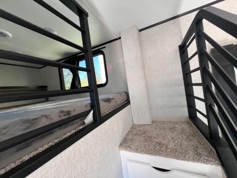 Your family will enjoy inviting extended family or friends along camping with this Jay Flight Bungalow featuring dual loft space, plus a sectional sofa with a hide-a-bed and the front private queen bed for you! Enjoy the patio door entry in the main combined kitchen and living area, then a second side entry just outside the full rear bath and straight in front of the steps leading to the rear loft space that includes a 60" x 68" bunk mat and a 32" x 48" bunk mat. The rear bath offers a walk-in shower, washer/dryer prep and a nice size vanity with plenty of counter space as well as a linen cabinet for your towels. The kitchen is fully equipped with a center island including four bar stools, and the sectional sofa offers plenty of seating for relaxing inside. A spiral staircase leading to the upper loft in front which features two 38" x 73" bunk mats and a 38" by 40" bunk mat perfect for a little one your furry friend. The front private bedroom offers a queen bed slide for added floor space, a dresser and wardrobe, plus a bench with storage beneath along the front wall.