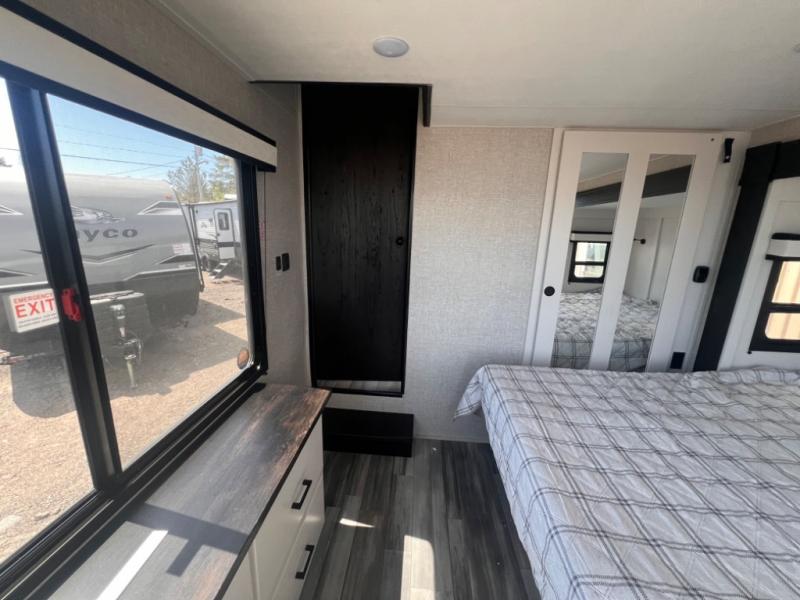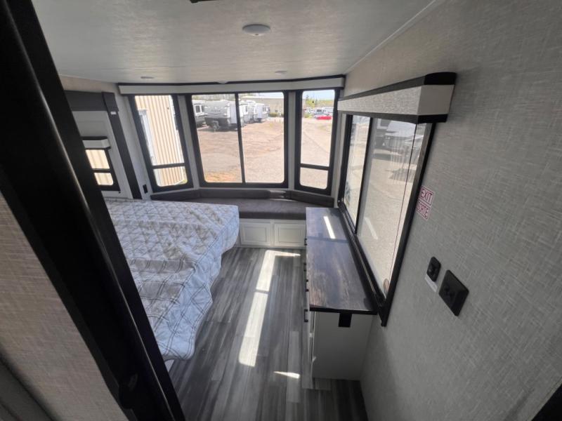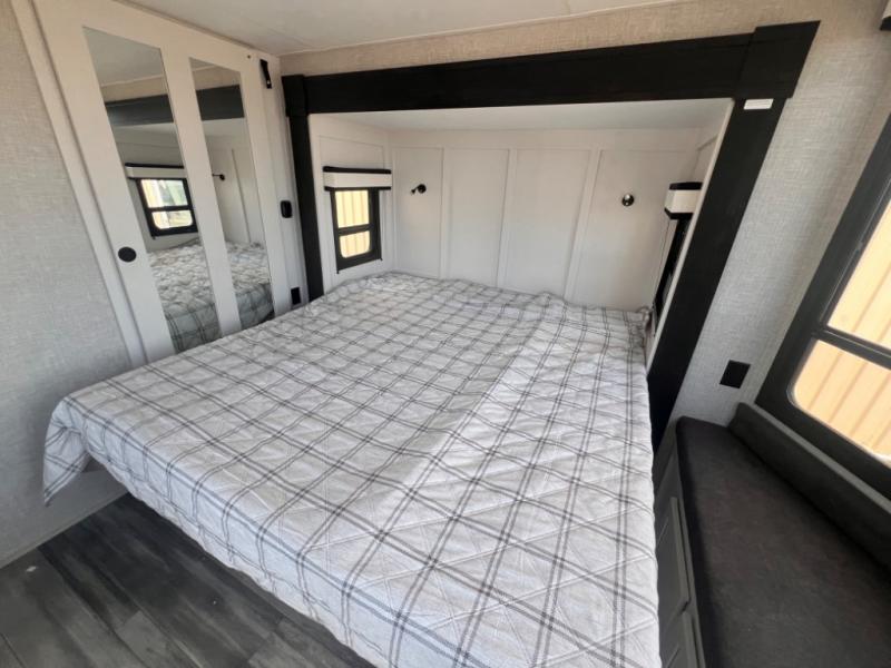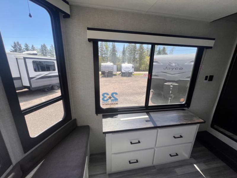 Each Jay Flight Bungalow travel trailer by Jayco features a Magnum Truss roof system, an 8' 6" wide-body construction, and an insulated and enclosed underbelly for added protection against the elements. You will love the open living space and the atrium-style front wall, along with oversized side windows and hardwood look vinyl flooring. A central vacuum with a push button retract makes cleaning and hose storage easier than ever, and the three burner Insignia gas range and 30" microwave will complete the chef's dream kitchen. These travel trailers also include an AM/FM/Bluetooth stereo and marine grade exterior speakers, a power awning with an LED light, an outside shower, plus many more exterior conveniences!
