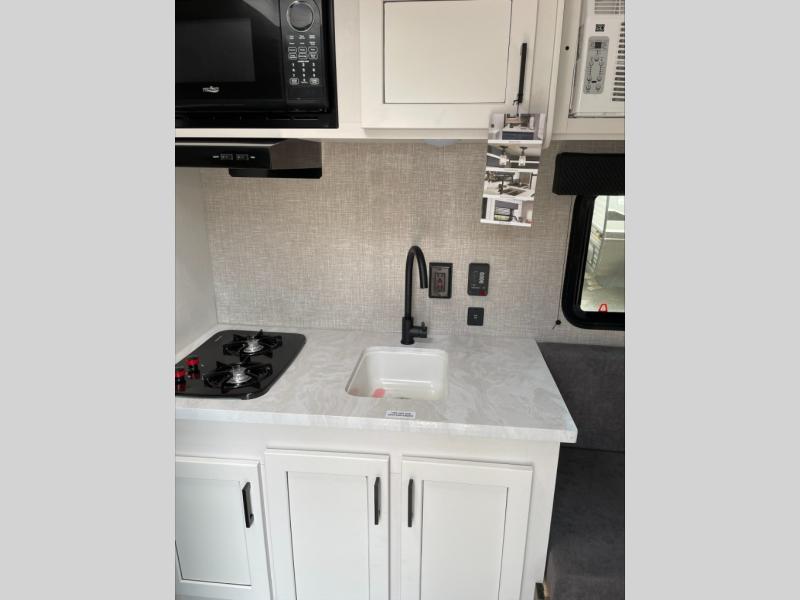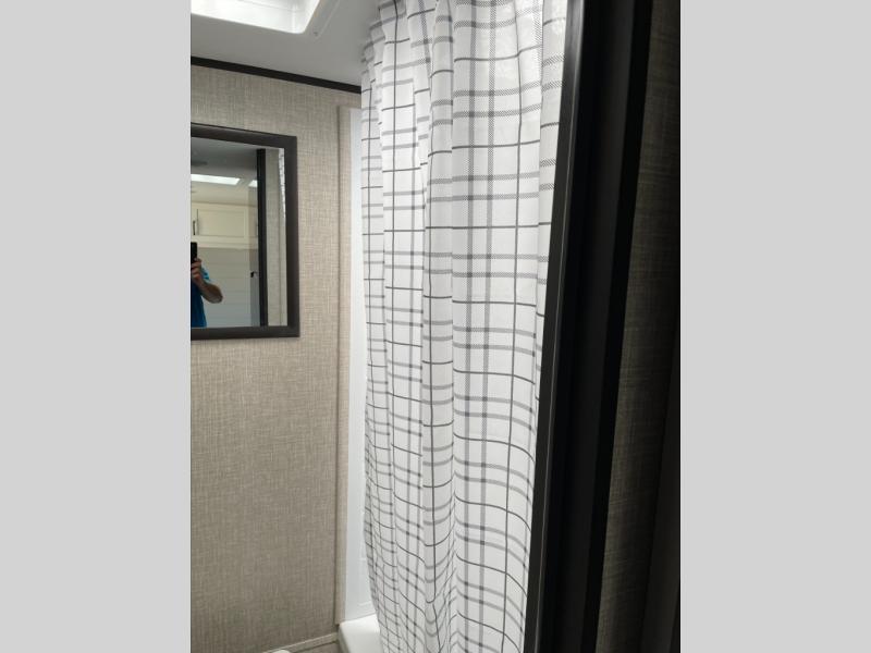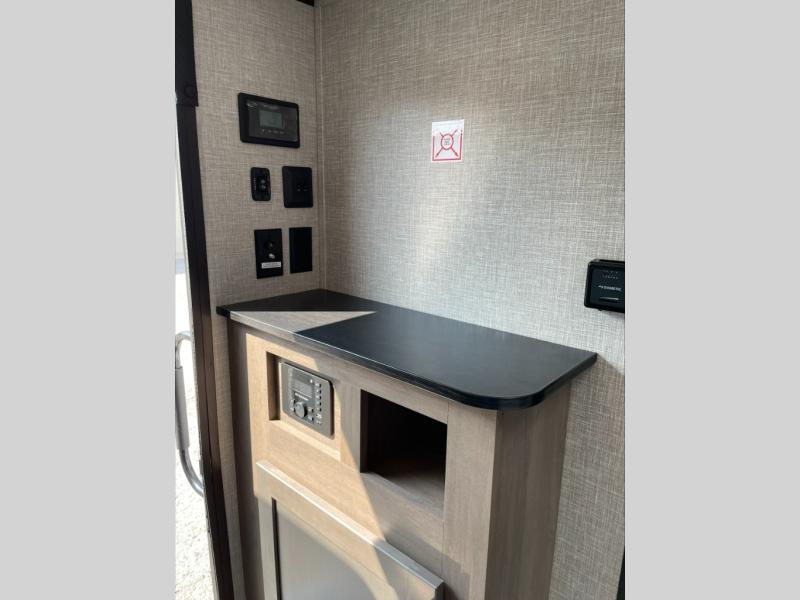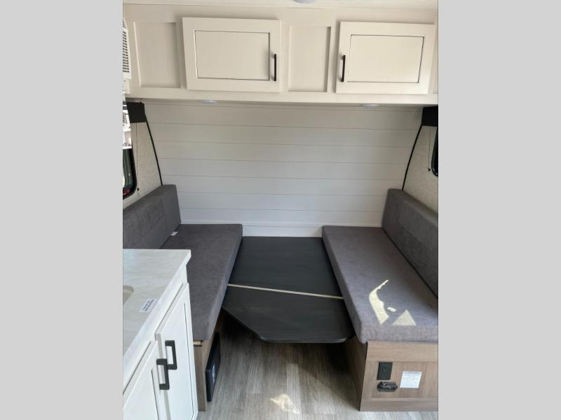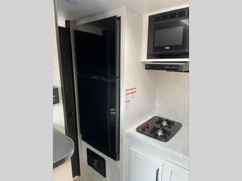 You can spend more time enjoying your surroundings and less time hassling with your RV when you take this Jay Flight SLX travel trailer out to the campsite! There is a set of 29" x 75" bunk beds that will allow you to sleep two people without taking up extra floor space, and the booth dinette can transition from a table into a bed in order to accommodate one or two more. The private bathroom includes a tub/shower and toilet so that you don't even need to use the campsite's facilities. An 8 cu. ft. 12V refrigerator will store all of your fresh items, and the two-burner range will help you turn those items into a full meal. As soon as you enter this trailer, there is a wardrobe to your left, so you can keep some belongings easily accessible.