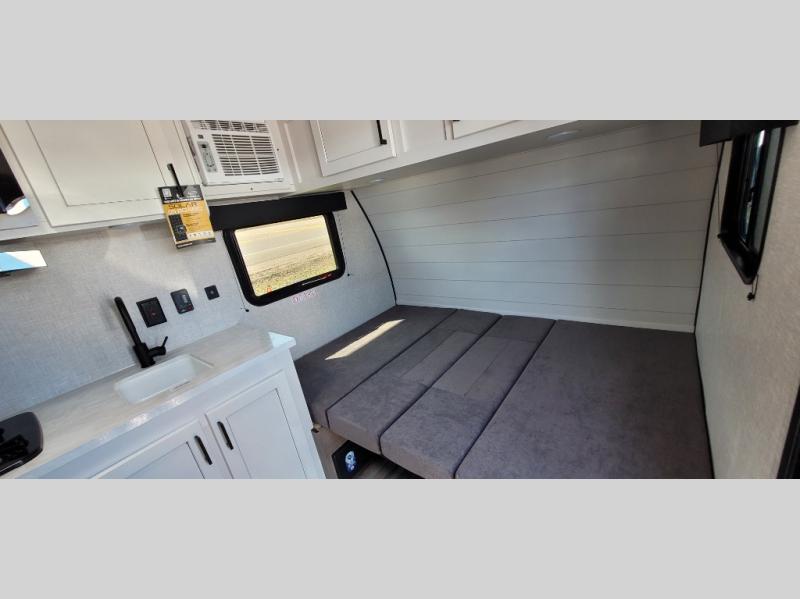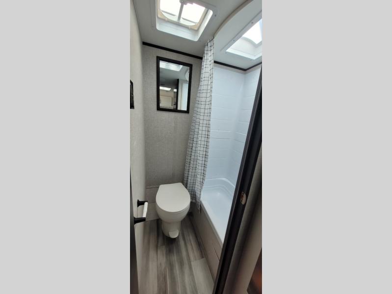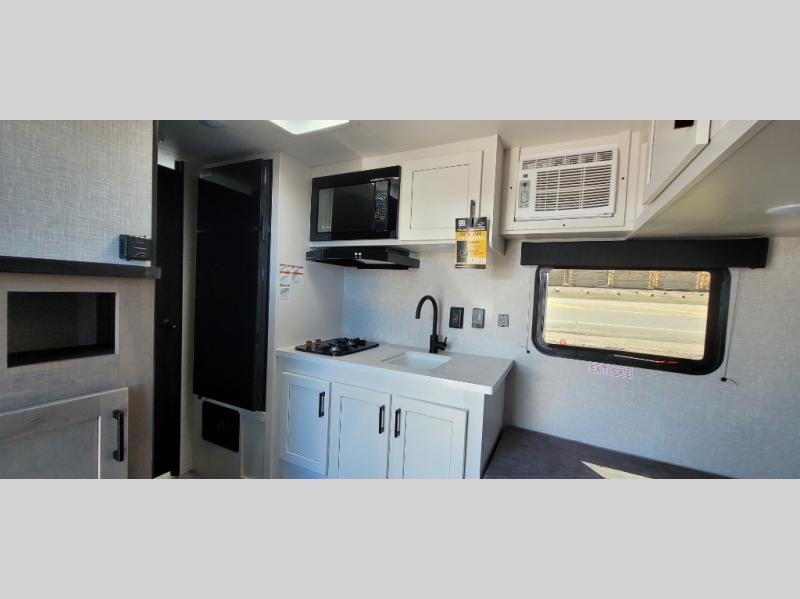 You can spend more time enjoying your surroundings and less time hassling with your RV when you take this Jay Flight SLX travel trailer out to the campsite! There is a set of 29" x 75" bunk beds that will allow you to sleep two people without taking up extra floor space, and the booth dinette can transition from a table into a bed in order to accommodate one or two more. The private bathroom includes a tub/shower and toilet so that you don't even need to use the campsite's facilities. An 8 cu. ft. 12V refrigerator will store all of your fresh items, and the two-burner range will help you turn those items into a full meal. As soon as you enter this trailer, there is a wardrobe to your left, so you can keep some belongings easily accessible.