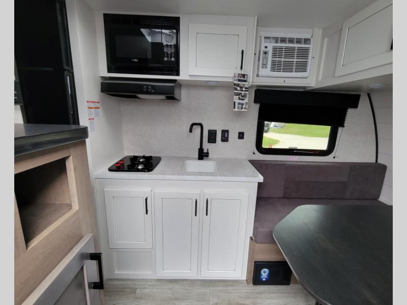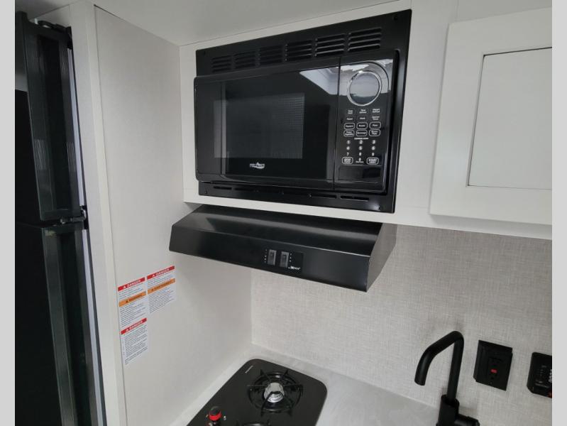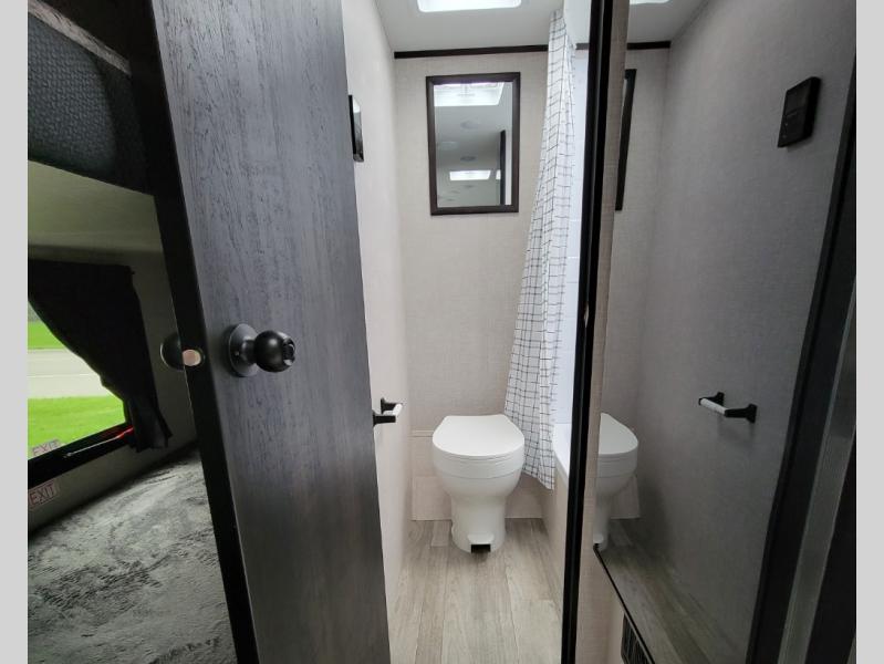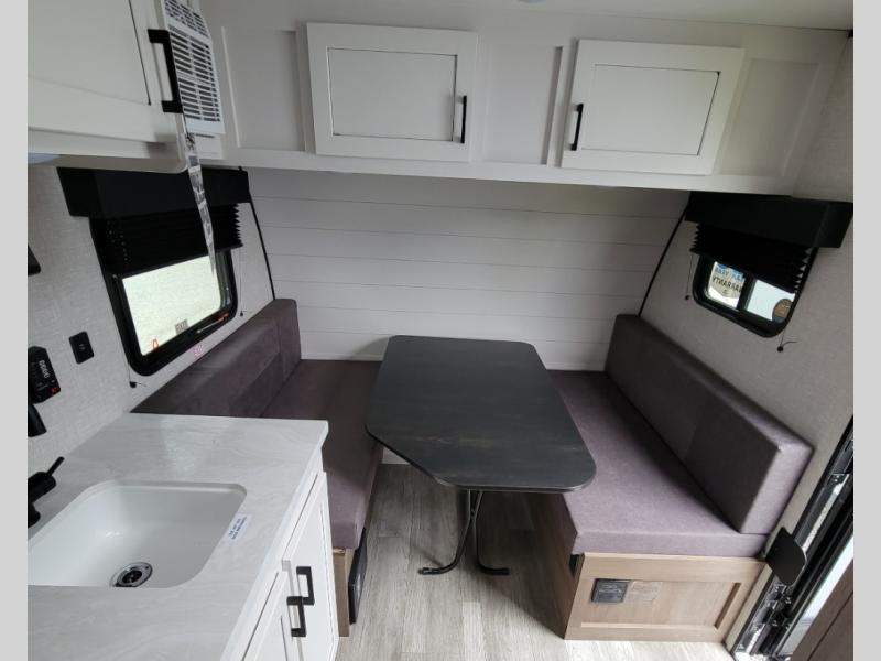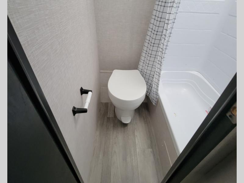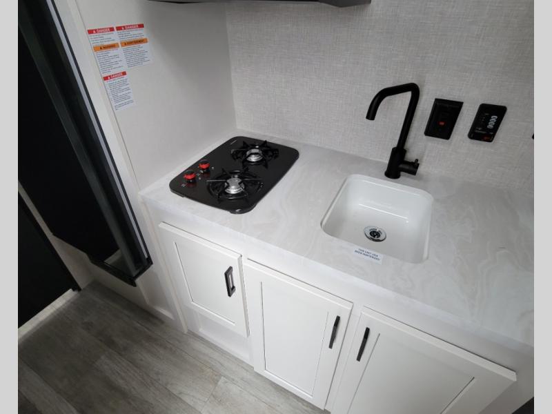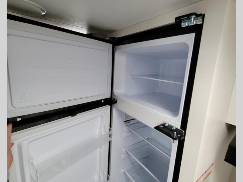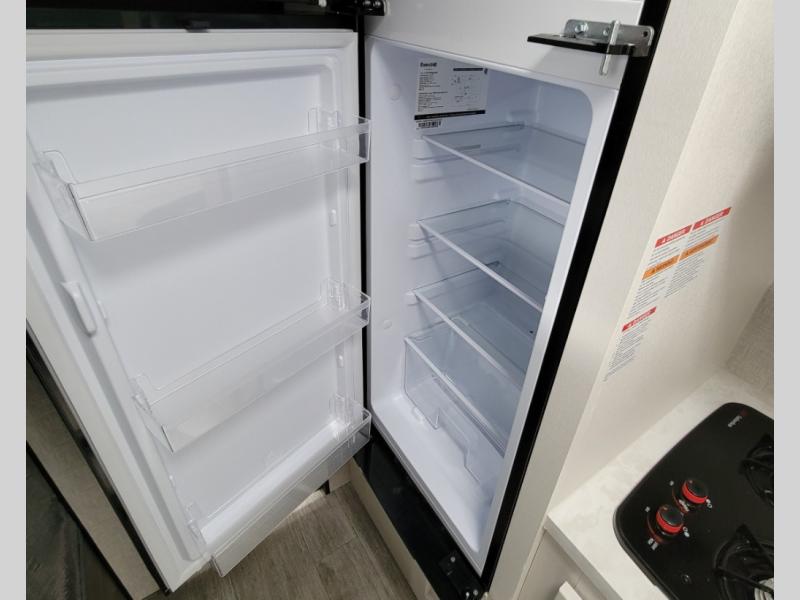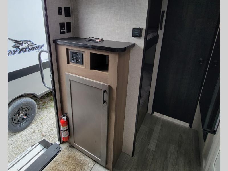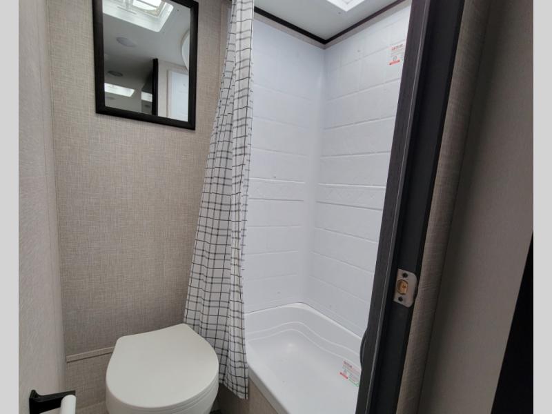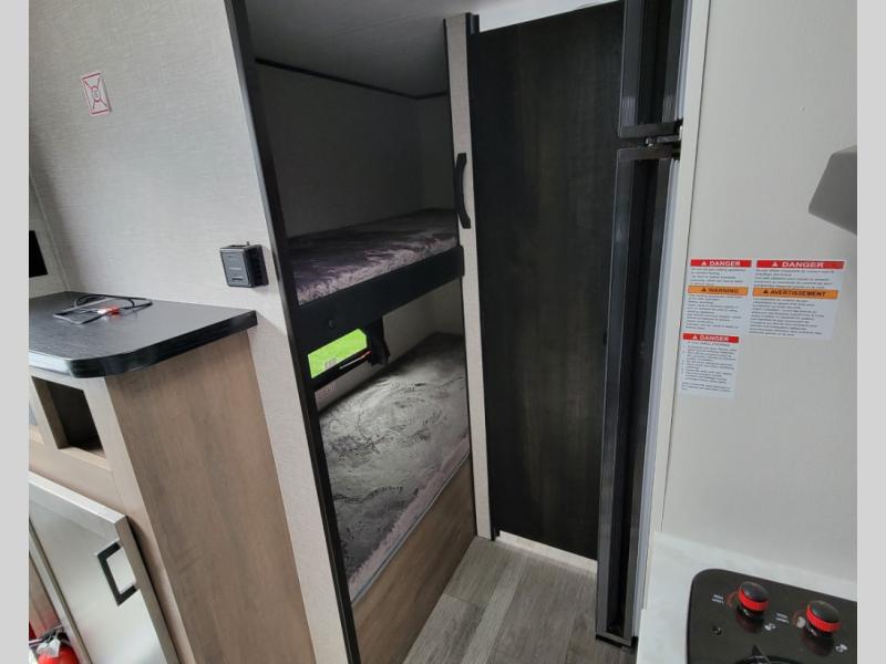 You can spend more time enjoying your surroundings and less time hassling with your RV when you take this Jay Flight SLX travel trailer out to the campsite! There is a set of 29" x 75" bunk beds that will allow you to sleep two people without taking up extra floor space, and the booth dinette can transition from a table into a bed in order to accommodate one or two more. The private bathroom includes a tub/shower and toilet so that you don't even need to use the campsite's facilities. An 8 cu. ft. 12V refrigerator will store all of your fresh items, and the two-burner range will help you turn those items into a full meal. As soon as you enter this trailer, there is a wardrobe to your left, so you can keep some belongings easily accessible.
