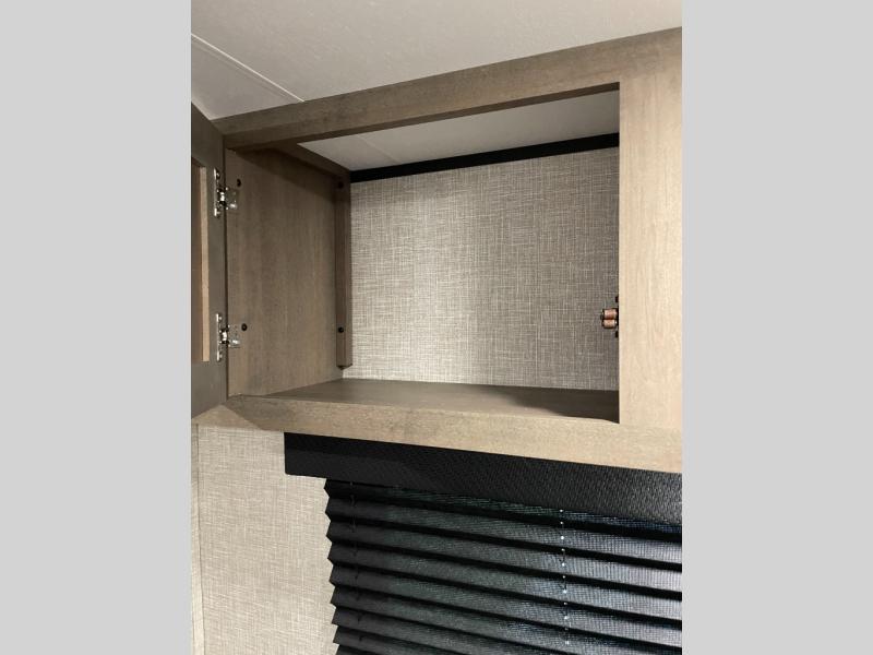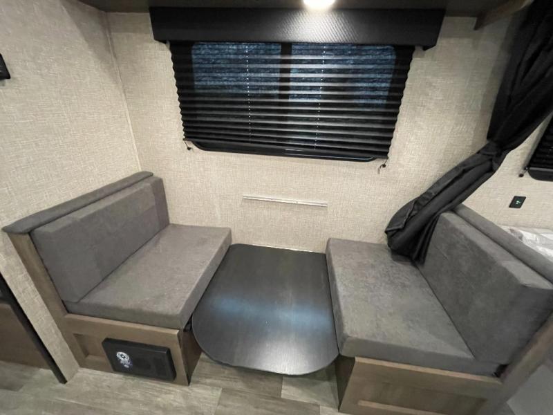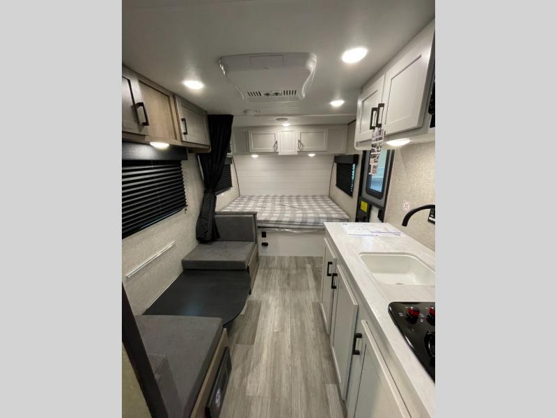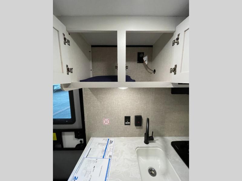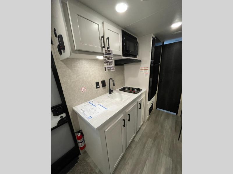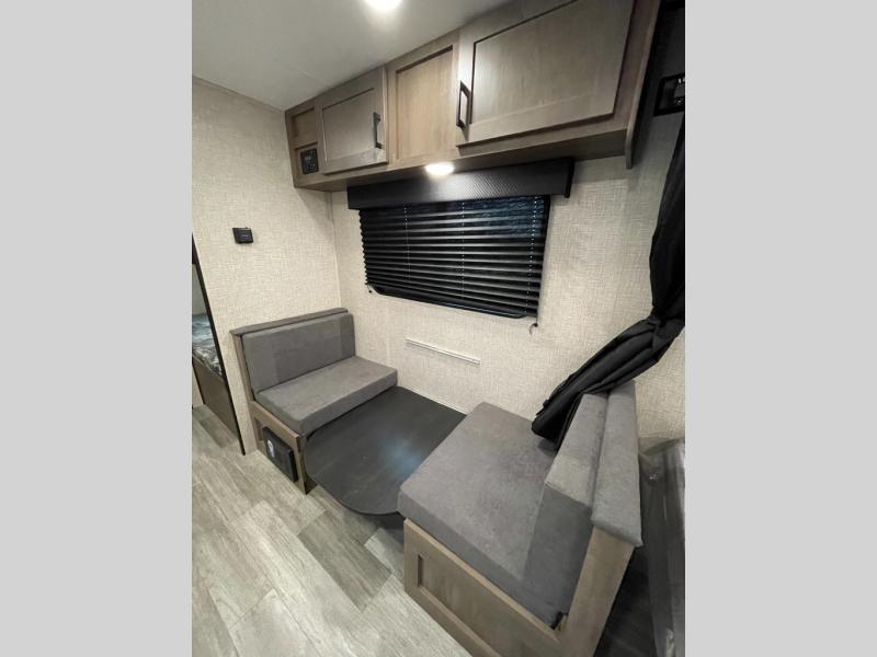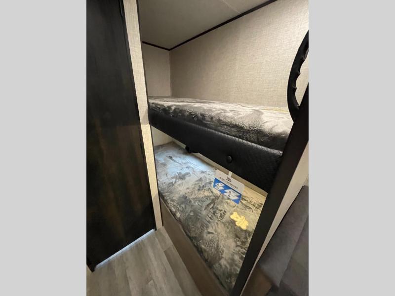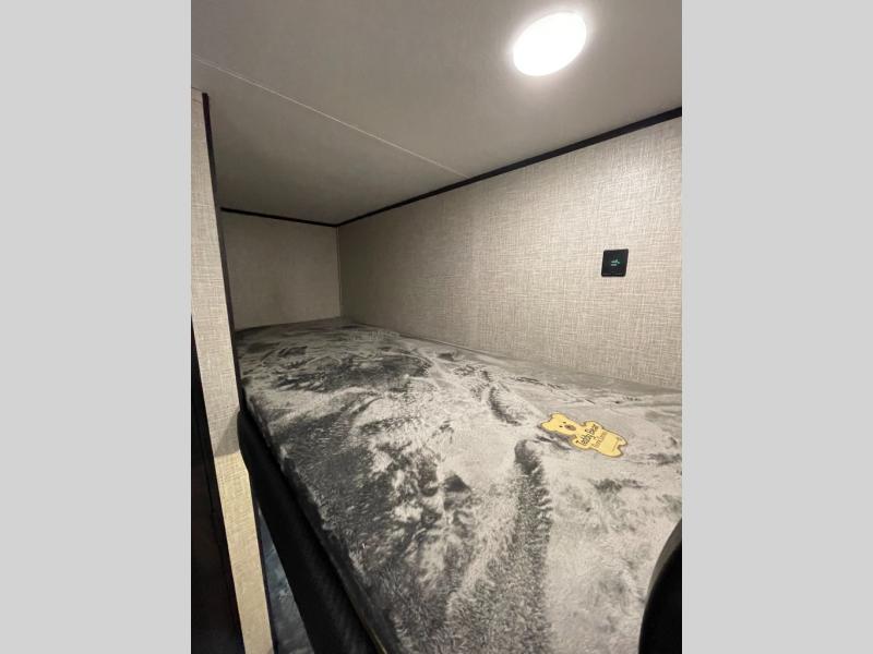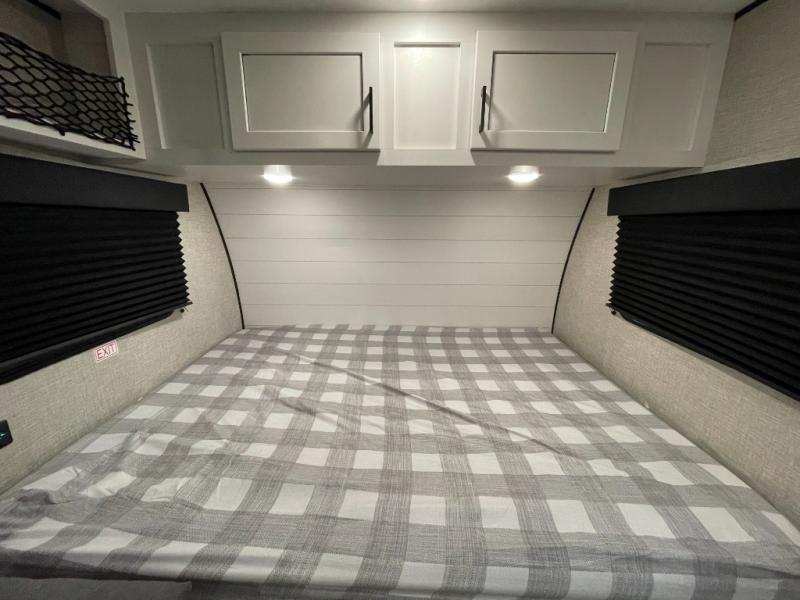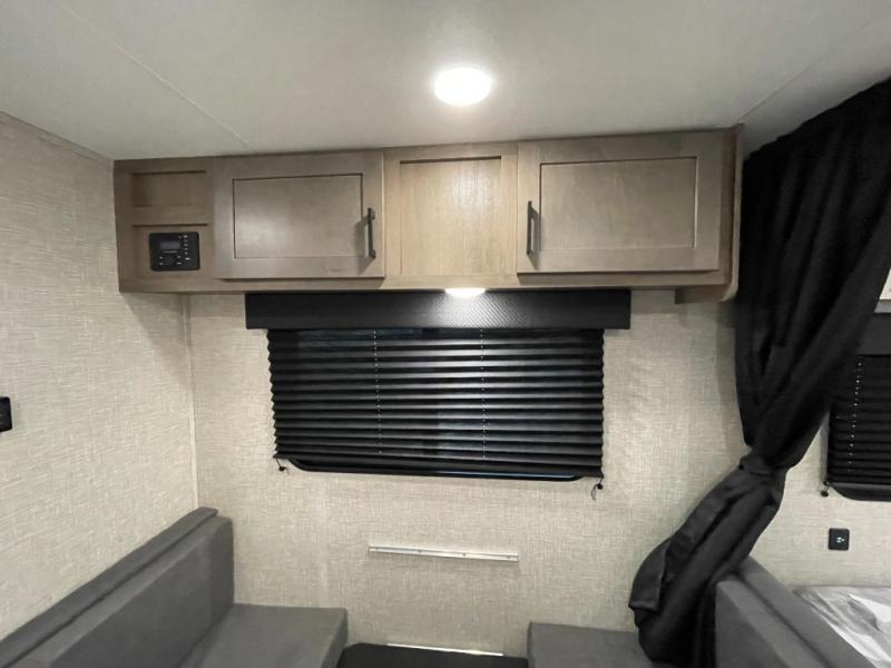 This Jay Flight SLX travel trailer offers you a queen-size bed for sleeping at night, and there is even a privacy curtain that you can draw to separate the bed from the rest of the trailer too. The 29" x 75" bunk beds are another sleeping location, and you can even create a bed for one more person by transforming the booth dinette. Overhead cabinets will help you keep your belongings organized, and the kitchen has a two-burner range, 6-cubic foot refrigerator, residential-style countertops, microwave oven, and a high-rise faucet at the sink to help you prepare meals.