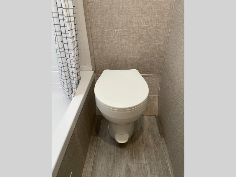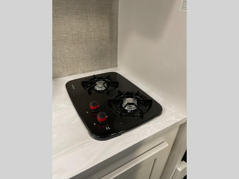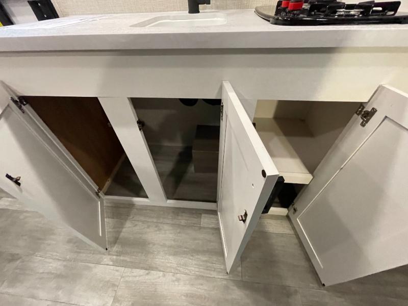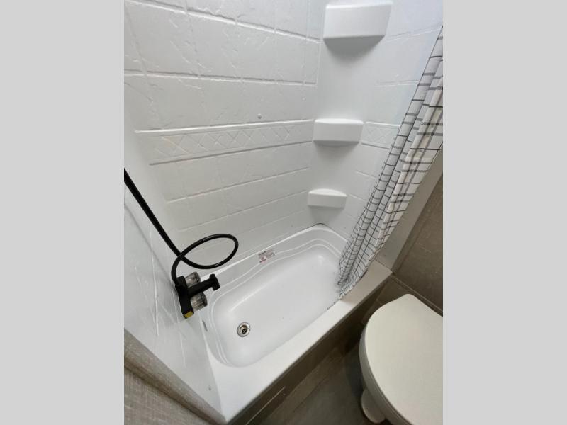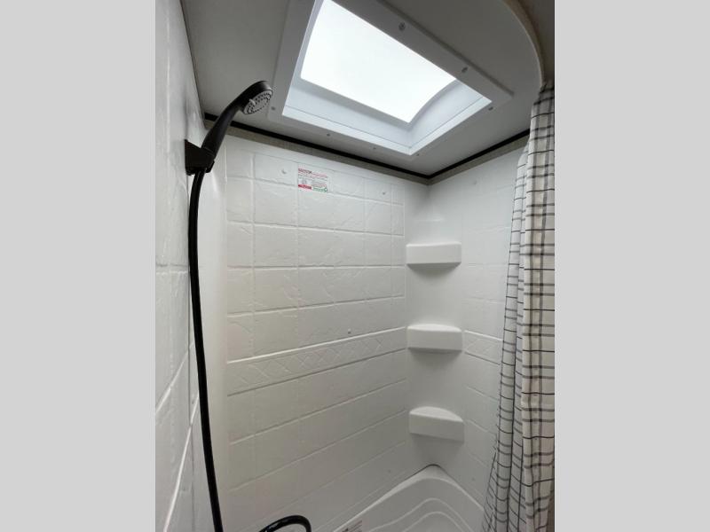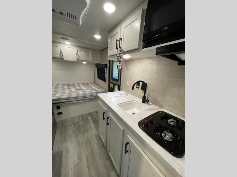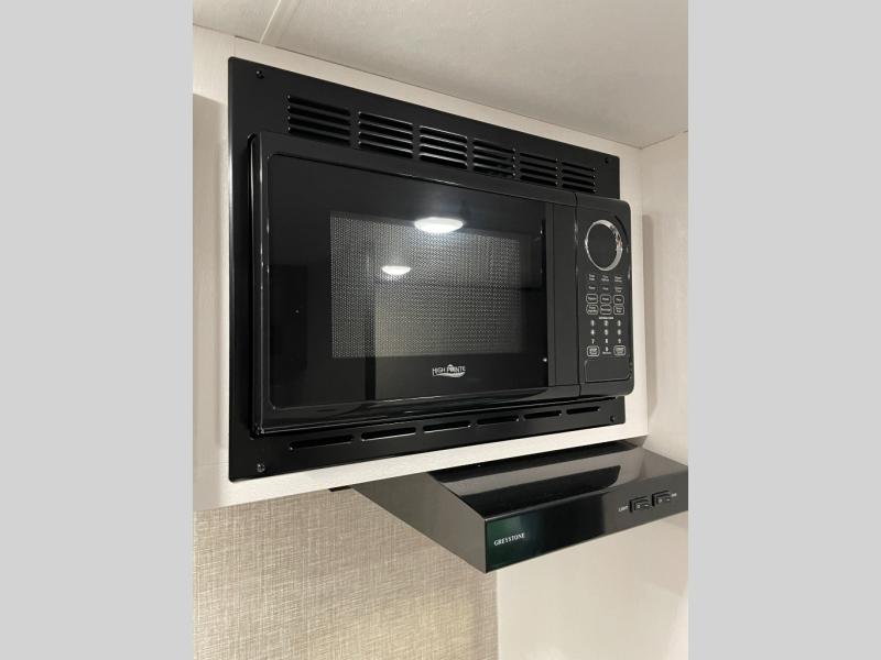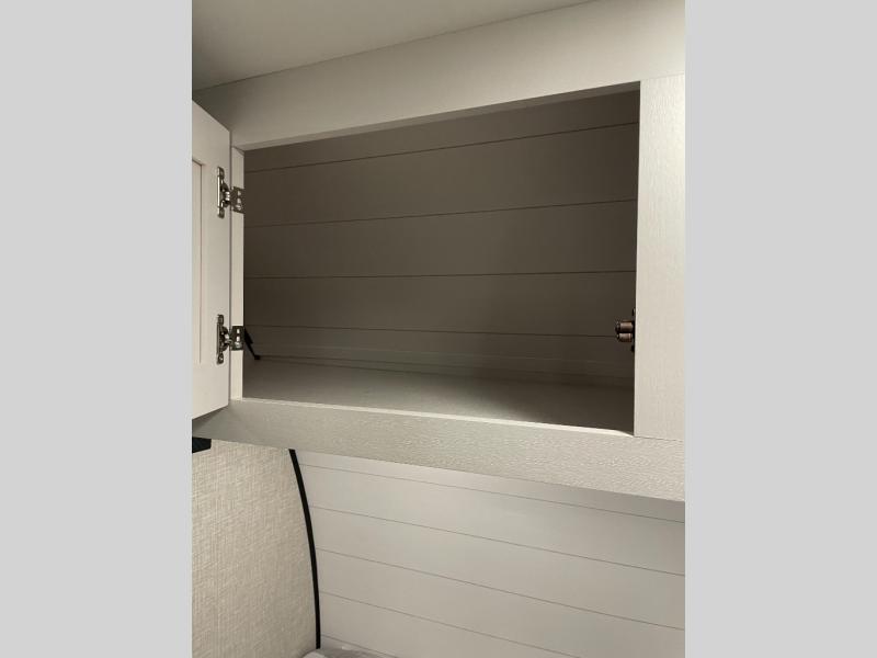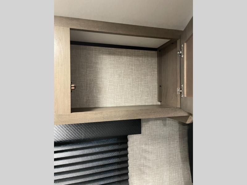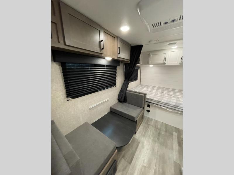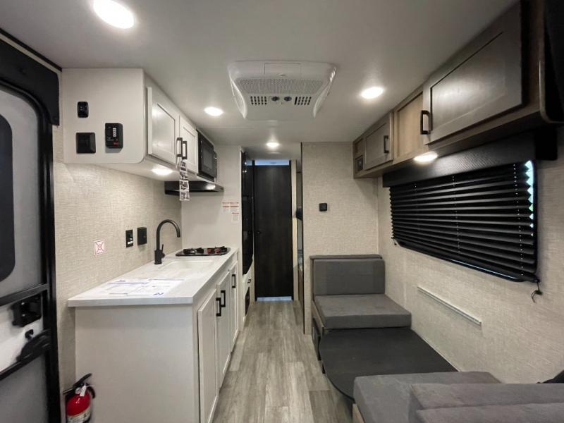 This Jay Flight SLX travel trailer offers you a queen-size bed for sleeping at night, and there is even a privacy curtain that you can draw to separate the bed from the rest of the trailer too. The 29" x 75" bunk beds are another sleeping location, and you can even create a bed for one more person by transforming the booth dinette. Overhead cabinets will help you keep your belongings organized, and the kitchen has a two-burner range, 6-cubic foot refrigerator, residential-style countertops, microwave oven, and a high-rise faucet at the sink to help you prepare meals.
