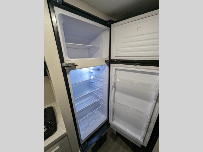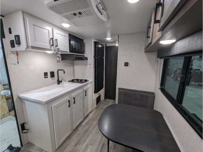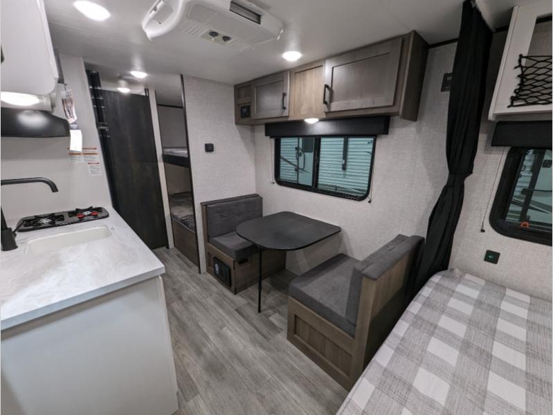 This Jay Flight SLX travel trailer offers you a queen-size bed for sleeping at night, and there is even a privacy curtain that you can draw to separate the bed from the rest of the trailer too. The 29" x 75" bunk beds are another sleeping location, and you can even create a bed for one more person by transforming the booth dinette. Overhead cabinets will help you keep your belongings organized, and the kitchen has a two-burner range, 8 cu.ft. 12V refrigerator, microwave oven, and a high-rise faucet at the sink to help you prepare meals.
