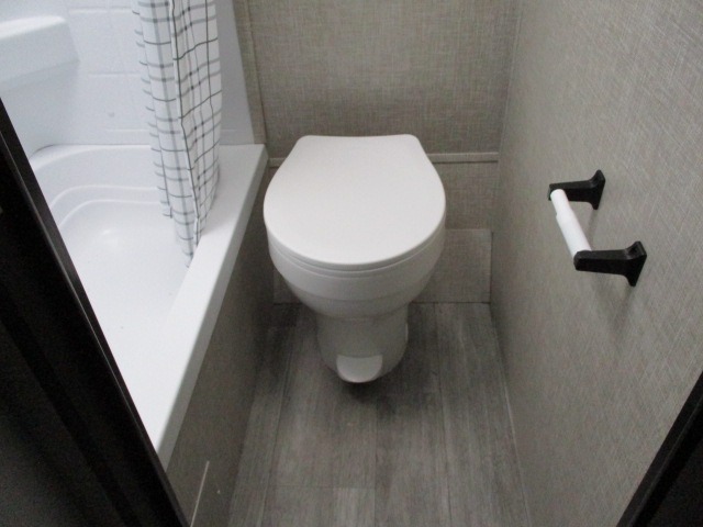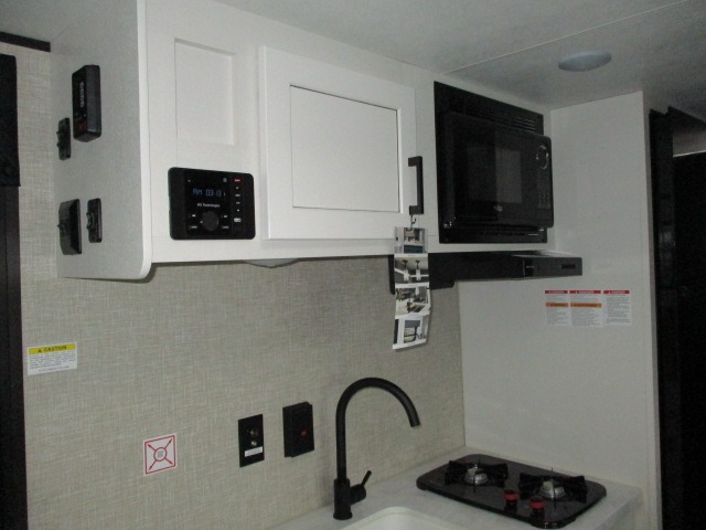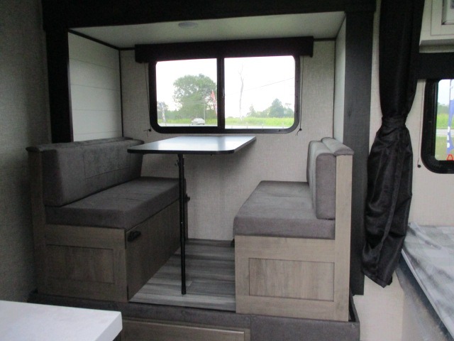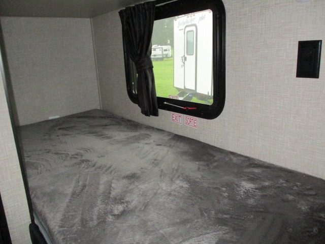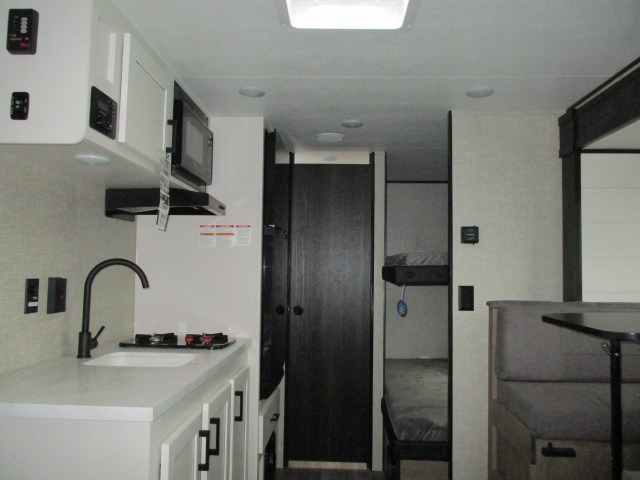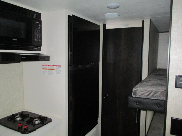 There is room to sleep five people in this Jay Flight SLX travel trailer with the 29" x 75" bunk beds, a booth dinette once converted, and on the RV queen bed. There is also added living space thanks to the single slide, and the private bathroom adds convenience for everyone with its tub/shower and toilet. The kitchen has all of the necessities for you to create delicious meals, like an 8-cubic foot refrigerator, microwave oven, and two-burner range, and you also have overhead cabinets to use for keeping your items organized.