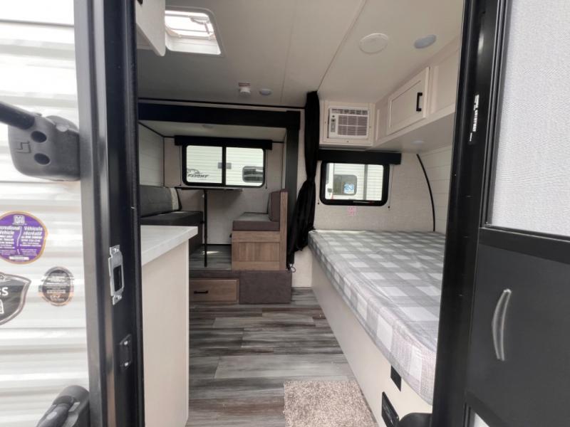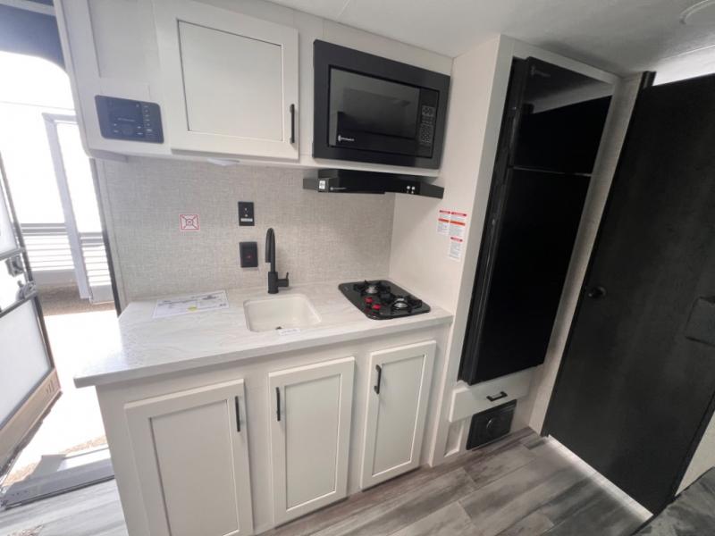 There is room to sleep up to six people in this Jay Flight SLX travel trailer with the 29" x 75" bunk beds, a booth dinette once converted, and on the queen bed. There is also added living space thanks to the single slide, and the private bathroom adds convenience for everyone with its tub/shower and toilet. The kitchen has all of the necessities for you to create delicious meals, like an 8 cu. ft. 12V refrigerator, microwave oven, and two-burner range, and you also have overhead cabinets to use for keeping your items organized.