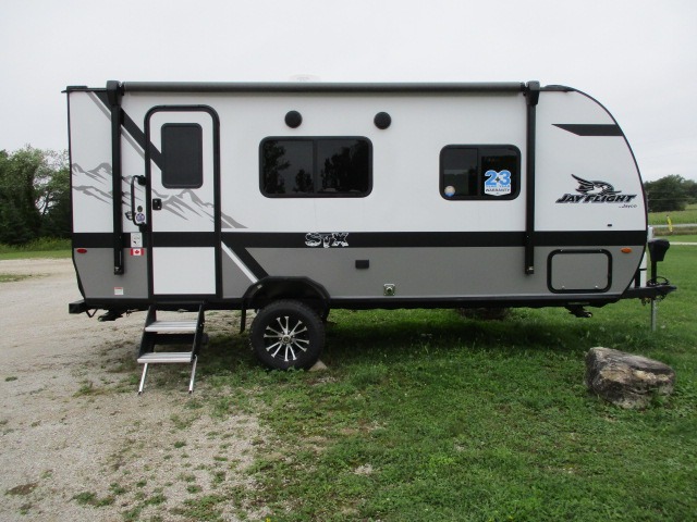 Gain some freedom to travel with this Jay Flight SLX travel trailer! You can rest comfortably each night on an RV queen bed that can be sectioned off into a semi-private bedroom with a privacy curtain. There is a private bathroom with a tub/shower and toilet so that you can stay clean, and the kitchen has a two-burner range and microwave oven for all of your inside cooking needs. Outside, there is a 10' power awning to protect you from too much sun, and you can also store extra gear in the exterior storage compartment which is quite handy.
