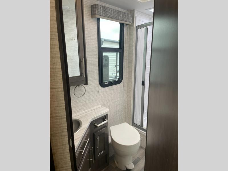 Head across the states in this comfortable coach that can sleep five each night. You will enjoy an RV queen bed just like you have at home, and your guests can sleep on the U-shaped dinette and cab-over bunk. If you're not needing the overhead bunk, just choose the optional front entertainment center with a 32" LED HDTV, and the dinette can also be optioned out for theater seating to make this a couples coach. You can prepare all your meals on the Suburban two burner drop-in cooktop, or use the convection microwave. The flip-up counter will provide more counter space, and all your perishables can be stored in the 10 cu. ft. 12V refrigerator.