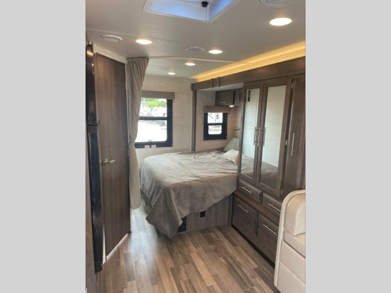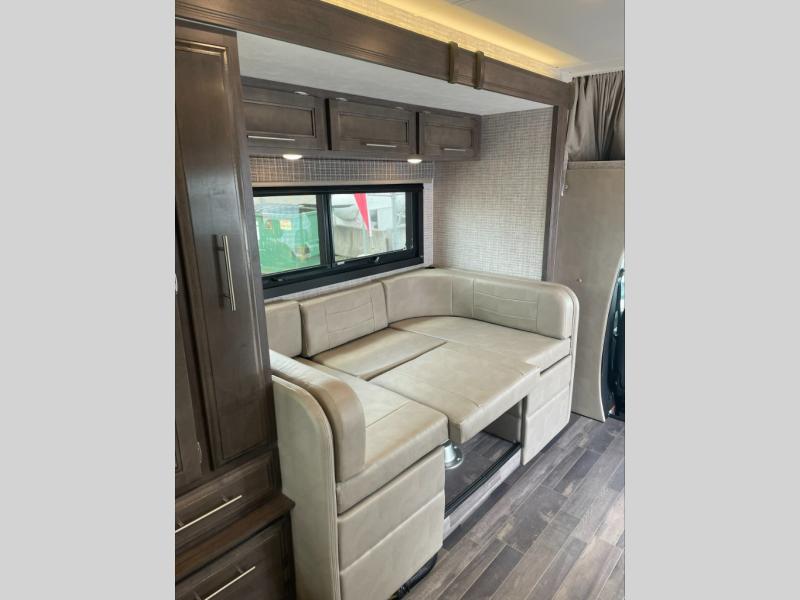 Each Melbourne Class C diesel motorhome by Jayco features durable Stronghold VBL lamination, bead-foam insulation, and a seamless front cap that resists wear and tear from the elements. The updated 2L V4 twin turbo 211HP diesel engine with 332 ft. lb. torque will power your trips near and far, and the Mercedes-Benz chassis is ultra durable. There are seatbelts in all designated seating locations, and the captain's seats swivel around so they can become a part of the living area once parked. You'll appreciate an Onan 3,600-watt LP generator on board, as well as a 13,500 BTU A/C and a 30,000 BTU furnace to keep you comfortable year around. The interior of the Melbourne will have you feeling right at home with high-intensity LED lights, an 83" interior height with a padded vinyl ceiling, hardwood cabinet doors and drawers, and more!