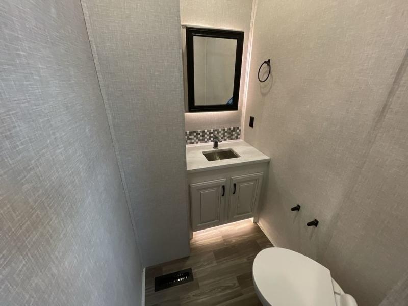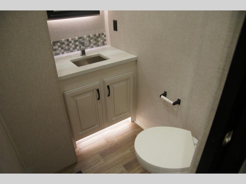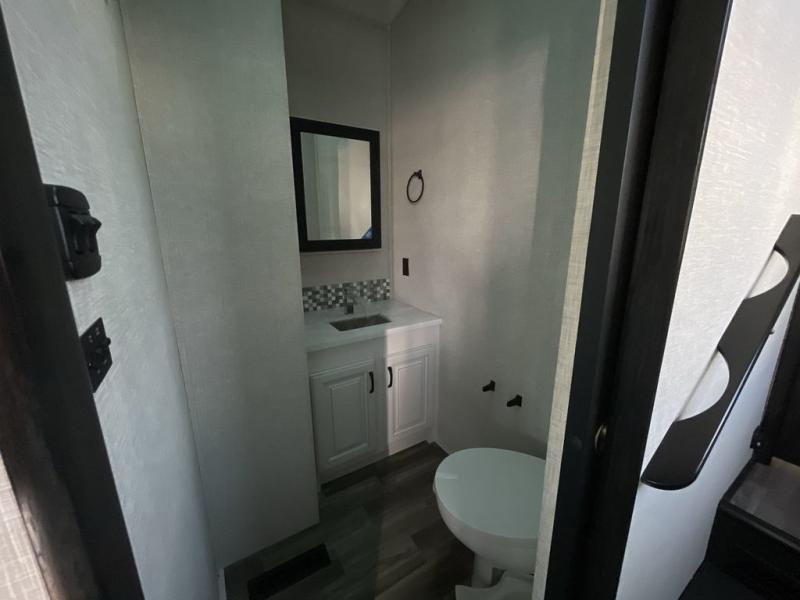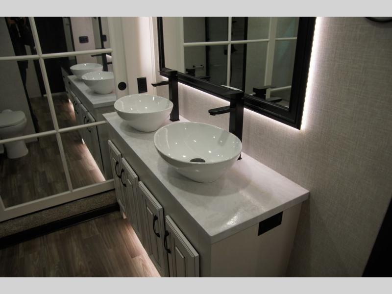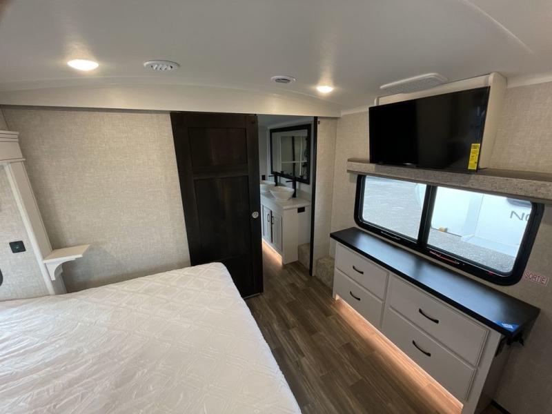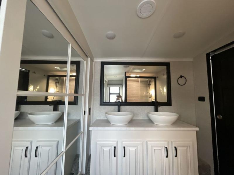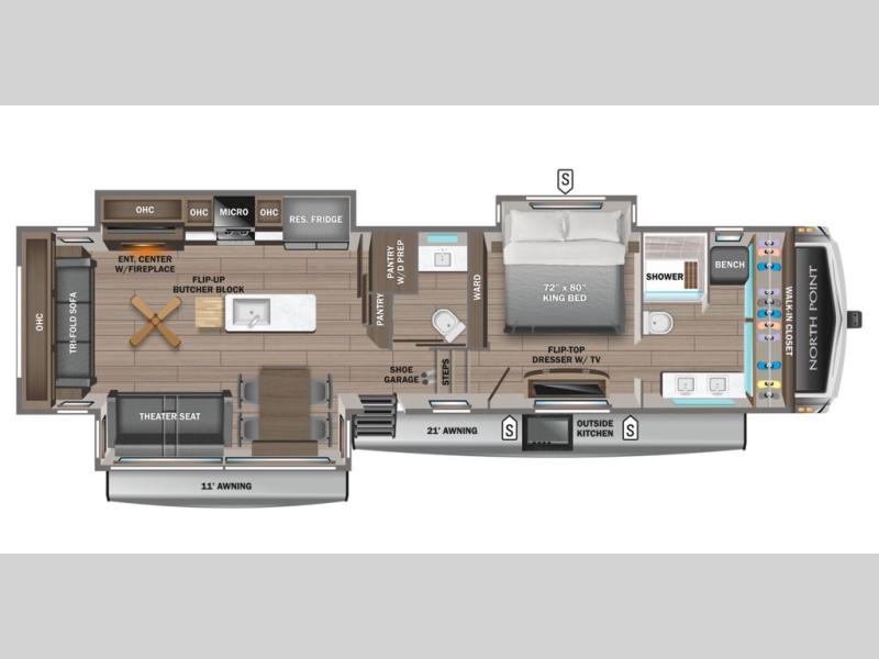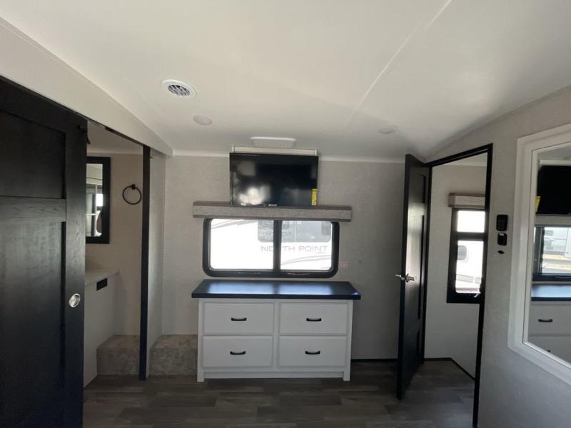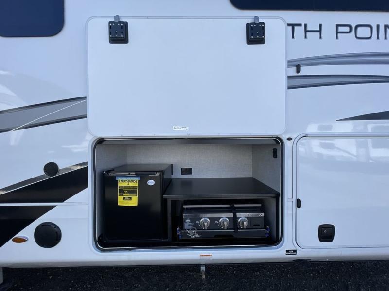 With any North Point fifth wheel by Jayco you begin with a strong foundation with a custom frame, designed and sized specifically to best support each unit. Constructed with Stronghold VBL™ aluminum framed, vacuum bond laminated walls and the Magnum Truss™ XL6™ roof system with a one-piece, seamless roof material, which is the strongest tested roof in the industry. The 5-Star Handling package is included with Uniroyal tires, a MORryde rubber pin box, Dexter axles with Nev-R-Adjust brakes, MORryde CRE-3000 rubberized suspension and wet bolt fasteners and bronze bushings. The interior has handcrafted hardwood glazed doors and drawers, vinyl flooring throughout, a vessel bowl sink with high rise faucet in the main bathroom, plus so much more you just have to see one to believe it all!