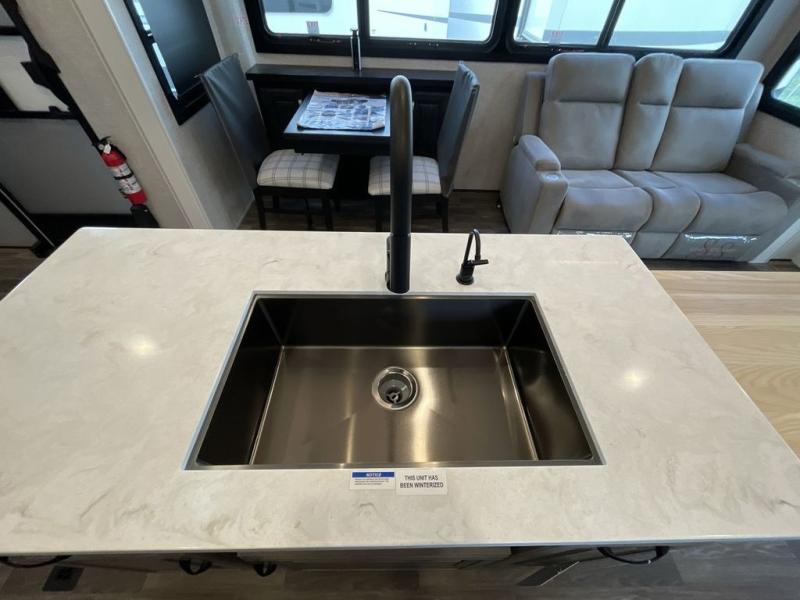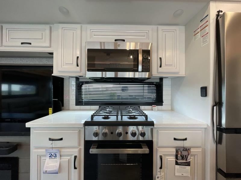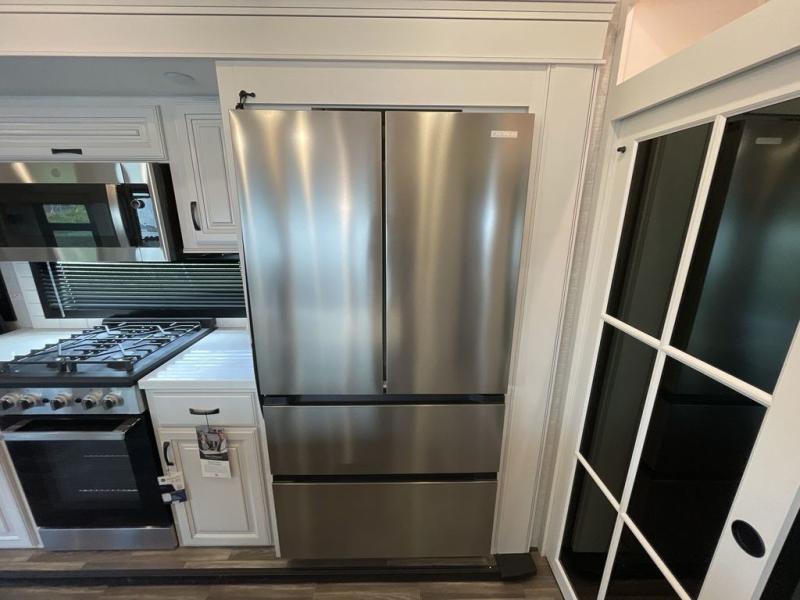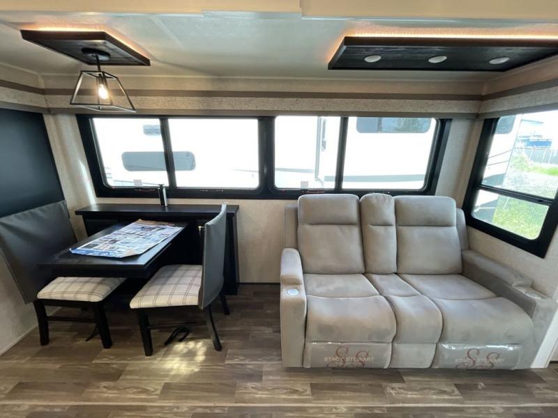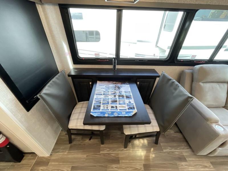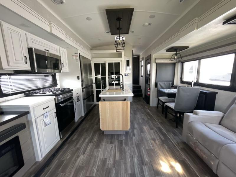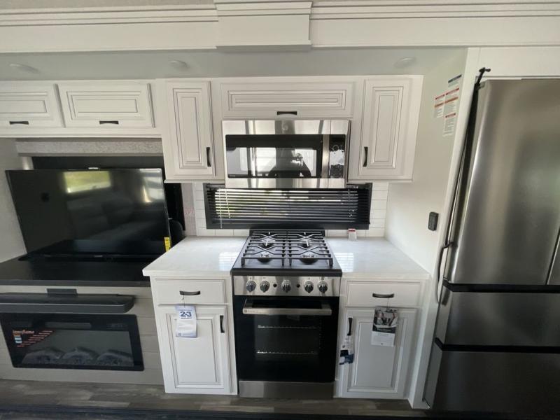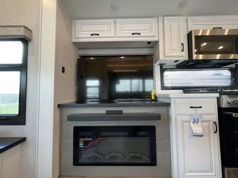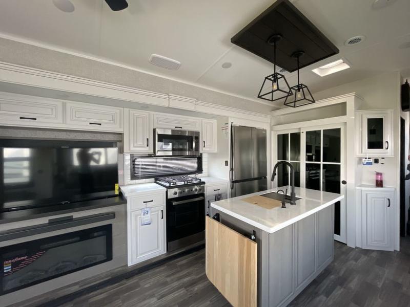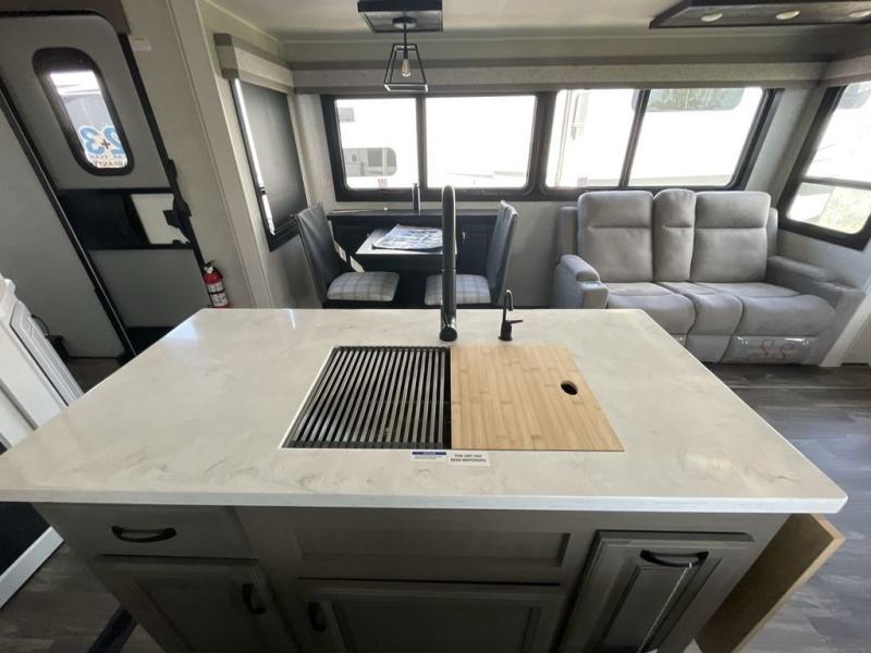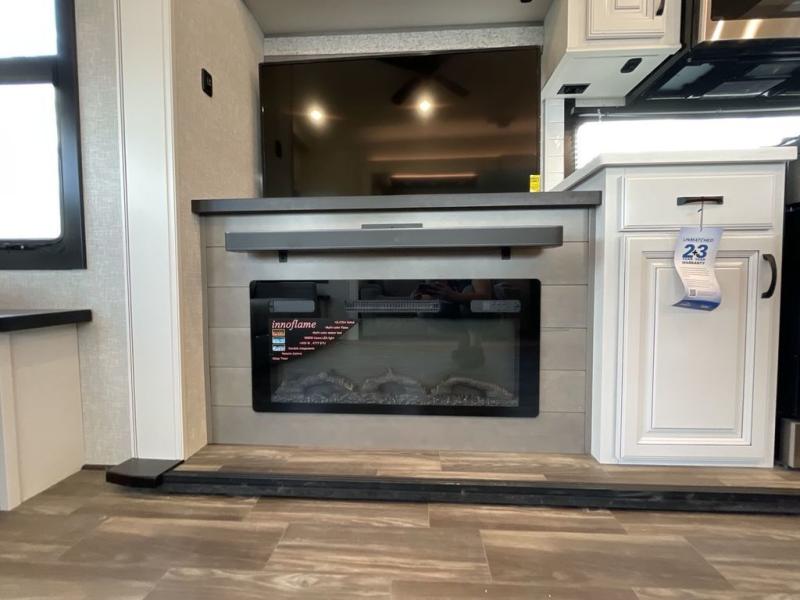Finding the perfect RV park or campground is all you have to do, then you can load up and hit the road whether you are a full-timer or weekend warrior. The two electric awnings and the three slides are easy to set up and close, and you will have lots of interior and exterior storage to bring everything you might need. The kitchen offers a residential refrigerator and 24" stove, a 30" residential microwave, a kitchen island, a pantry and a pull-out countertop. You can relax on the tri-fold sofa and the theater seats while watching your shows on the 50" Smart LED HDTV with fully digital HDMI output and home entertainment system with subwoofer plus there is a fireplace below. Dine at the free standing table which includes a leaf, two free standing chairs and two folding chairs, or you can work from here as well. The front bedroom offers a king bed slide and a flip-top dresser with 32" TV, plus access to a spacious private front bath including dual sinks, a walk-in closet, bench seat, and more.