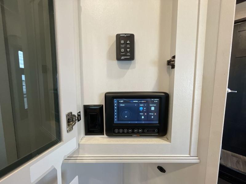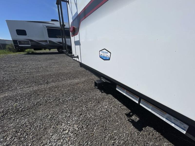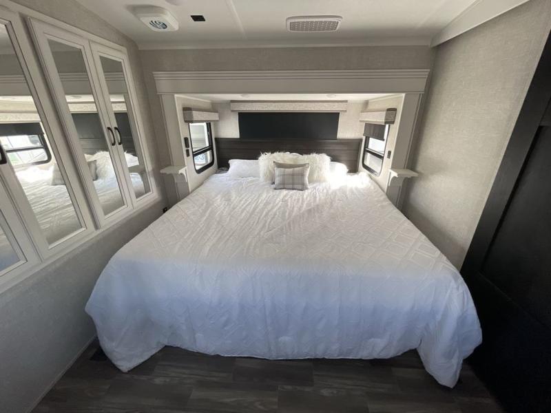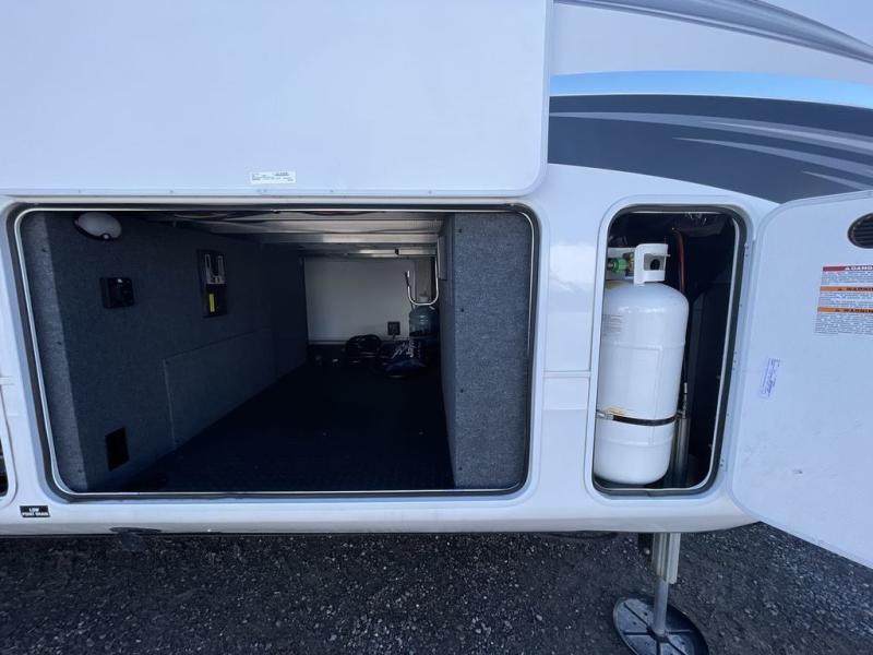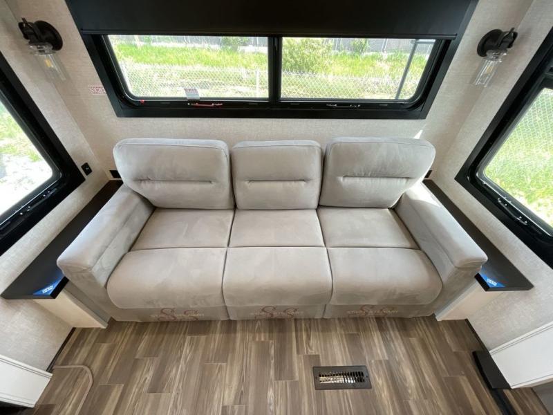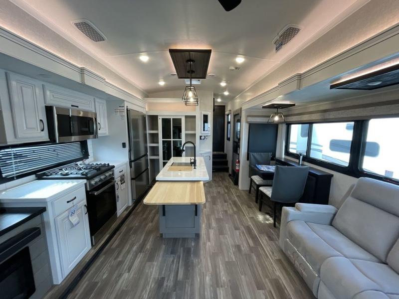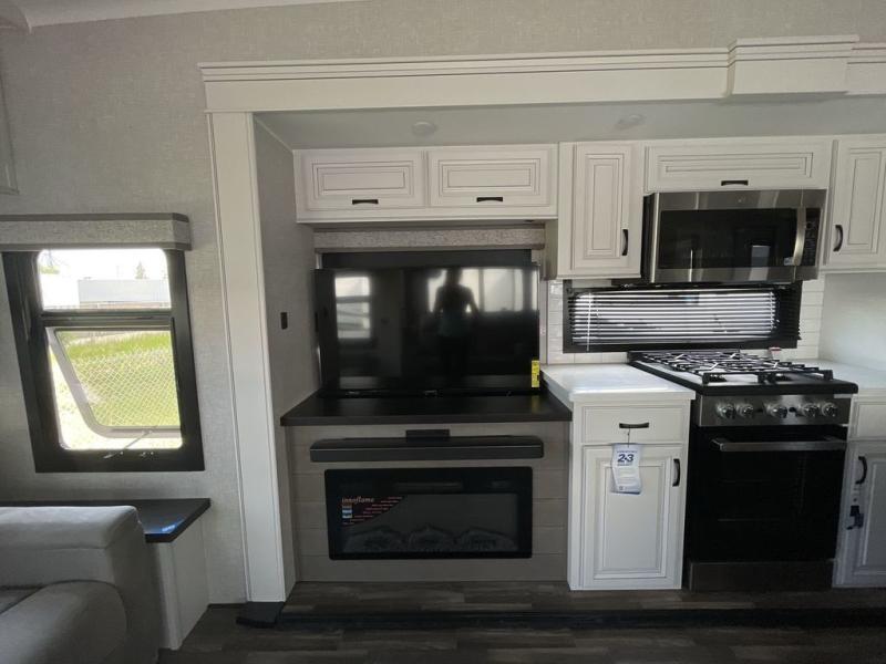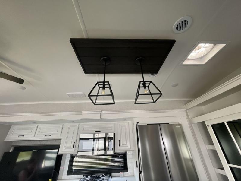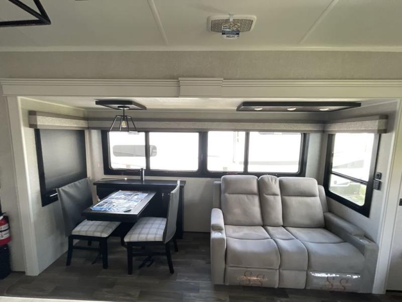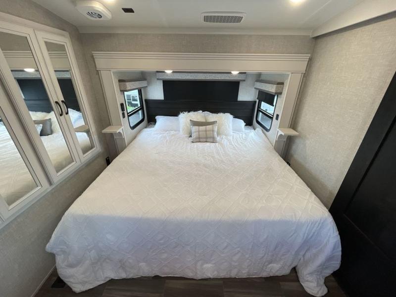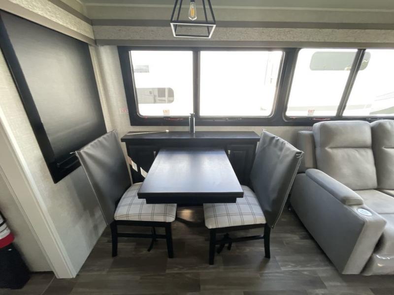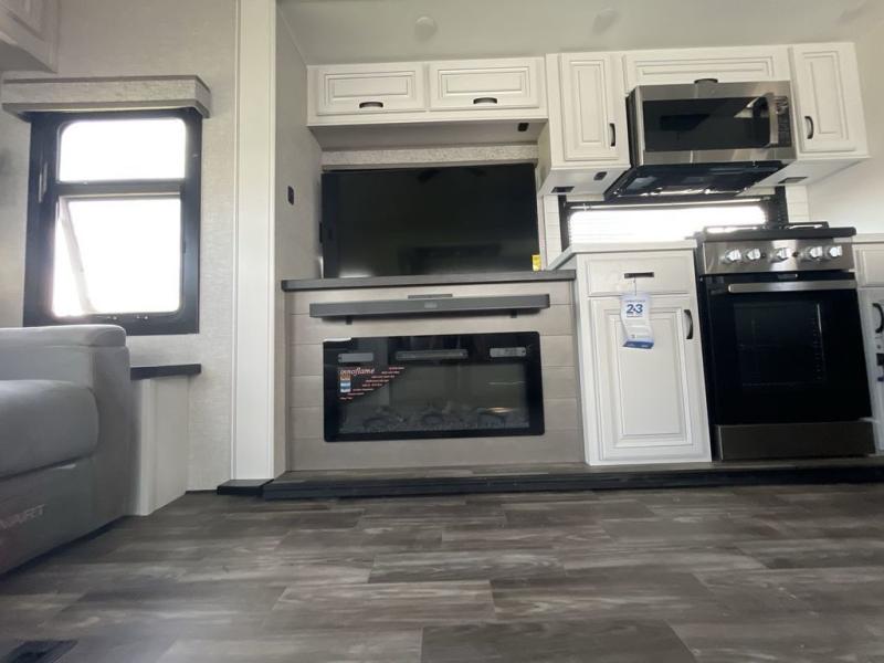 Finding the perfect RV park or campground is all you have to do, then you can load up and hit the road whether you are a full-timer or weekend warrior. The two electric awnings and the three slides are easy to set up and close, and you will have lots of interior and exterior storage to bring everything you might need. The kitchen offers a residential refrigerator and 24" stove, a 30" residential microwave, a kitchen island, a pantry and a pull-out countertop. You can relax on the tri-fold sofa and the theater seats while watching your shows on the 50" Smart LED HDTV with fully digital HDMI output and home entertainment system with subwoofer plus there is a fireplace below. Dine at the free standing table which includes a leaf, two free standing chairs and two folding chairs, or you can work from here as well. The front bedroom offers a king bed slide and a flip-top dresser with 32" TV, plus access to a spacious private front bath including dual sinks, a walk-in closet, bench seat, and more.