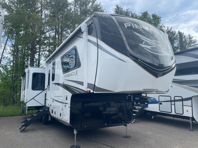 Each Pinnacle fifth wheel features Stronghold VBL lamination for the lightest, yet strongest construction in the RV industry. Add that to the Magnum Truss XL6 roof system and Climate Shield zero-degree tested weather protection and you'll be enjoying your fifth wheel for years to come. Some of the exterior conveniences you will appreciate are the Keyed-Alike lock system, the fully enclosed, universal docking center, and the 6-point hydraulic auto-leveling system for quick and easy set up. The 5 Star Handling Package will make towing a fifth wheel a walk in the park, and the two Whisper Quiet A/C units will keep you comfortable during the hot summer months. Inside, you'll enjoy the farmhouse stainless steel sink, the handcrafted hardwood glazed cabinetry, the vinyl flooring throughout, plus many more comforts. There is even a central vacuum system, a wireless remote control system, USB ports throughout, plus many more conveniences to make each trip enjoyable.