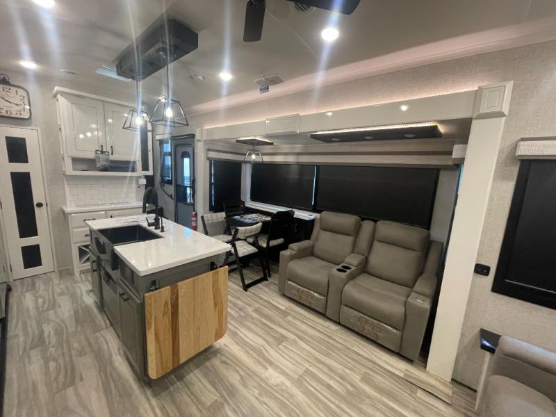 Trips to the lake are made comfortable in this triple slide out fifth wheel. Once you arrive at the campground, set up the two power awnings with LED lights, and there is an exterior TV for the big game. Head inside to relax on the theater seat directly across from the TV and fireplace, or play a game at the free-standing table. The chef of your group will love this Pinnacle kitchen with its residential refrigerator, kitchen island, a pantry, plus additional storage for canned goods or paper products. The full bath will allow you to stay clean throughout your trip, and you'll find a residential style backsplash in the bath, plus a walk-in shower. Nothing says luxury like your own king bed slide out in the front bedroom, a large front closet with hamper and drawers for wrinkle-free clothes, and a flip-up dresser featuring a 32" TV!