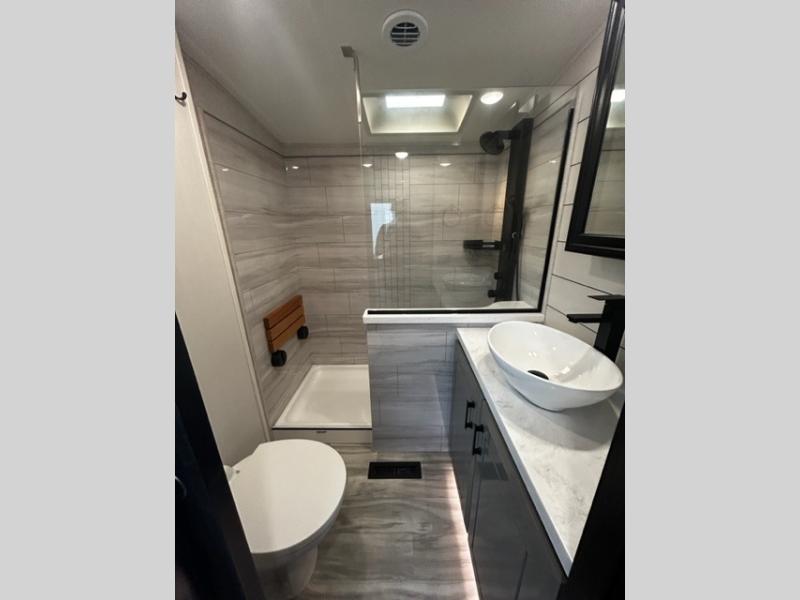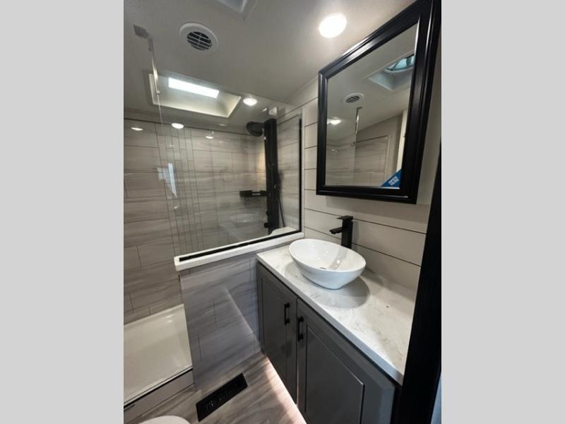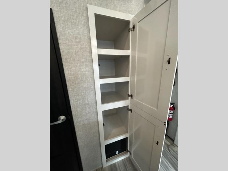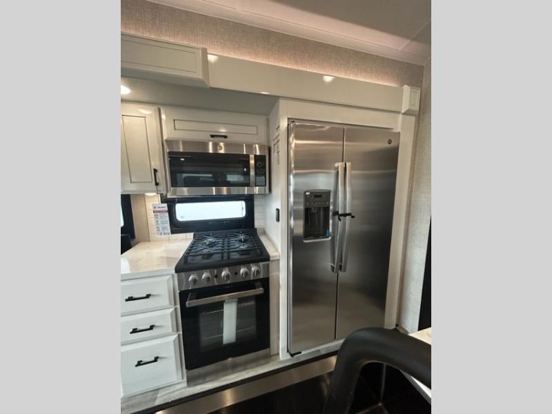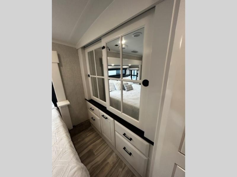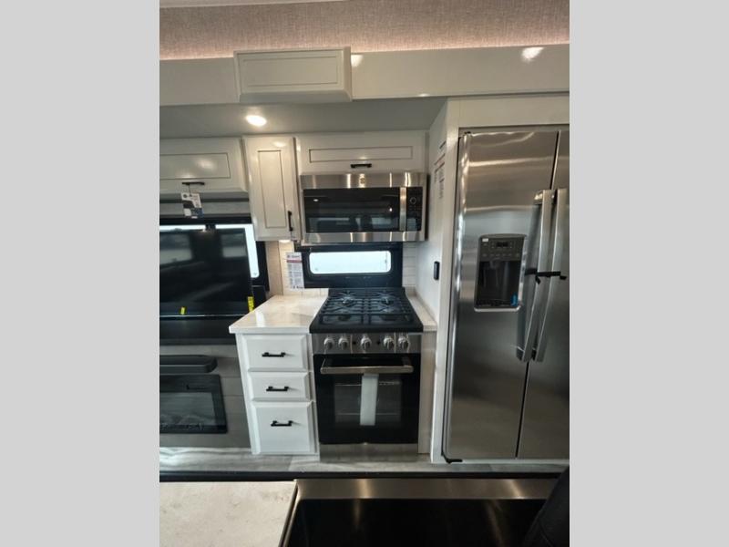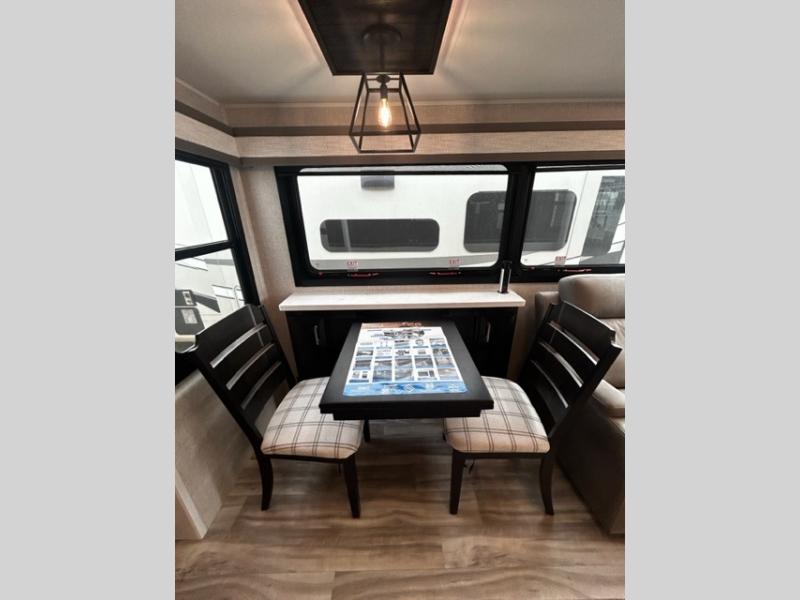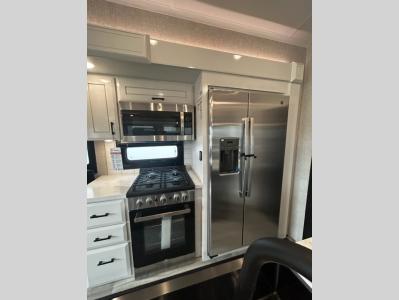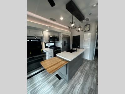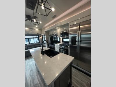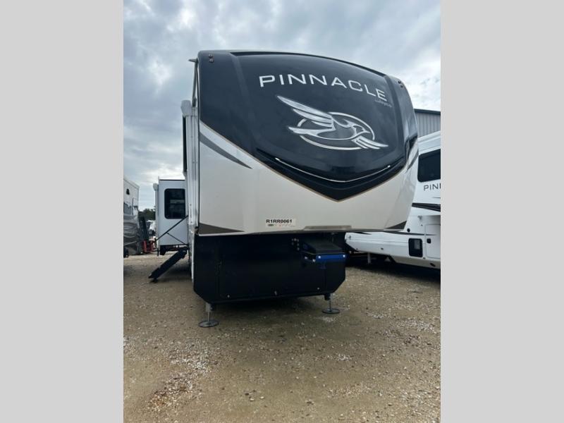Each Pinnacle fifth wheel features Stronghold VBL lamination for the lightest, yet strongest construction in the RV industry. Add that to the Magnum Truss XL6 roof system and Climate Shield zero-degree tested weather protection and you'll be enjoying your fifth wheel for years to come. Some of the exterior conveniences you will appreciate are the Keyed-Alike lock system, the fully enclosed, universal docking center, and the 6-point hydraulic auto-leveling system for quick and easy set up. The 5 Star Handling Package will make towing a fifth wheel a walk in the park, and the two Whisper Quiet A/C units will keep you comfortable during the hot summer months. Inside, you'll enjoy the farmhouse stainless steel sink, the handcrafted hardwood glazed cabinetry, the vinyl flooring throughout, plus many more comforts. There is even a central vacuum system, a wireless remote control system, USB ports throughout, plus many more conveniences to make each trip enjoyable.