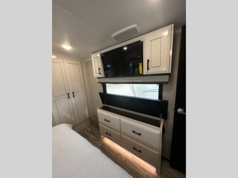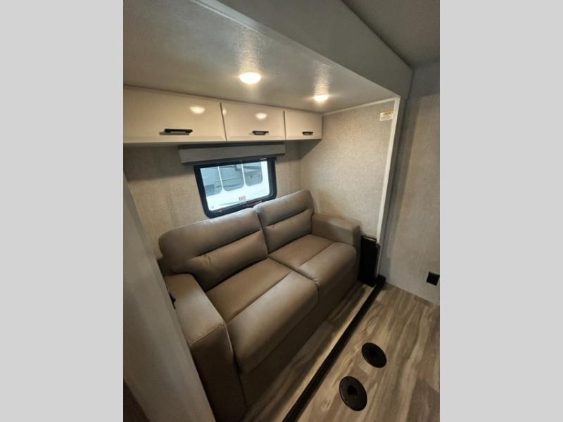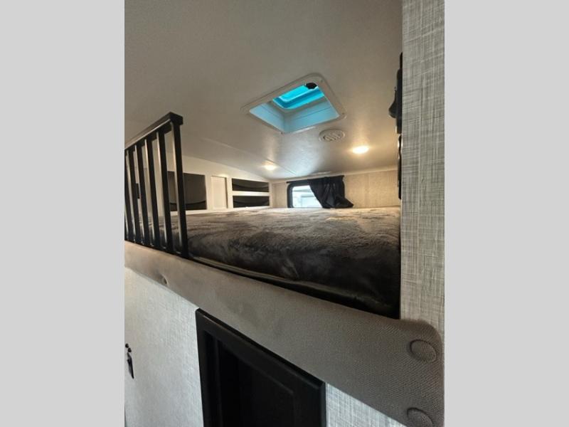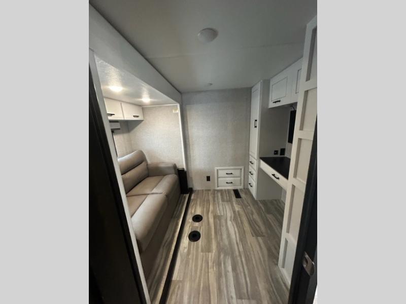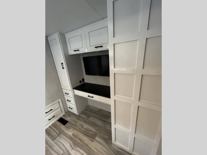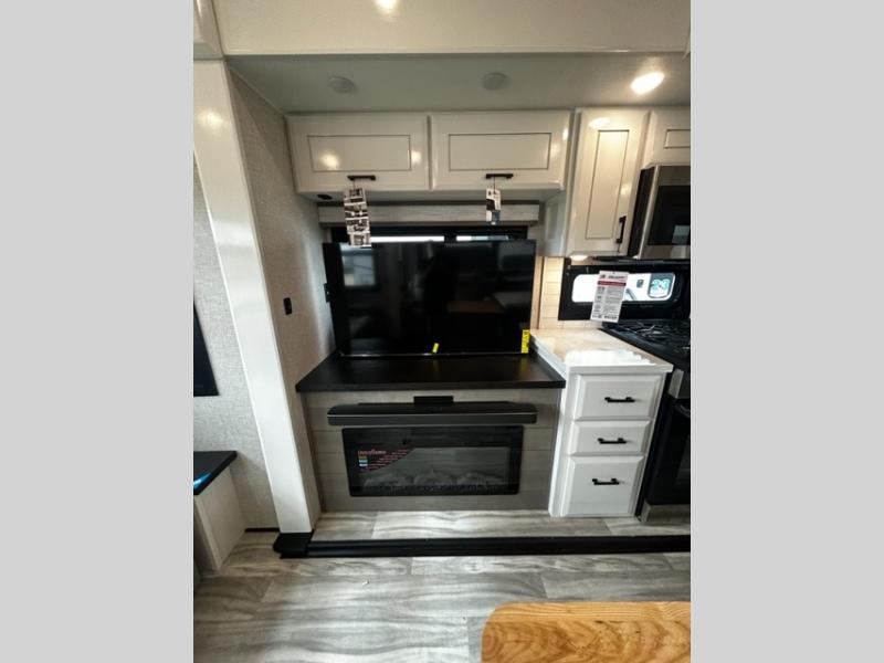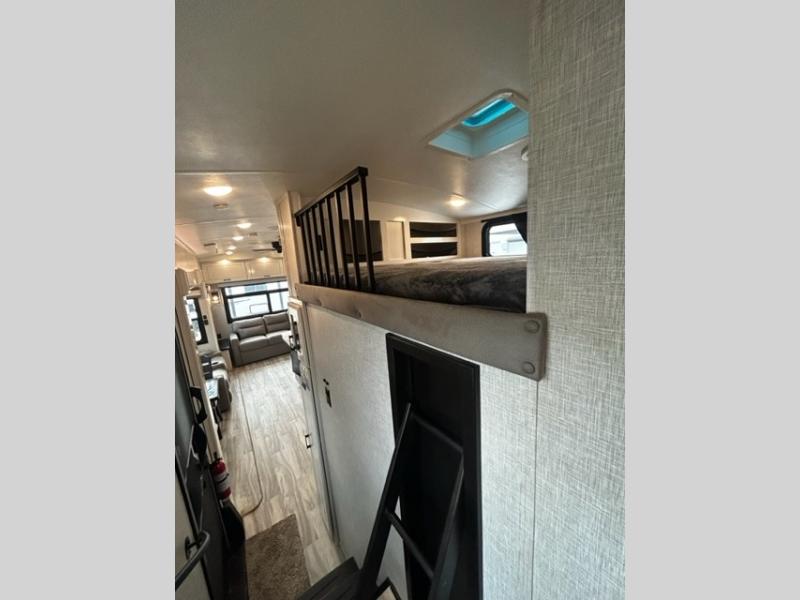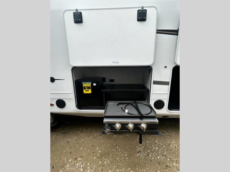 Wow! Check out this fifth wheel packed with luxury features for your crew of eight. The middle den/office includes a sofa with a table, a desk with a TV above it, plus a loft for the little ones or extra storage space. You will have the front private bedroom all to yourselves with a king bed for added sleeping space, a 32" TV, plus a large front closet with a hamper and drawers, plus washer and dryer prep next to it. The chef of your group will have a kitchen island with a countertop extension for extra prep space and a dishwasher, plus this model includes an outside kitchen they are sure to enjoy. Put out the dual power awnings and turn the game on the exterior 32" TV to let the party begin! You can wind down the night by relaxing on the theater seating across from the TV and fireplace, or stay up and play a game of cards at the free-standing table!