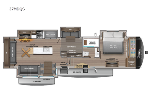 Wow! Check out this fifth wheel packed with luxury features for your crew of eight. The middle den/office includes a sofa with a table, a desk with a TV above it, plus a loft for the little ones or extra storage space. You will have the a private front bedroom featuring a king bed for more sleeping space, a 32" TV, plus a large front closet with a hamper and drawers. There is also a space that features washer and dryer prep next to it. The chef of your group will enjoy the kitchen island with a butcher block extension for extra prep space, and a dishwasher for easy cleanup. This model also includes an outside kitchen so you can spend as much time enjoying the outdoors even when cooking. Put out the dual power awnings and turn the game on the exterior 32" TV to let the party begin! You can wind down the night by relaxing on the theater seating across from the TV and fireplace, or stay up and play a game of cards at the free-standing table!