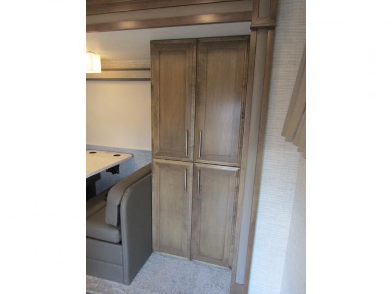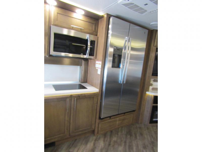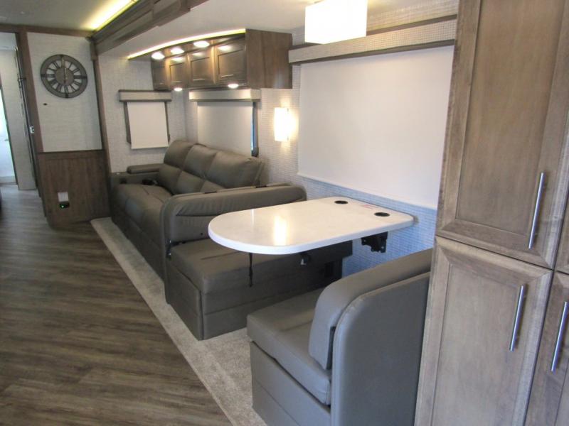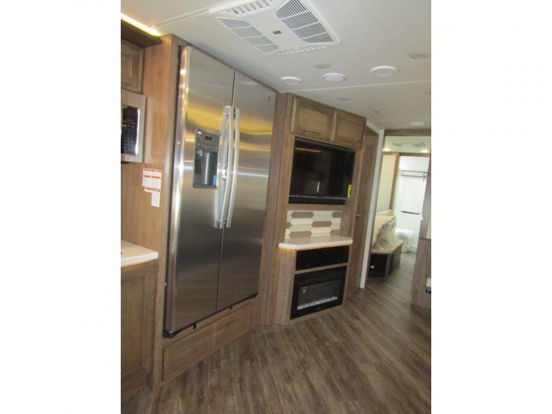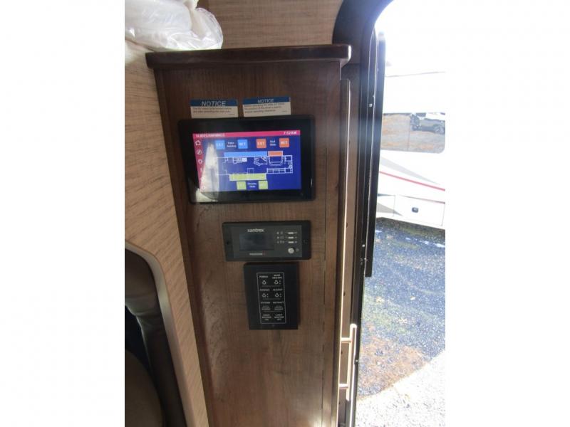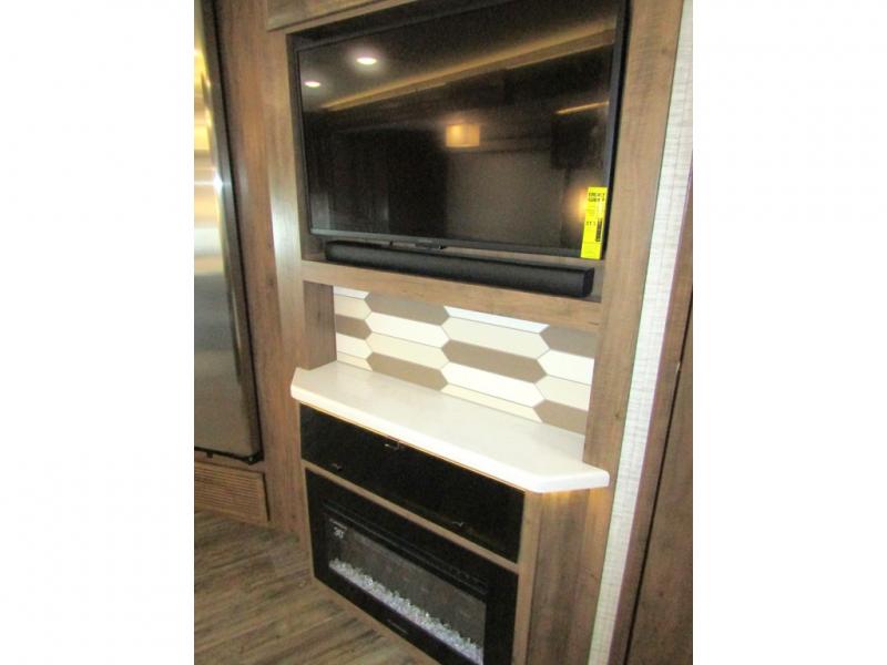 You will find lots to love with this motorhome! From the bath and a half to the bunk over cab and outside entertainment center. The chef can prepare their best meals with the two burner induction cooktop and the residential refrigerator. There's a large pantry next to the booth dinette so you can quickly grab a snack during game night or if you prefer to relax instead then you can enjoy the fireplace and 39" LED HD Smart Fire TV while sitting on the 93" reclining sofa. The master suite has a king bed slide with a power head lift to lay your head on at night, a LED HD Smart TV with a wardrobe and storage area next to it, as well as an area prepped to add an optional washer and dryer. You even have access to the full rear bathroom which has a 30" x 36" shower and a wardrobe to keep your linens close.