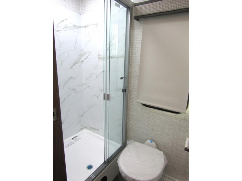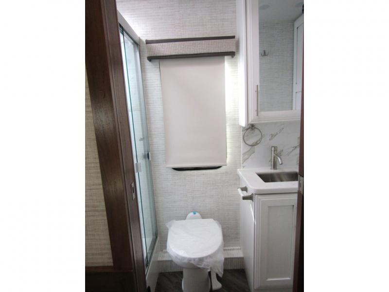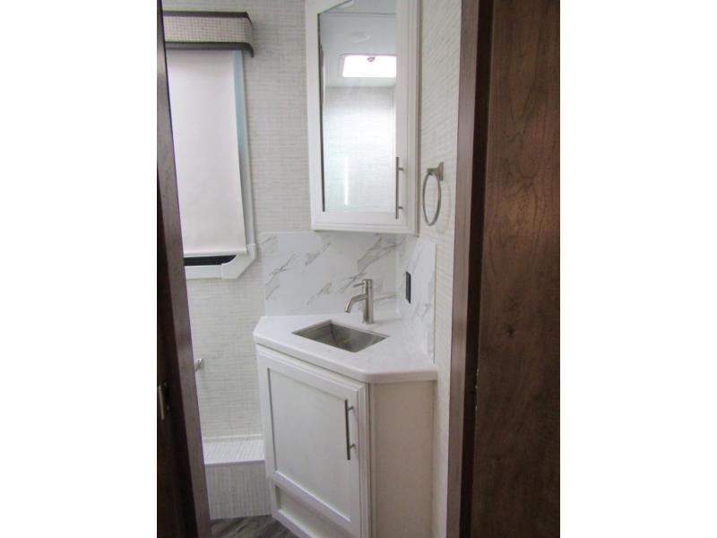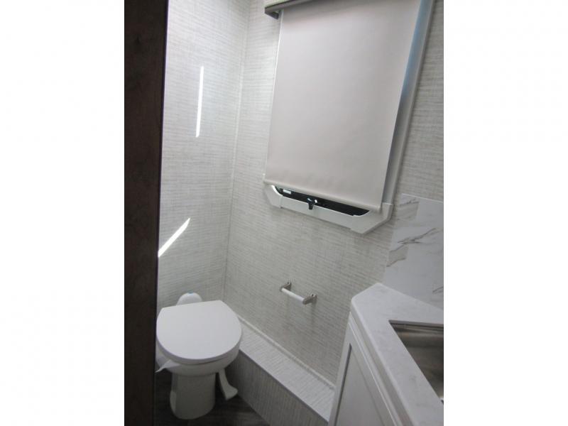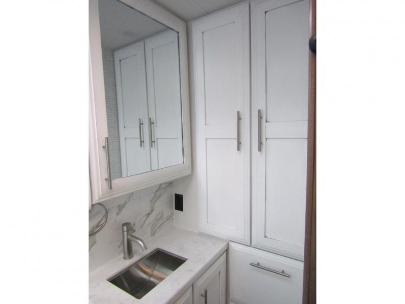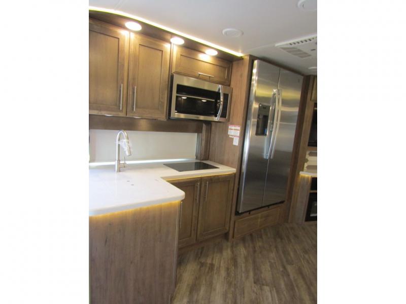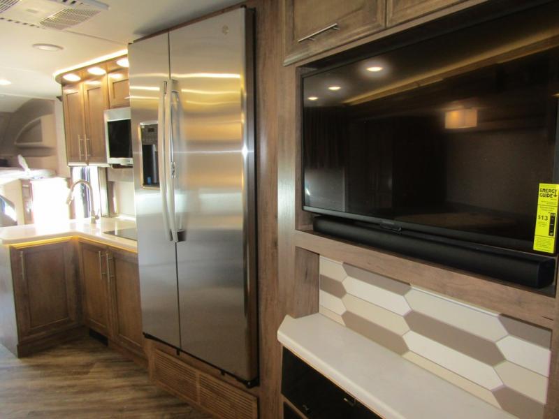 You will find lots to love with this motorhome! From the bath and a half to the bunk over cab and outside entertainment center. The chef can prepare their best meals with the two burner induction cooktop and the residential refrigerator. There's a large pantry next to the booth dinette so you can quickly grab a snack during game night or if you prefer to relax instead then you can enjoy the fireplace and 39" LED HD Smart Fire TV while sitting on the 93" reclining sofa. The master suite has a king bed slide with a power head lift to lay your head on at night, a LED HD Smart TV with a wardrobe and storage area next to it, as well as an area prepped to add an optional washer and dryer. You even have access to the full rear bathroom which has a 30" x 36" shower and a wardrobe to keep your linens close.