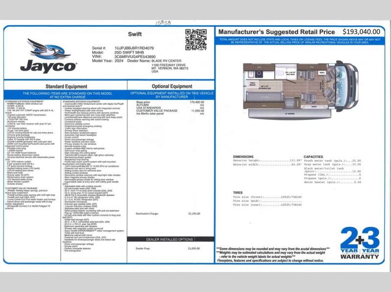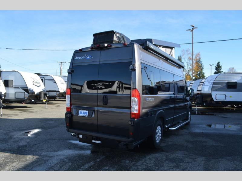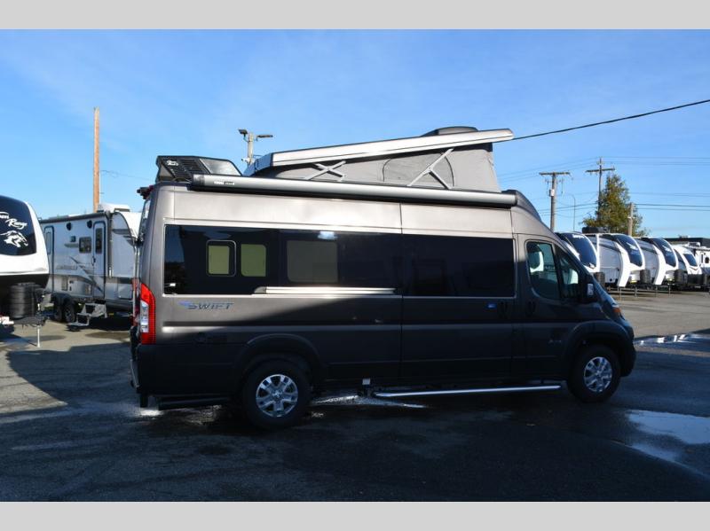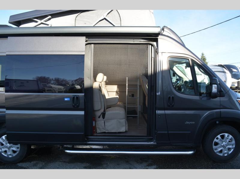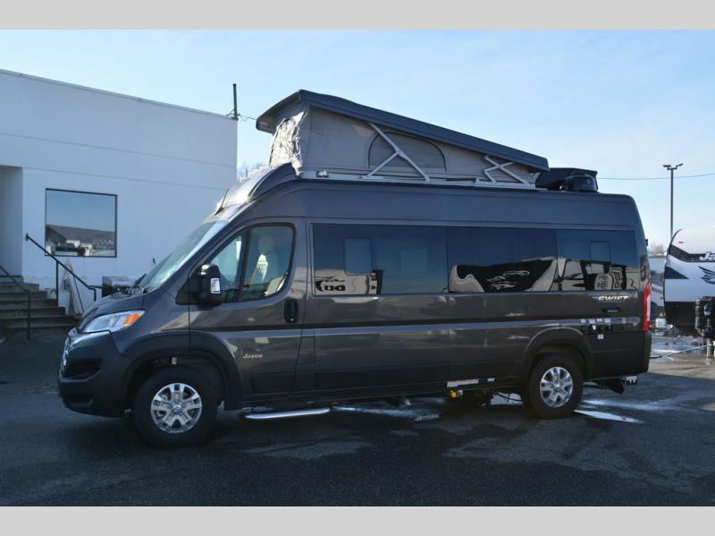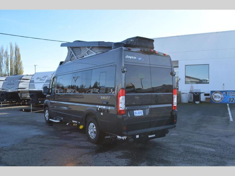 Head out on your greatest adventures with one of these Jayco Swift Class B gas motorhomes! Off-grid camping is made hassle-free with the 200-watt roof-mounted GoPower solar panel, plus there is an Onan 2800W generator with auto-gen start for all your other power needs. Each model includes the JRide system with Hellwig helper springs and a premium heavy-duty suspension for smooth handling, and the Thule armless patio awning with LED lights will create an outdoor living space you are sure to love. Head inside to find a solid surface kitchen countertop with a pull-out extension, four sliding vented windows, a soft-touch vinyl ceiling, plus many more comforts. The Uconnect 5 NAV infotainment center with Apple CarPlay® and Android Auto™ will also come in handy as you travel to your destination!
