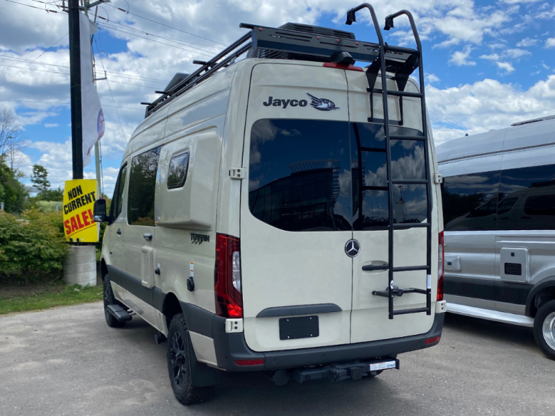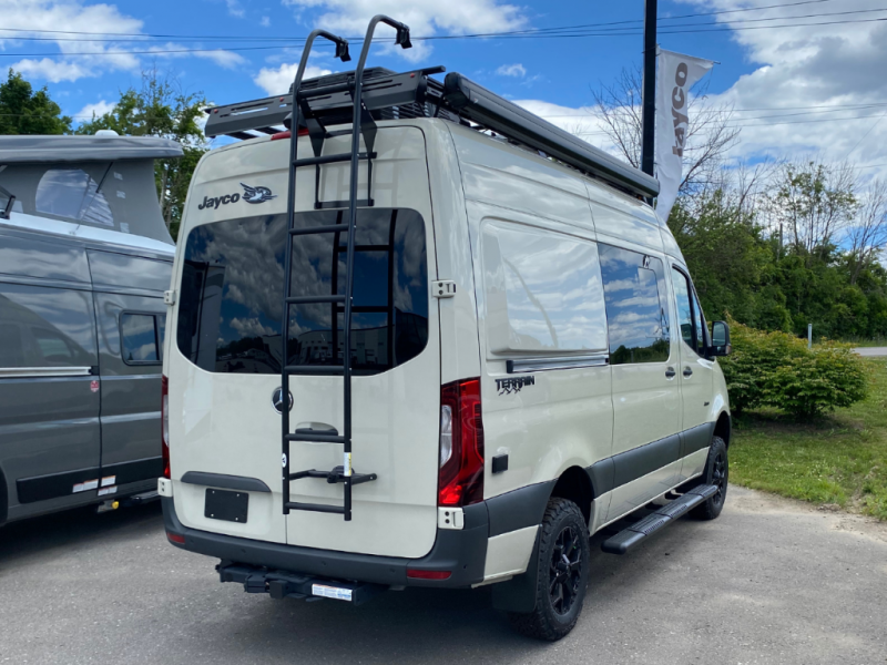 The Jayco Terrain Class B diesel motorhome is just waiting for you to hit the trails with it! The Mercedes-Benz Sprinter 2500 AWD chassis will provide an outstanding driving experience, plus there is a 9-speed transmission and a 2.0L 4-cyliner diesel engine with 211HP and 332 ft.-lb. of torque to power your adventures. You will appreciate the added safety features, such as active lane keeping assist, attention assist, and the parking package with a 360° camera that will help keep you stay safe on the road. This coach includes a 48V-210 amp hour smart lithium battery that provides 10kW of hours of power when you're off-grid, and when you're back at camp, you can check in using the Starlink satellite internet system. The Tecnoform European-style cabinetry is ultra stylish and the durable rubber floor will withstand your spontaneous van life. And don't overlook the exterior with its Carefree armless awning with an LED light, a double roof rack and moveable roof ladder, a fold-down exterior table, and more!
