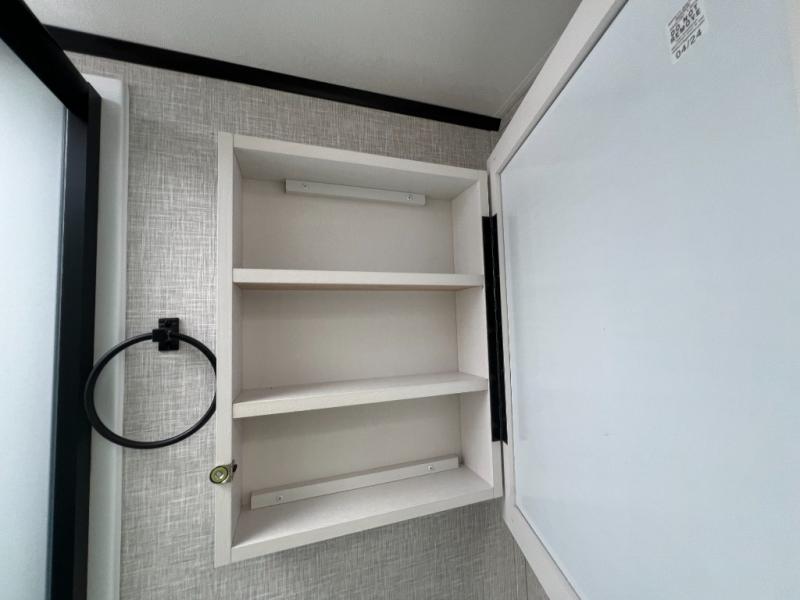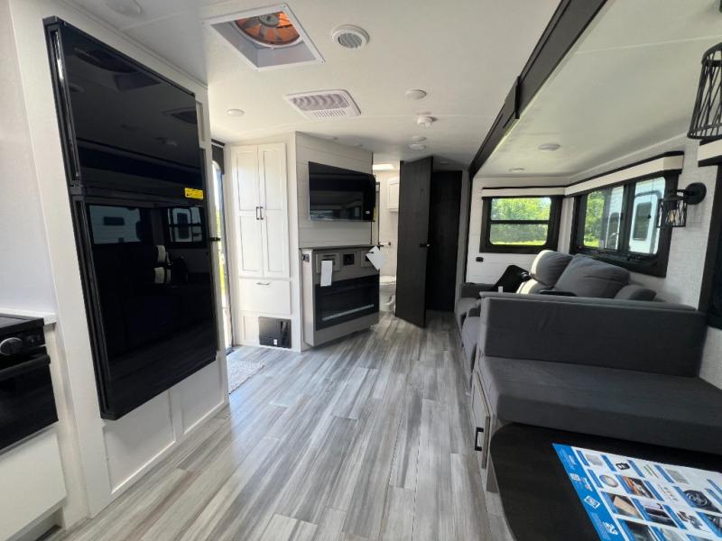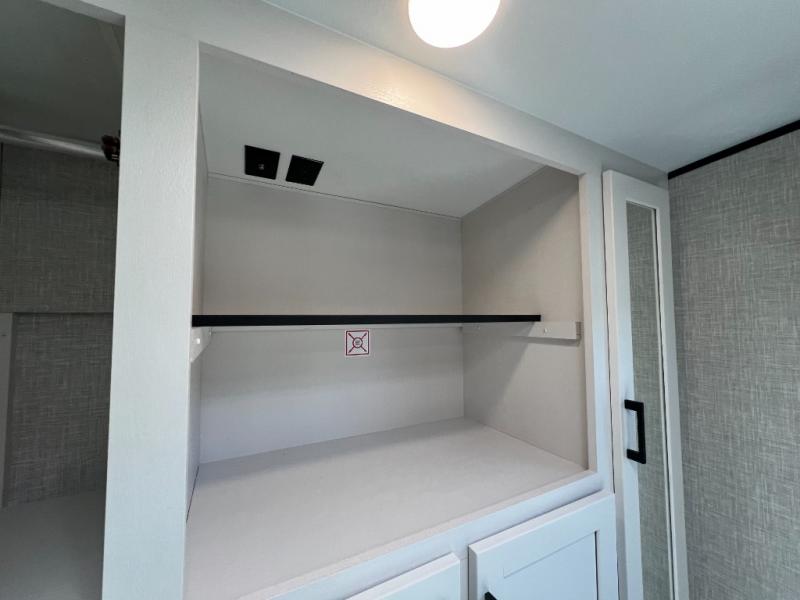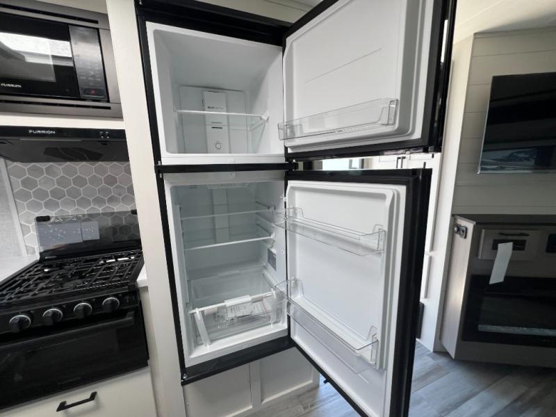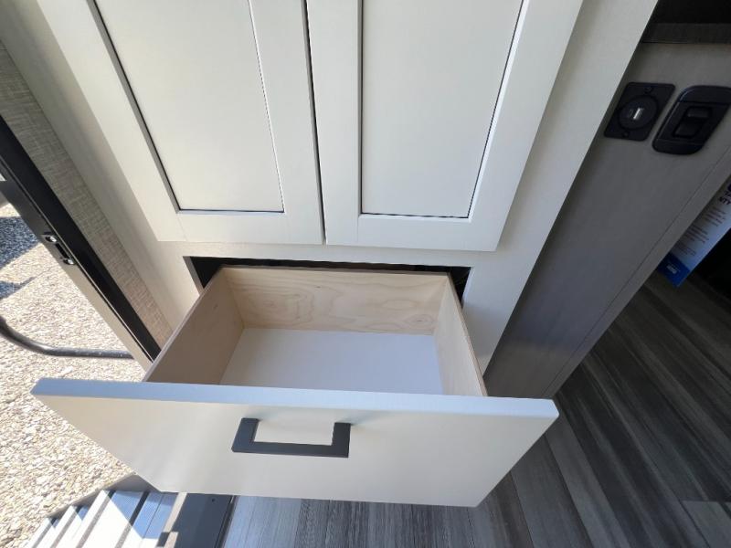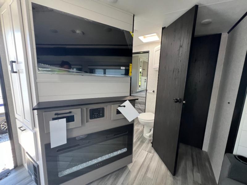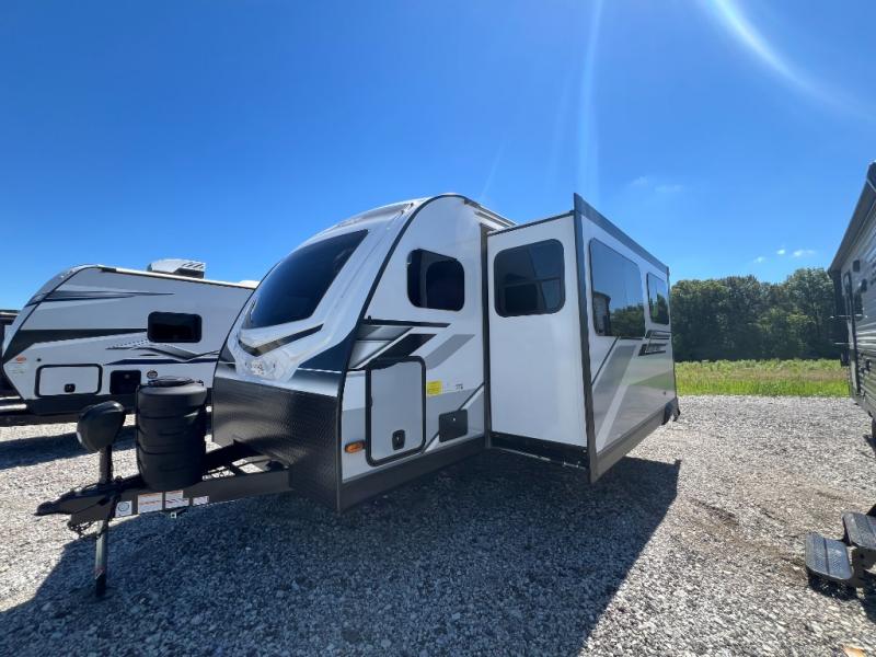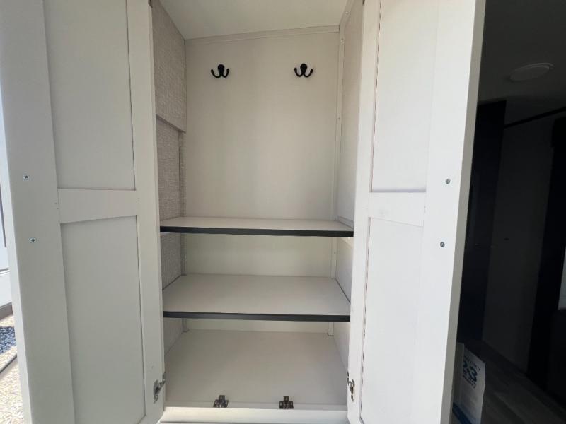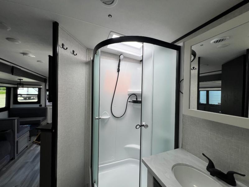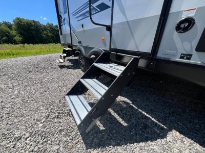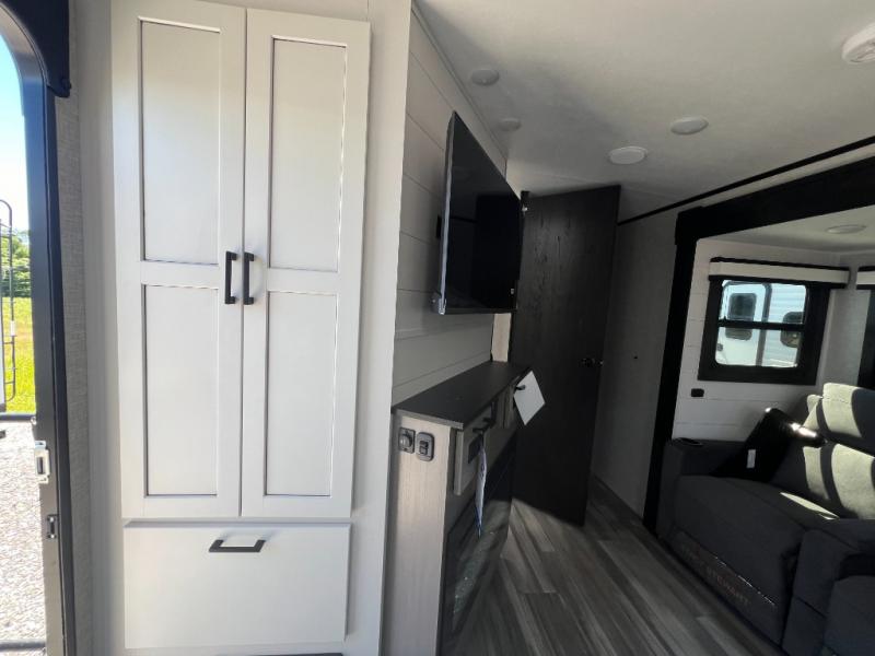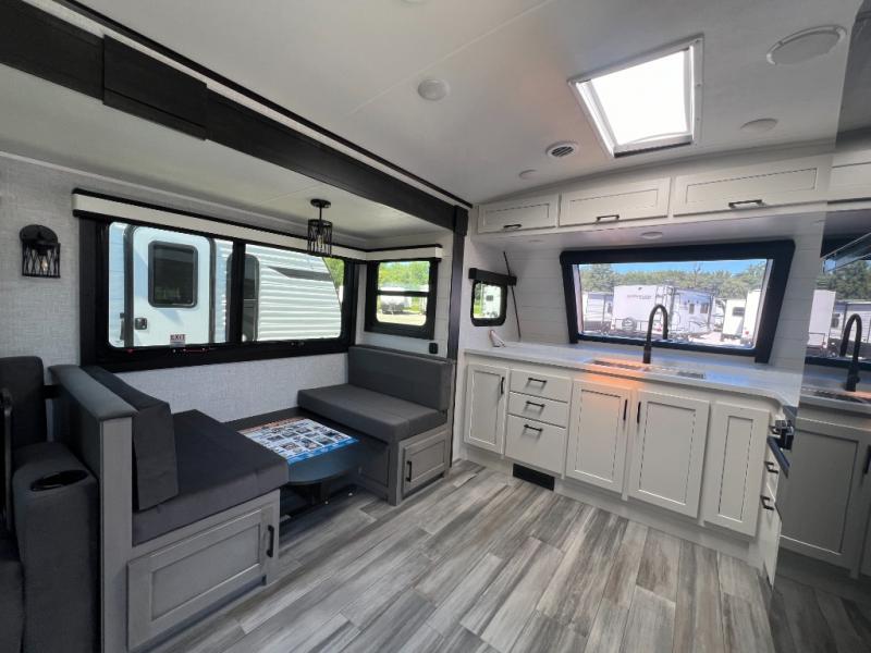 You will experience a smooth flow of traffic in and out of this travel trailer with dual entry doors! The rear private bedroom has one of the entrance/exit doors so you can sneak out for an early morning fishing trip, a queen bed slide for more space, and a wardrobe for your clothes. The full bathroom has a radius shower to clean up in and handy storage areas like a linen closet, a medicine cabinet, and a shelf. Grab a snack from one of the two pantries and head to the theater seating with swivel tables across from the entertainment center for a relaxing movie night. The chef will love cooking in the front kitchen with all of the countertop space and three burner cooktop. It comes standard with a booth dinette, but you can switch it out for the optional table and two chairs with ottoman or the optional table and four chairs.