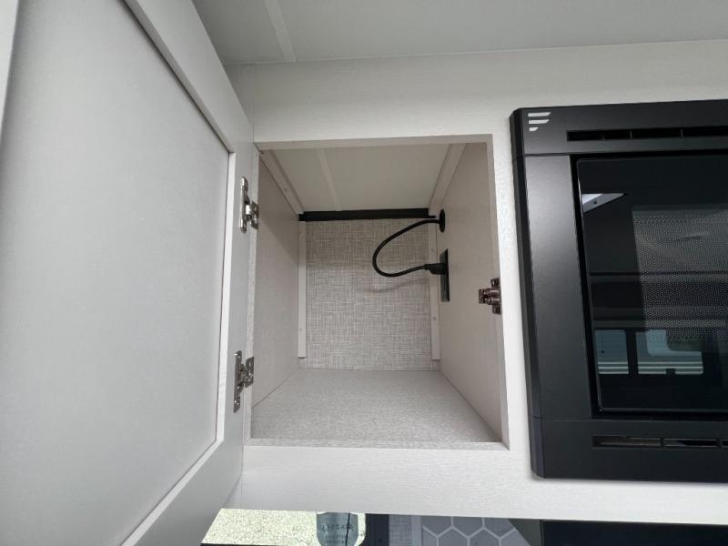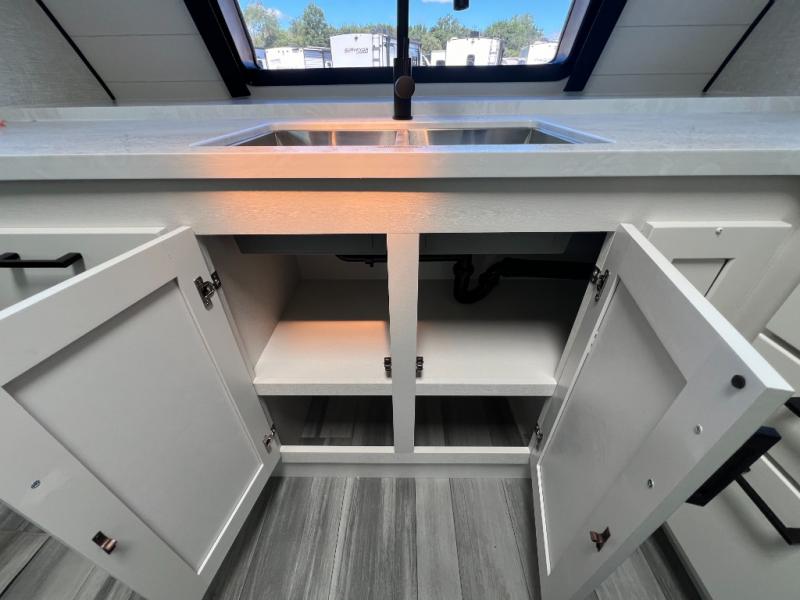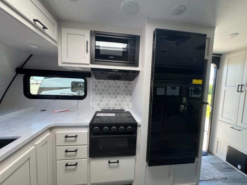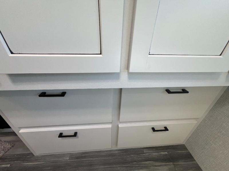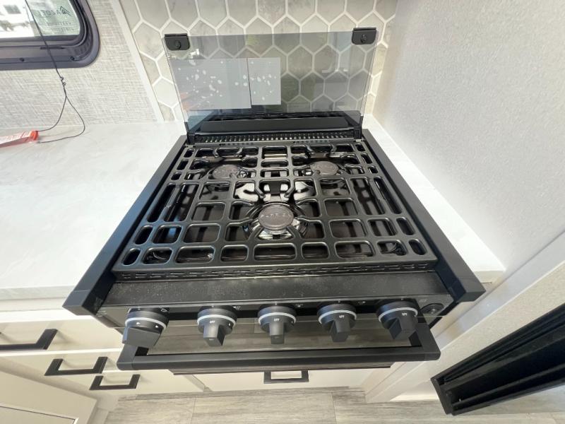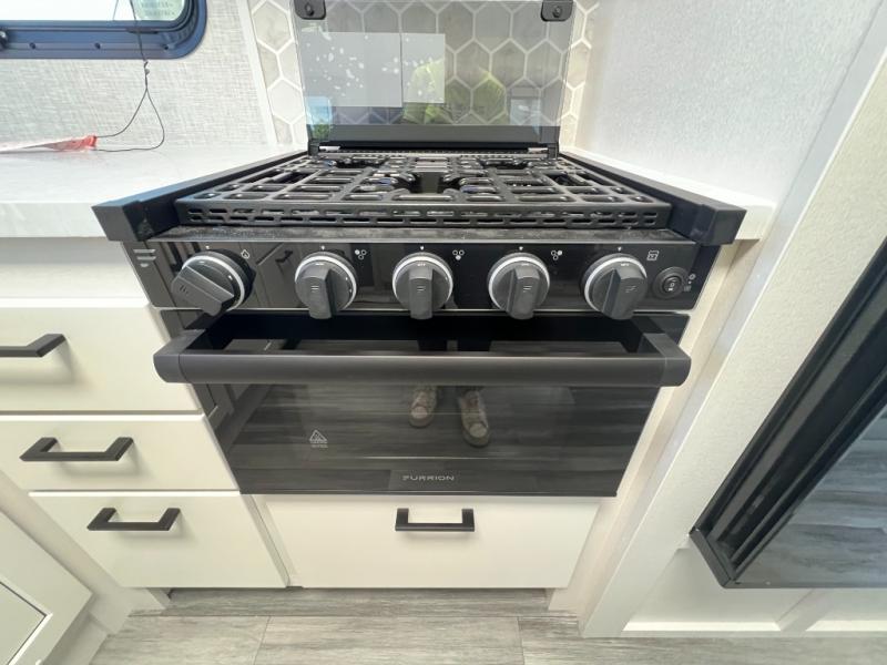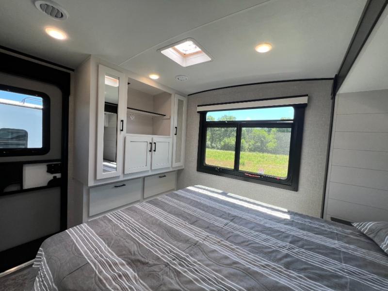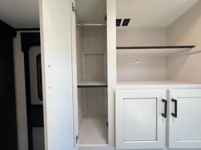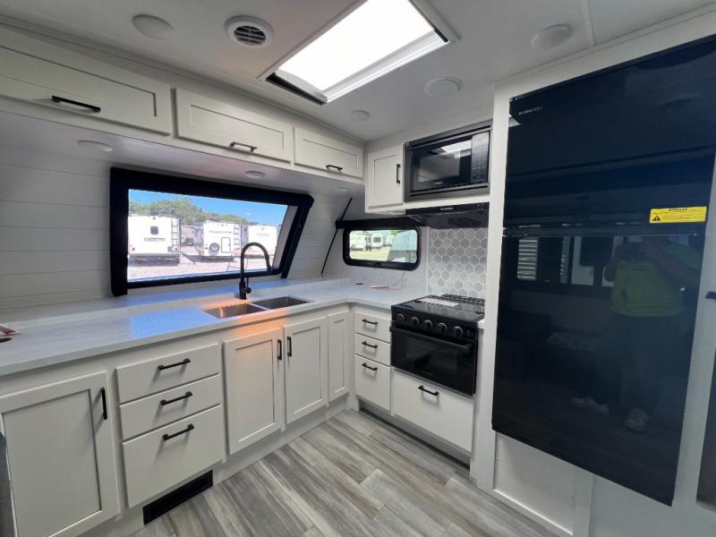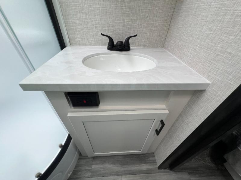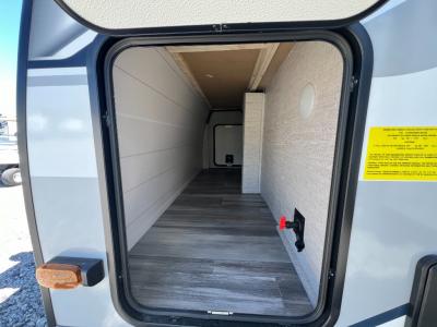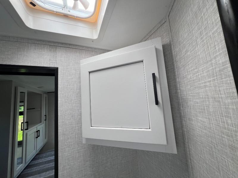 You will experience a smooth flow of traffic in and out of this travel trailer with dual entry doors! The rear private bedroom has one of the entrance/exit doors so you can sneak out for an early morning fishing trip, a queen bed slide for more space, and a wardrobe for your clothes. The full bathroom has a radius shower to clean up in and handy storage areas like a linen closet, a medicine cabinet, and a shelf. Grab a snack from one of the two pantries and head to the theater seating with swivel tables across from the entertainment center for a relaxing movie night. The chef will love cooking in the front kitchen with all of the countertop space and three burner cooktop. It comes standard with a booth dinette, but you can switch it out for the optional table and two chairs with ottoman or the optional table and four chairs.
