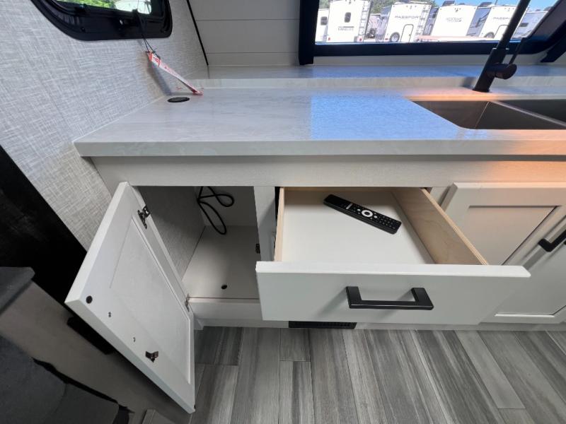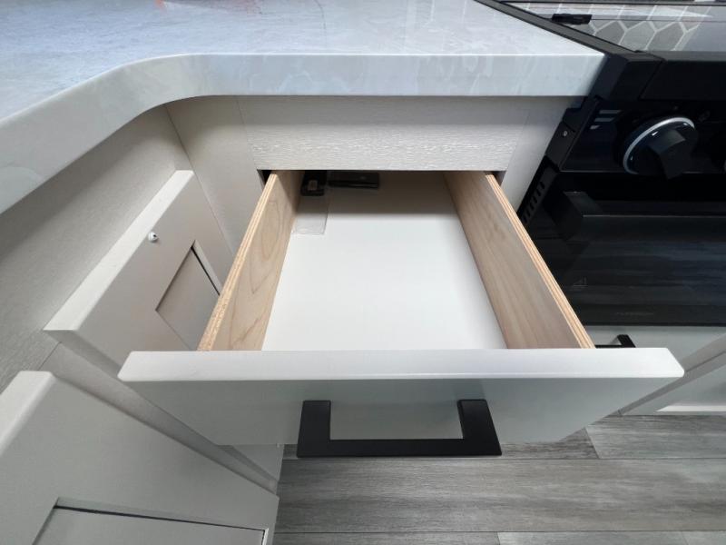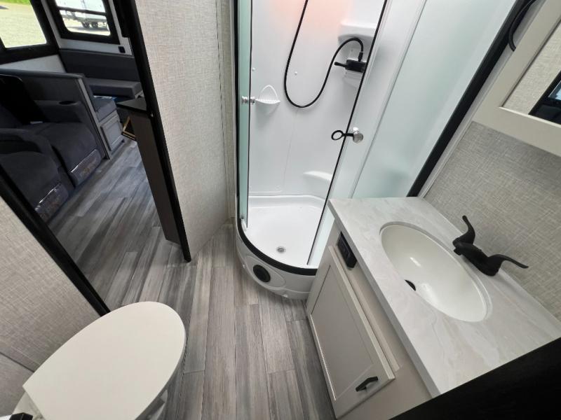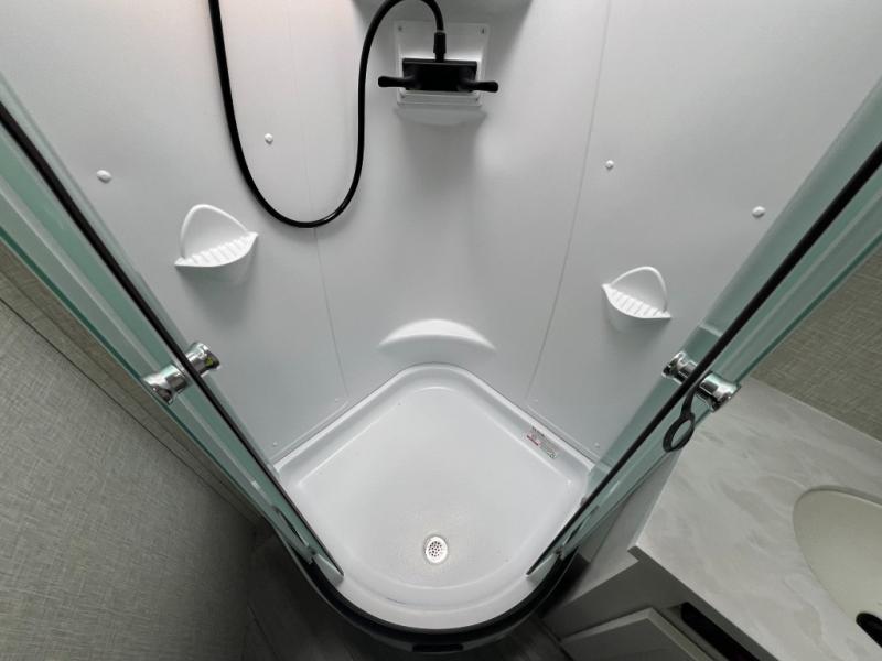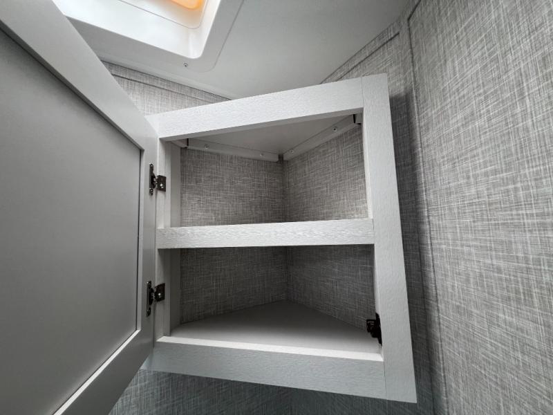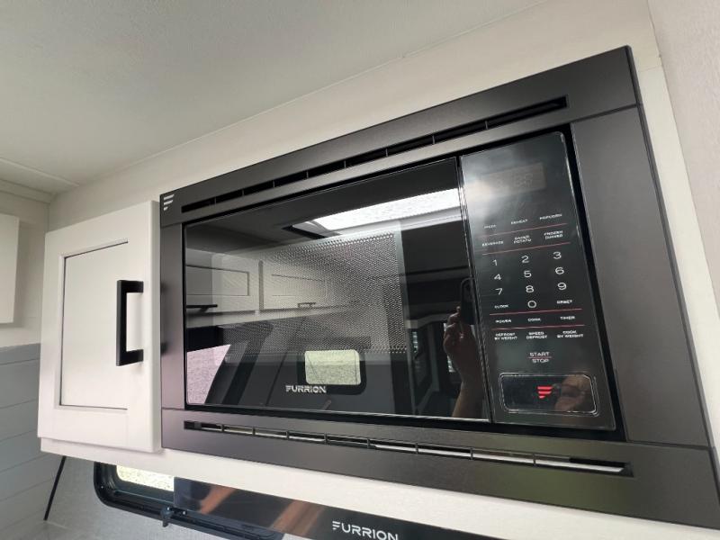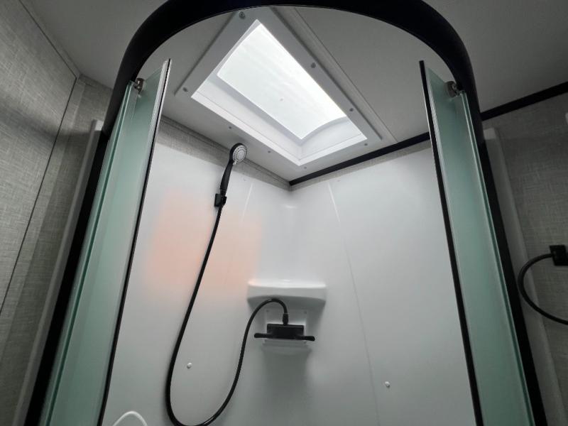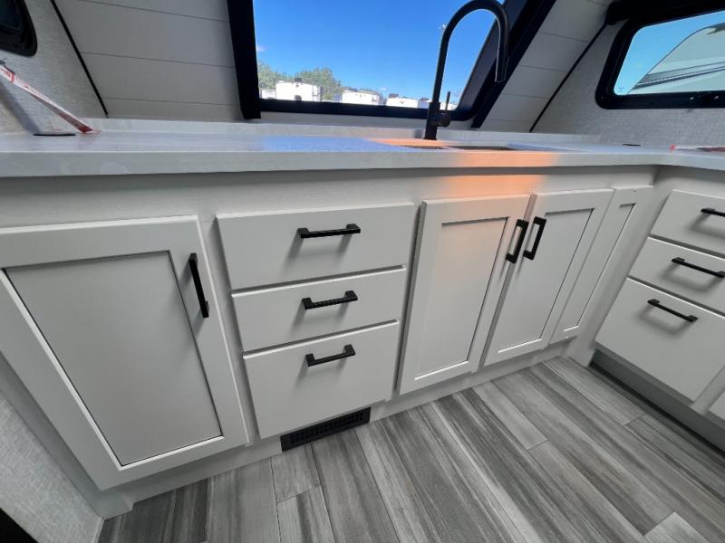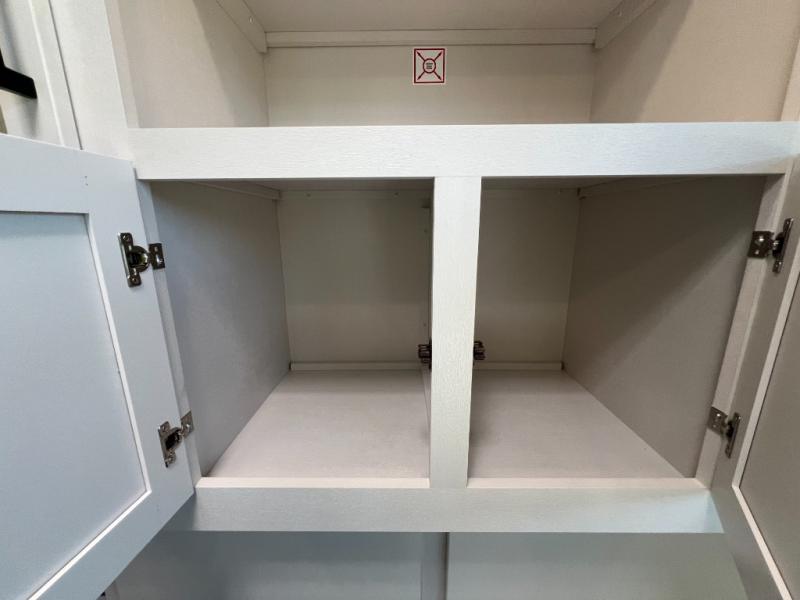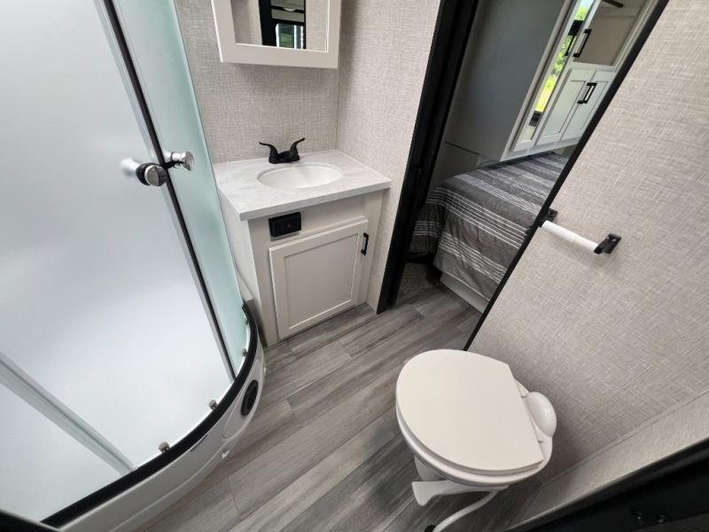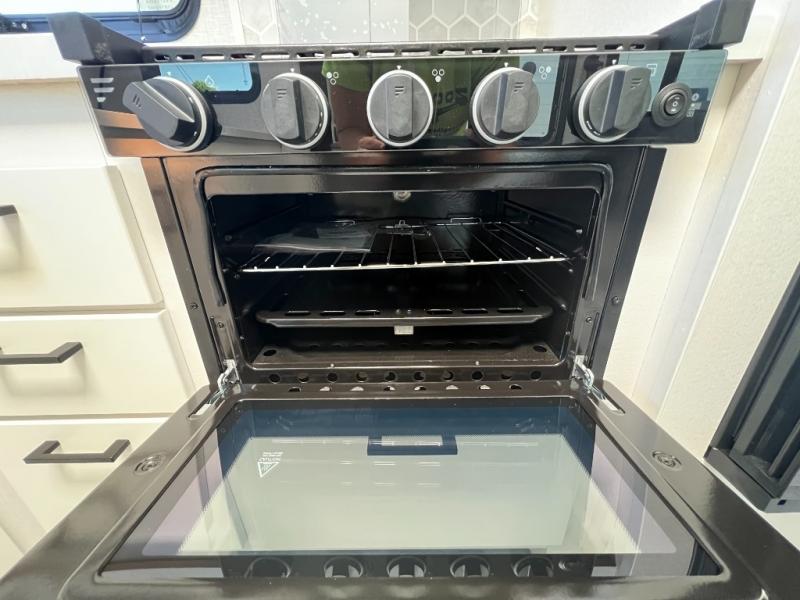 You will experience a smooth flow of traffic in and out of this travel trailer with dual entry doors! The rear private bedroom has one of the entrance/exit doors so you can sneak out for an early morning fishing trip, a queen bed slide for more space, and a wardrobe for your clothes. The full bathroom has a radius shower to clean up in and handy storage areas like a linen closet, a medicine cabinet, and a shelf. Grab a snack from one of the two pantries and head to the theater seating with swivel tables across from the entertainment center for a relaxing movie night. The chef will love cooking in the front kitchen with all of the countertop space and three burner cooktop. It comes standard with a booth dinette, but you can switch it out for the optional table and two chairs with ottoman or the optional table and four chairs.