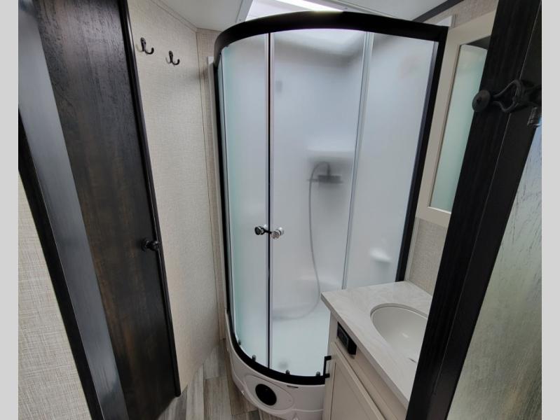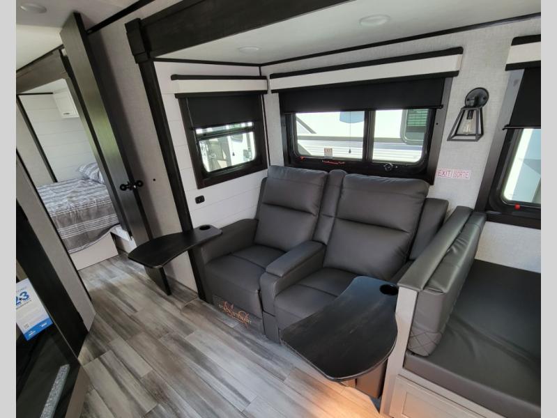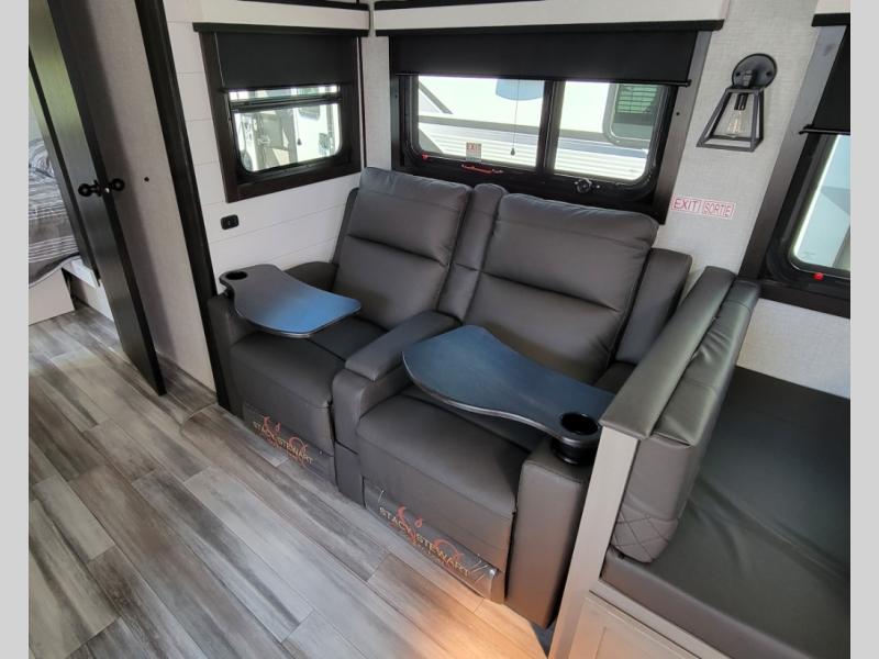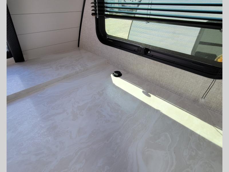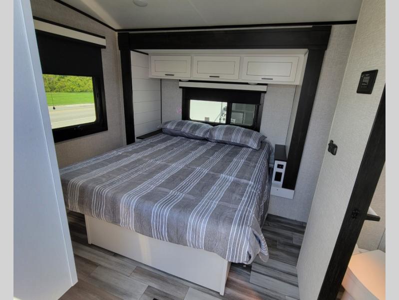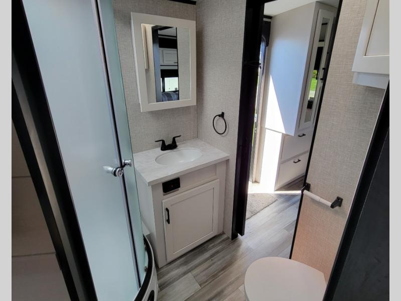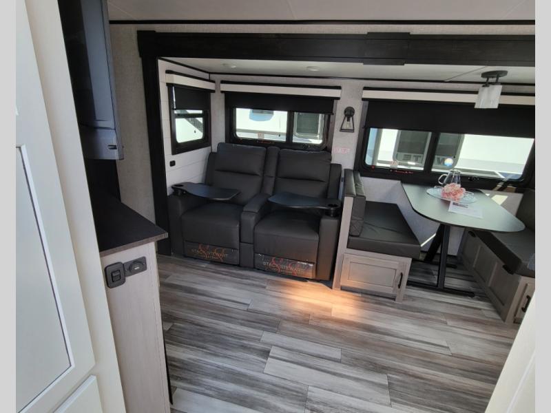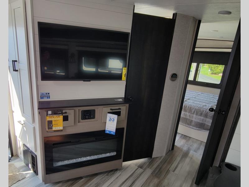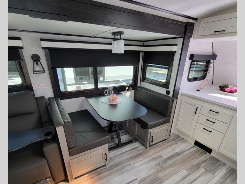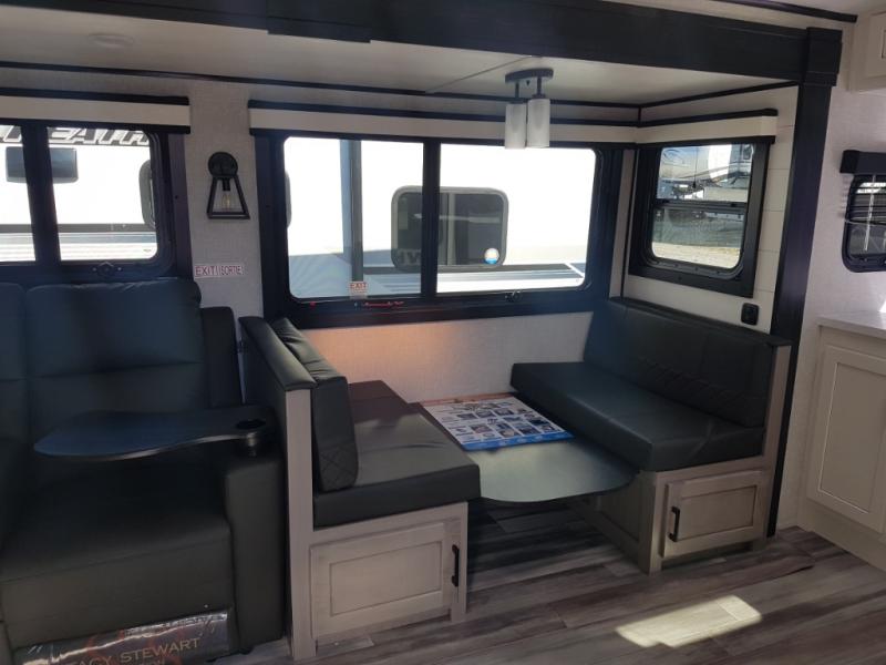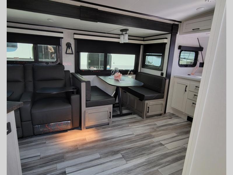 You will experience a smooth flow of traffic in and out of this travel trailer with dual entry doors! The rear private bedroom has one of the entrance/exit doors so you can sneak out for an early morning fishing trip, a queen bed slide for more space, and a wardrobe for your clothes. The full bathroom has a radius shower to clean up in and handy storage areas like a linen closet, a medicine cabinet, and a shelf. Grab a snack from one of the two pantries and head to the theater seating with swivel tables across from the entertainment center for a relaxing movie night. The chef will love cooking in the front kitchen with all of the countertop space and three burner cooktop. It comes standard with a booth dinette, but you can switch it out for the optional table and two chairs with ottoman or the optional table and four chairs.