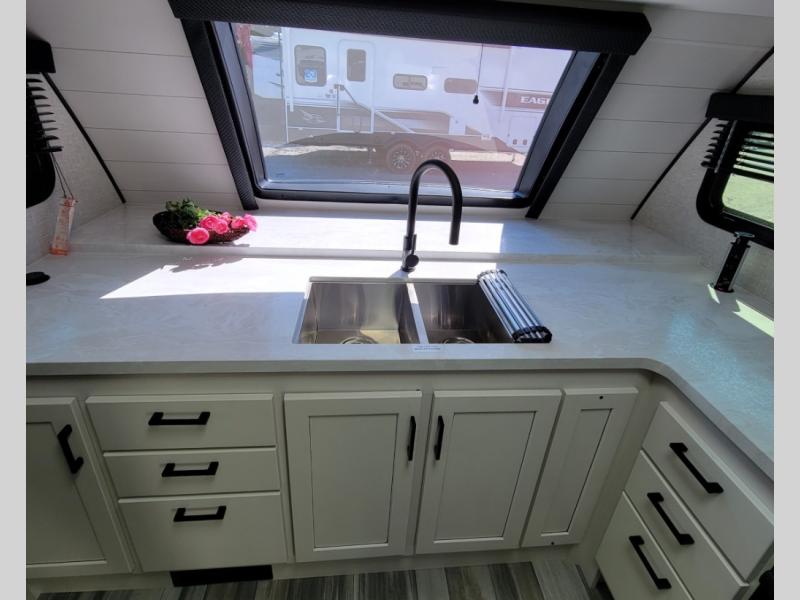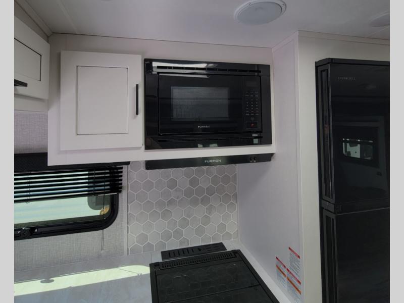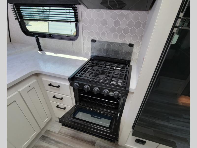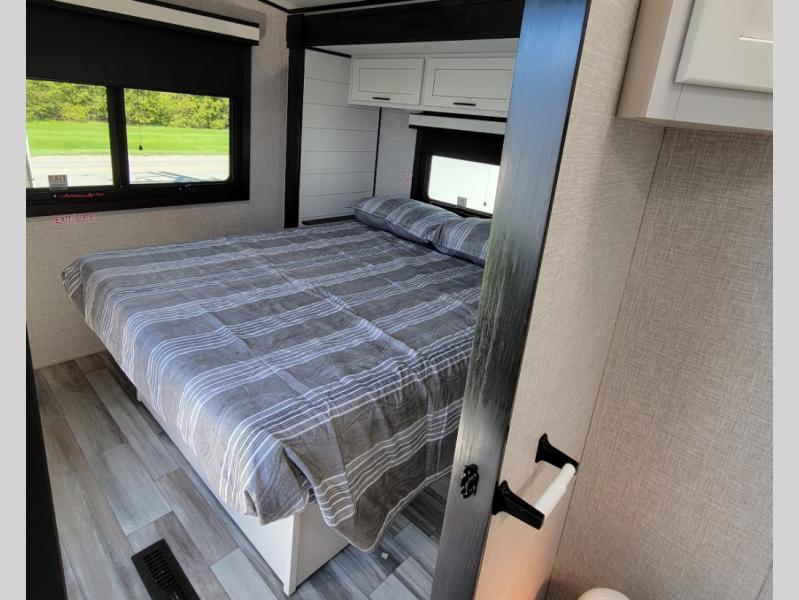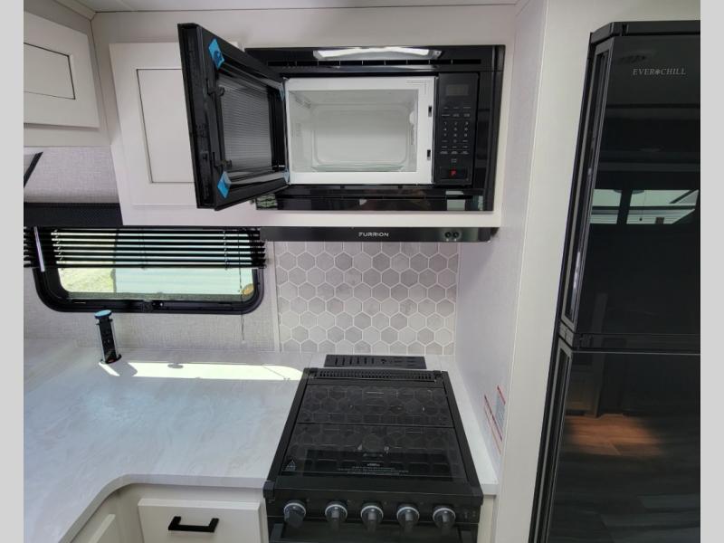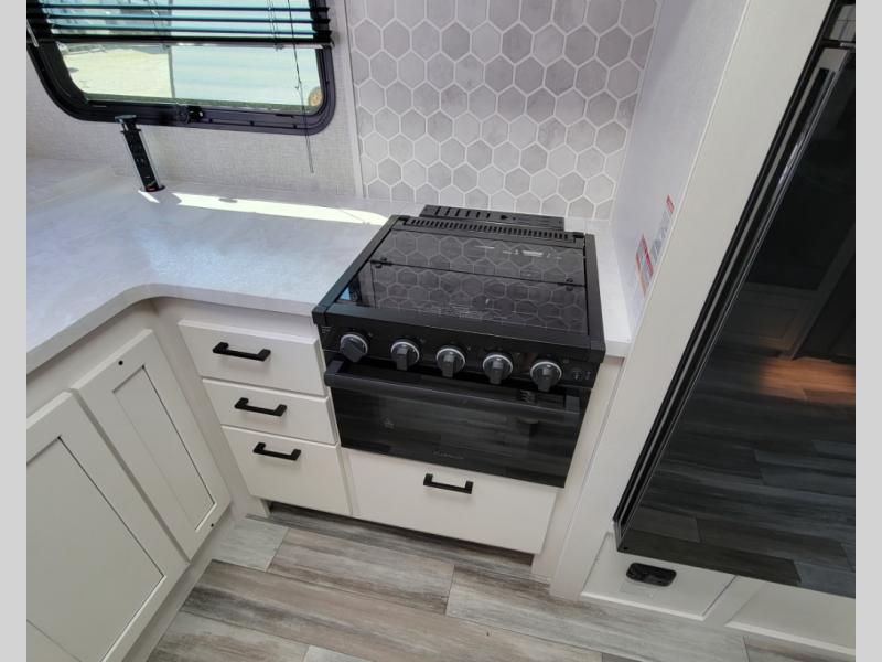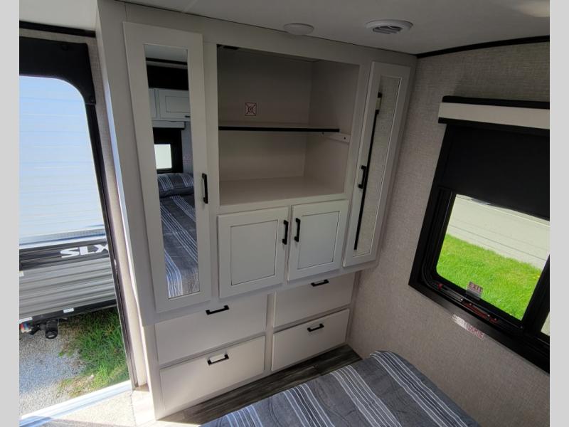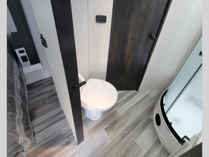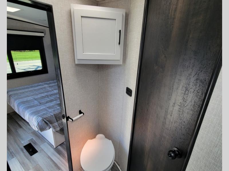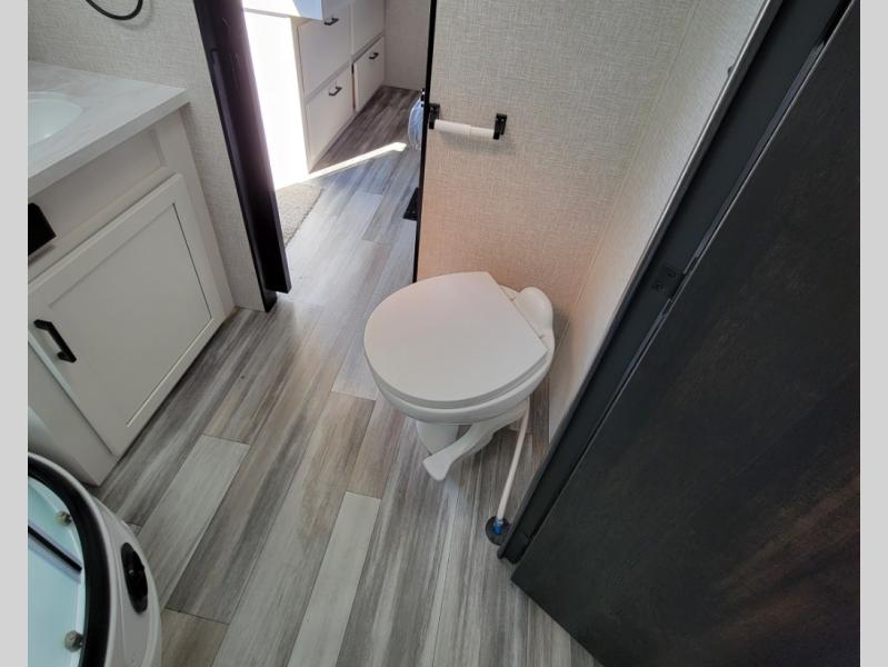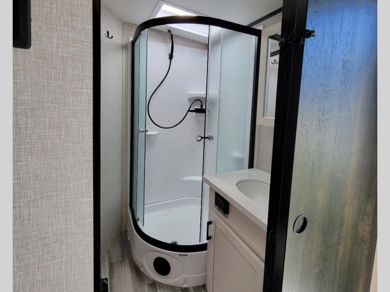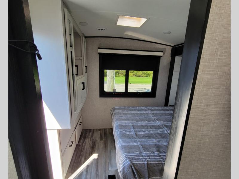 You will experience a smooth flow of traffic in and out of this travel trailer with dual entry doors! The rear private bedroom has one of the entrance/exit doors so you can sneak out for an early morning fishing trip, a queen bed slide for more space, and a wardrobe for your clothes. The full bathroom has a radius shower to clean up in and handy storage areas like a linen closet, a medicine cabinet, and a shelf. Grab a snack from one of the two pantries and head to the theater seating with swivel tables across from the entertainment center for a relaxing movie night. The chef will love cooking in the front kitchen with all of the countertop space and three burner cooktop. It comes standard with a booth dinette, but you can switch it out for the optional table and two chairs with ottoman or the optional table and four chairs.
