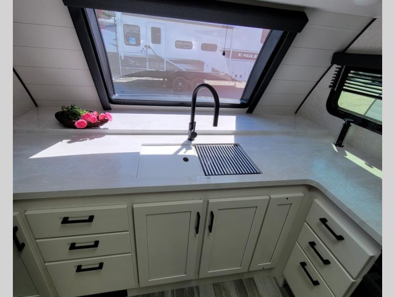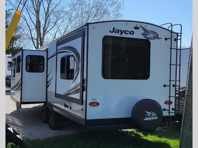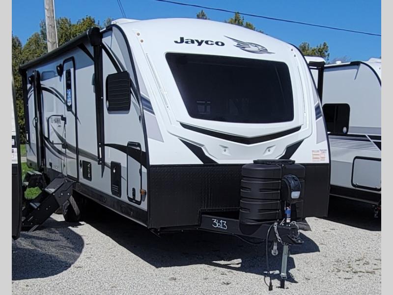 The lightweight White Hawk travel trailers by Jayco will blow you away with their roomy interiors, luxurious amenities, and durable construction. The Magnum Truss Roof System can withstand 50% more weight than the competition, and the Stronghold VBL lamination is the lightest, yet strongest in the industry. Each model includes American-made Goodyear tires with self-adjusting brakes, dark tinted, frameless safety glass windows, and modern graphics package with dual-colored sidewalls for a sleek look. The White Hawk travel trailers also include a barreled interior ceiling with up to 81" of interior height, an electric fireplace, decorative kitchen backsplash, plus many more interior comforts!