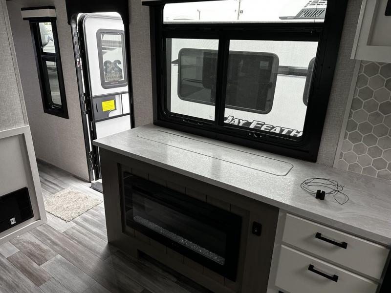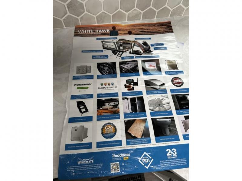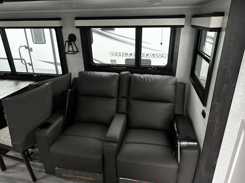 The lightweight White Hawk travel trailers by Jayco will blow you away with their roomy interiors, luxurious amenities, and durable construction. The Magnum Truss Roof System can withstand 50% more weight than the competition, and the Stronghold VBL lamination is the lightest, yet strongest in the industry. Each model includes American-made Goodyear tires with self-adjusting brakes, dark tinted, frameless safety glass windows, and modern graphics package with dual-colored sidewalls for a sleek look. The White Hawk travel trailers also include a barreled interior ceiling with up to 81" of interior height, an electric fireplace, decorative kitchen backsplash, plus many more interior comforts!