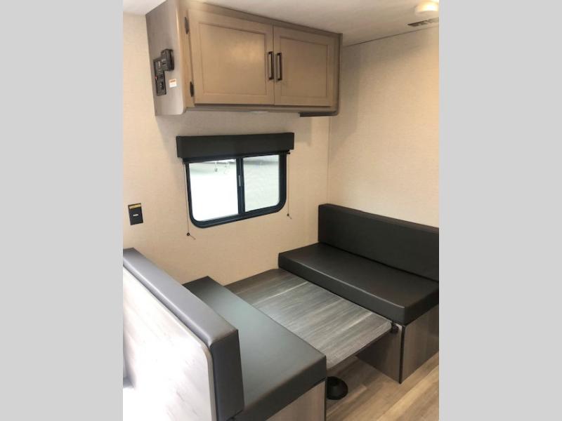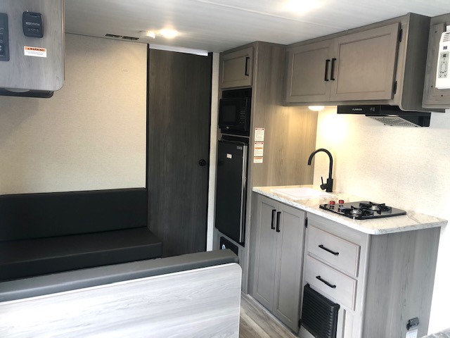 It's time to enjoy the great outdoors with family and friends at the campgrounds you like to meet everyone at! This trailer will allow three to four to camp comfortability with amenities such as a two burner cooktop, a 3.3 cu. ft. refrigerator, and a spacious rear full bathroom. The booth dinette offers a place to dine, read a book and even house an overnight guest. This model also includes a walk-around queen bed that will make your space feel a little more like home!