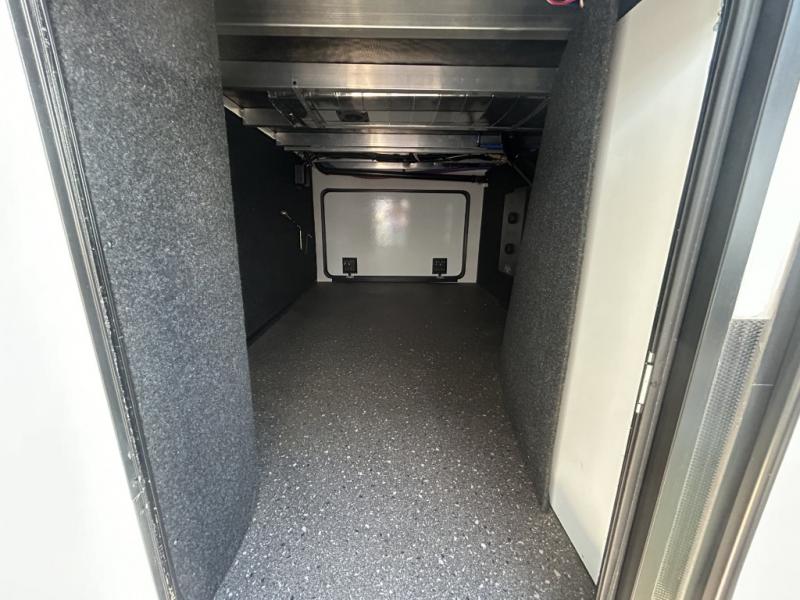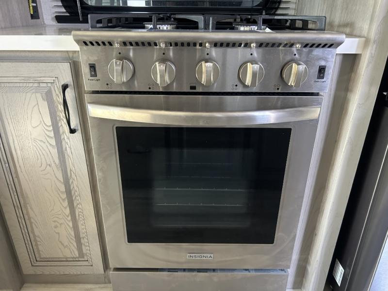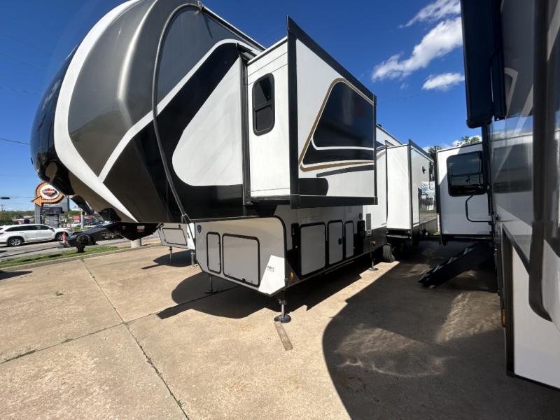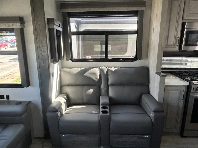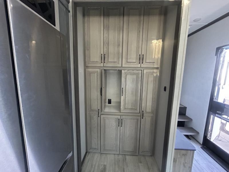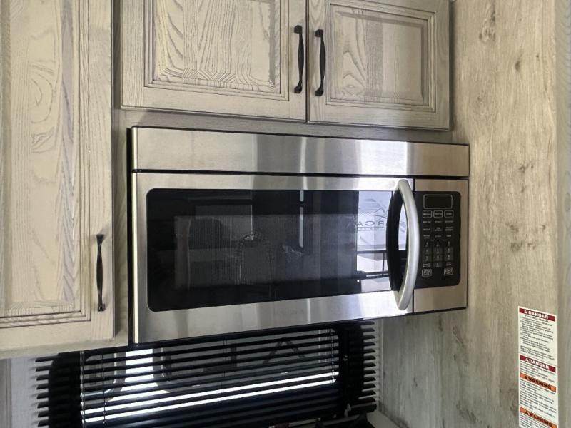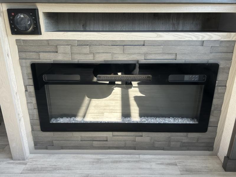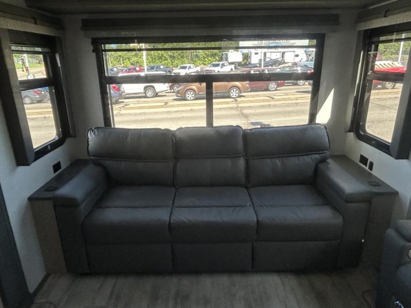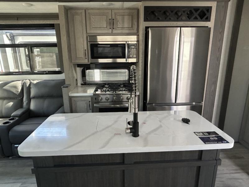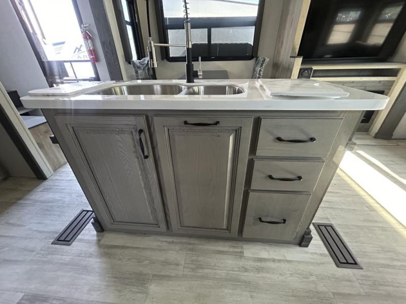 A great coach for an adventurous couple that loves to travel. This Alpine fifth wheel features wide open spaces thanks to triple slides with dual opposing slides in the main combined living and kitchen area. A center island with sink is great for prep work. You can easily entertain and have overnight guests with a hide-a-bed sofa sleeper. There is also an entertainment center with fireplace to enjoy when inside, and theater seating opposite for movie night. In the kitchen, you will find a convection microwave oven above the stove, a large walk-in pantry, and a free standing dinette within the curbside slide. Head up to the master suite which features a dual entry bath including a linen cabinet and large shower, plus a king bed that slides out and includes storage space underneath for extra blankets as well as a large master closet that has been prepped for a stackable washer and dryer if you choose to add. You will also find a dresser and a Smart HDTV. On the outside, a grill-n-chill outside kitchen plus refrigerator for entertaining and dining beneath one of two awnings that provide extra living space and protection from the elements.